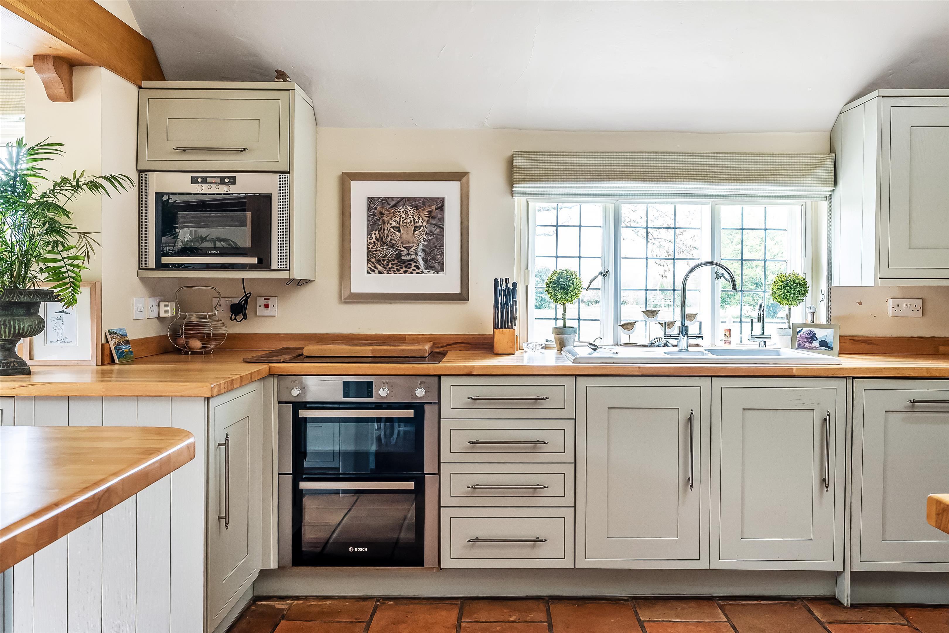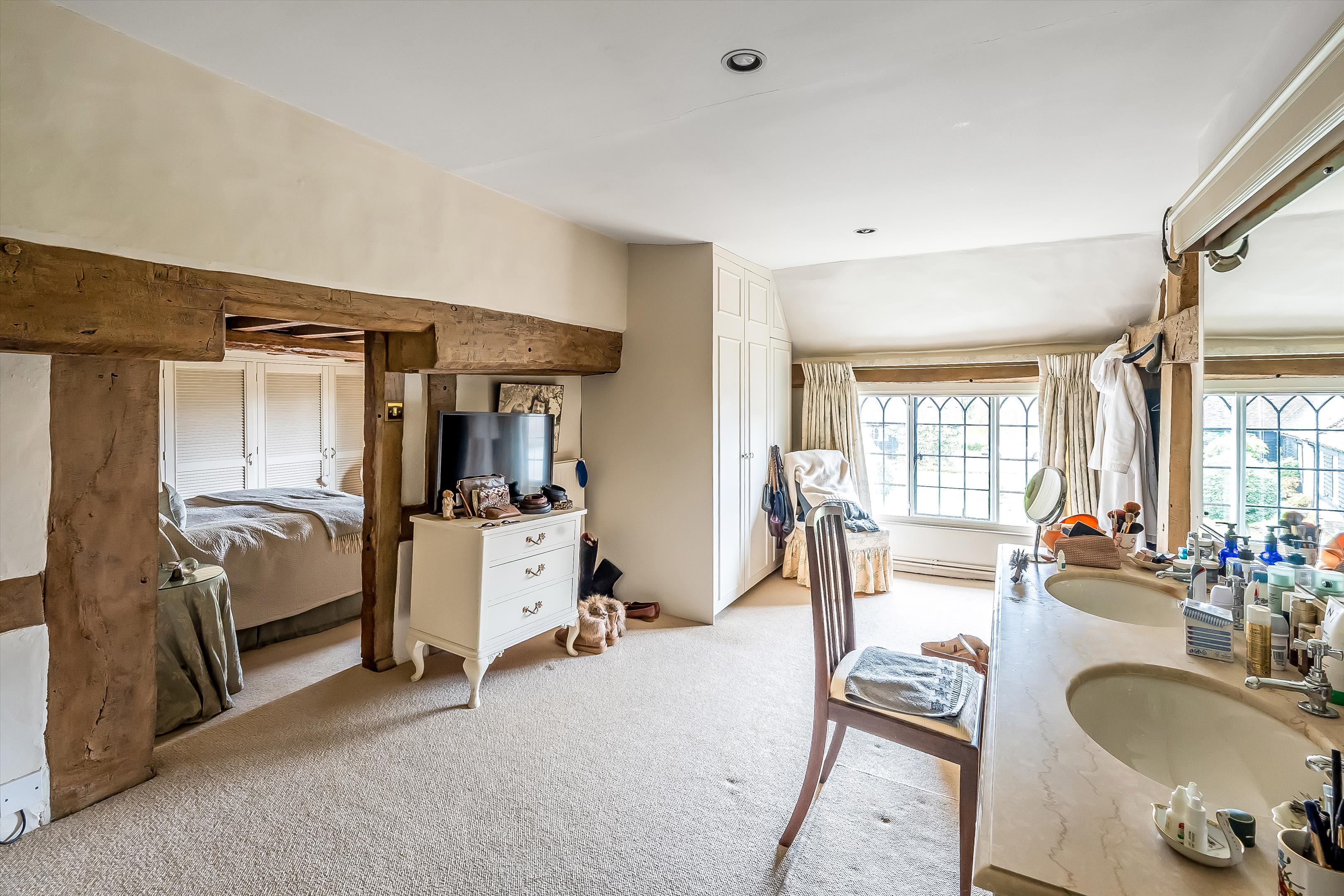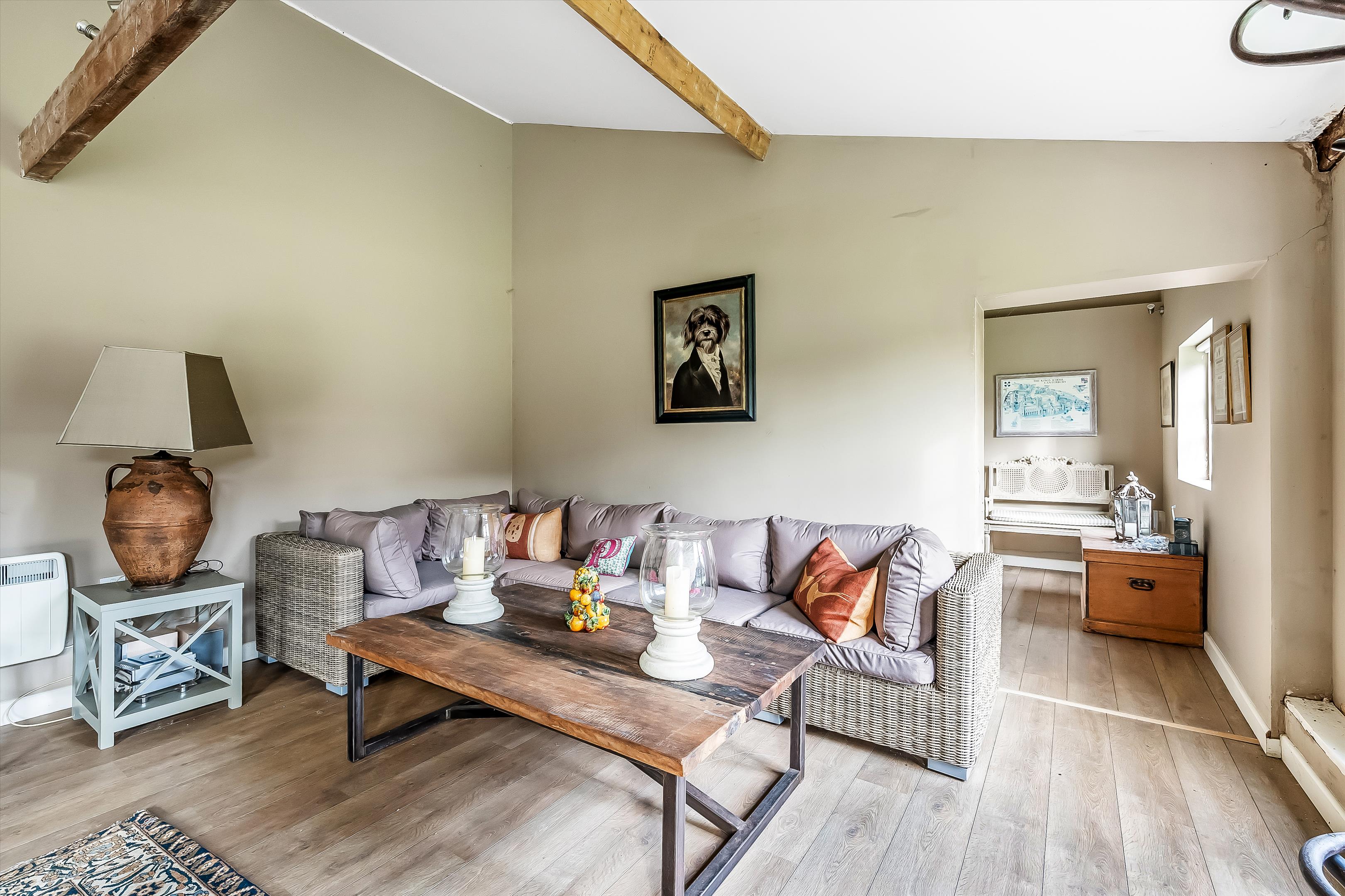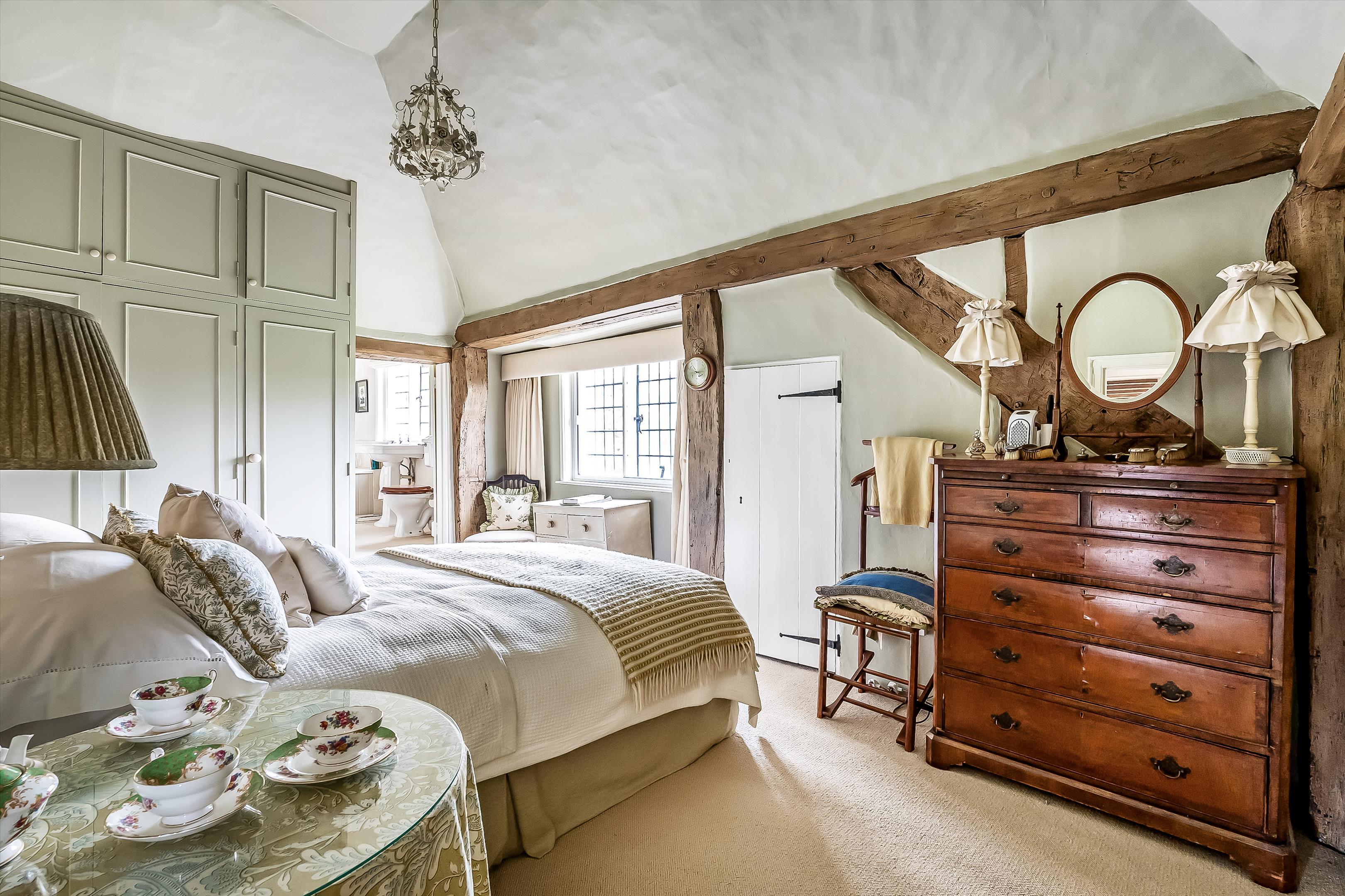 The property showcases wonderful period features, including a red-brick inglenook fireplace and original exposed beams throughout.