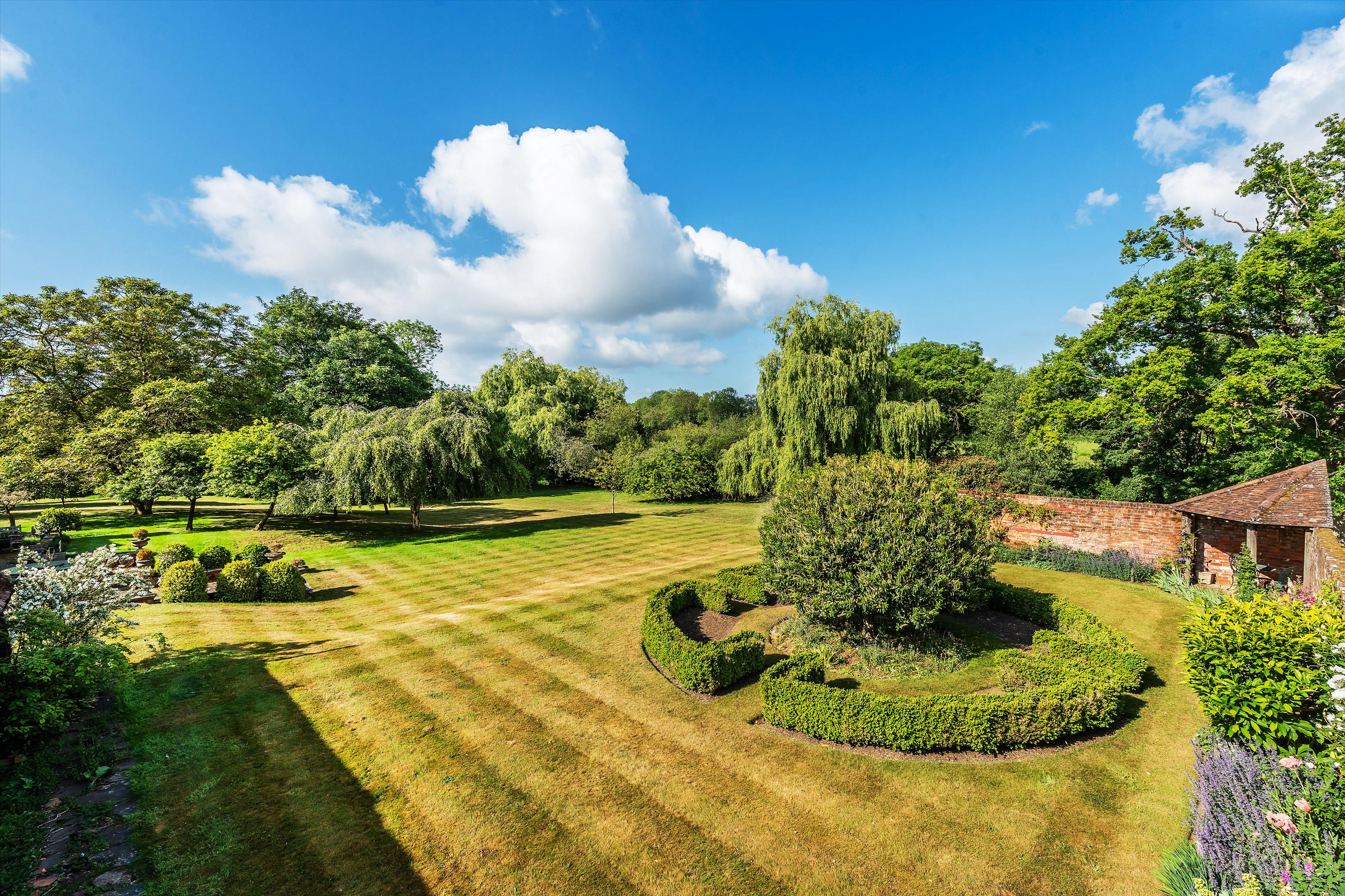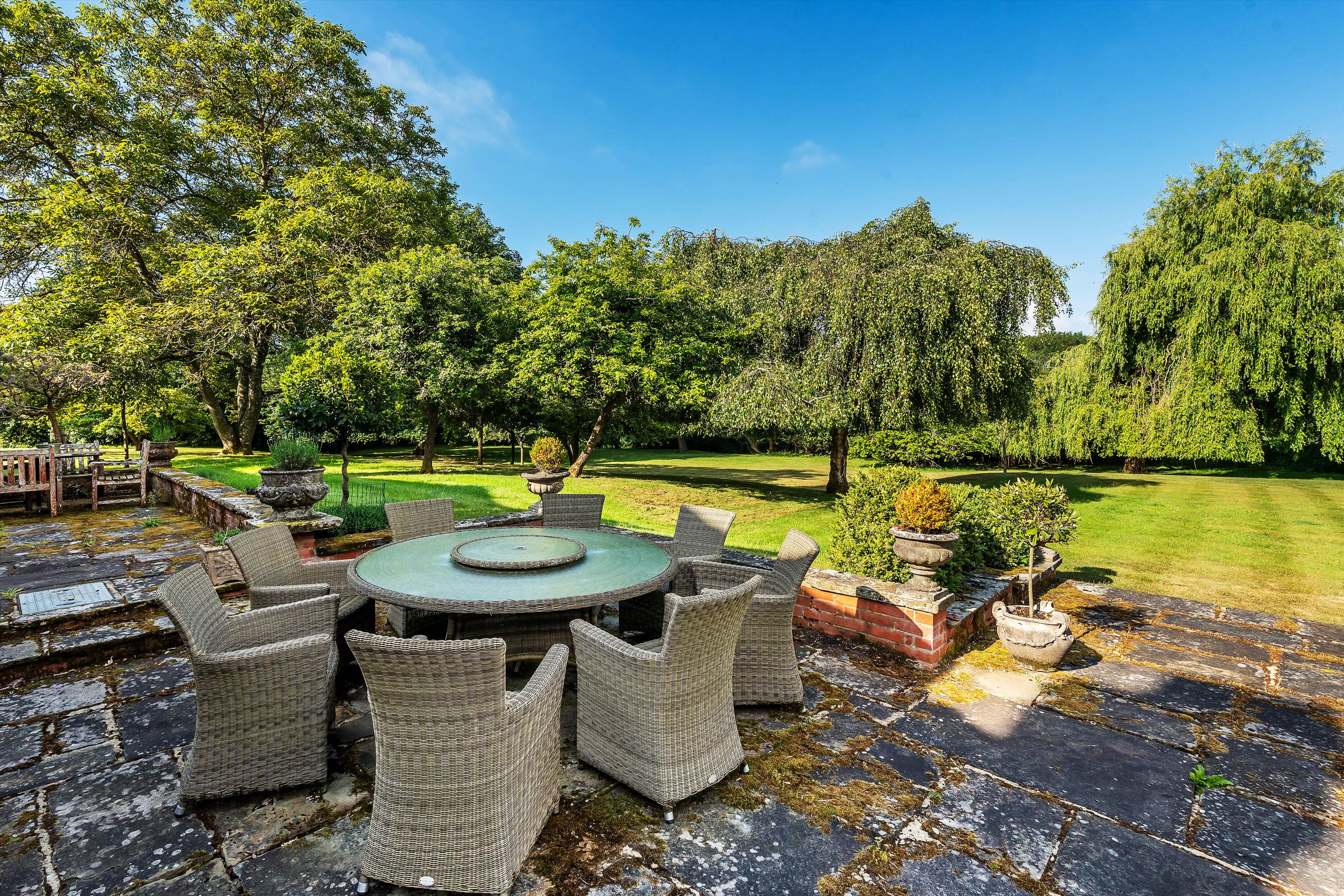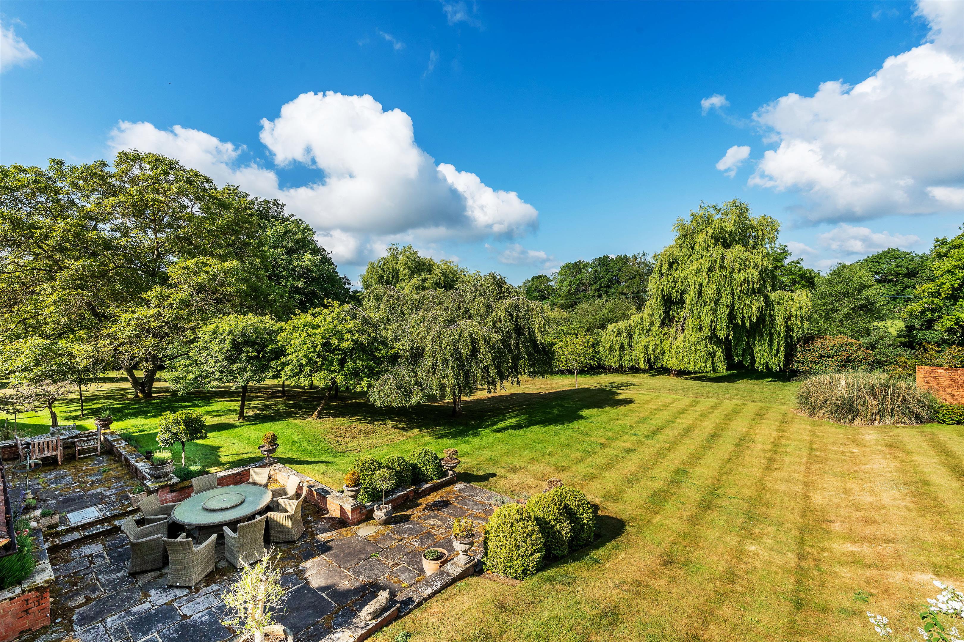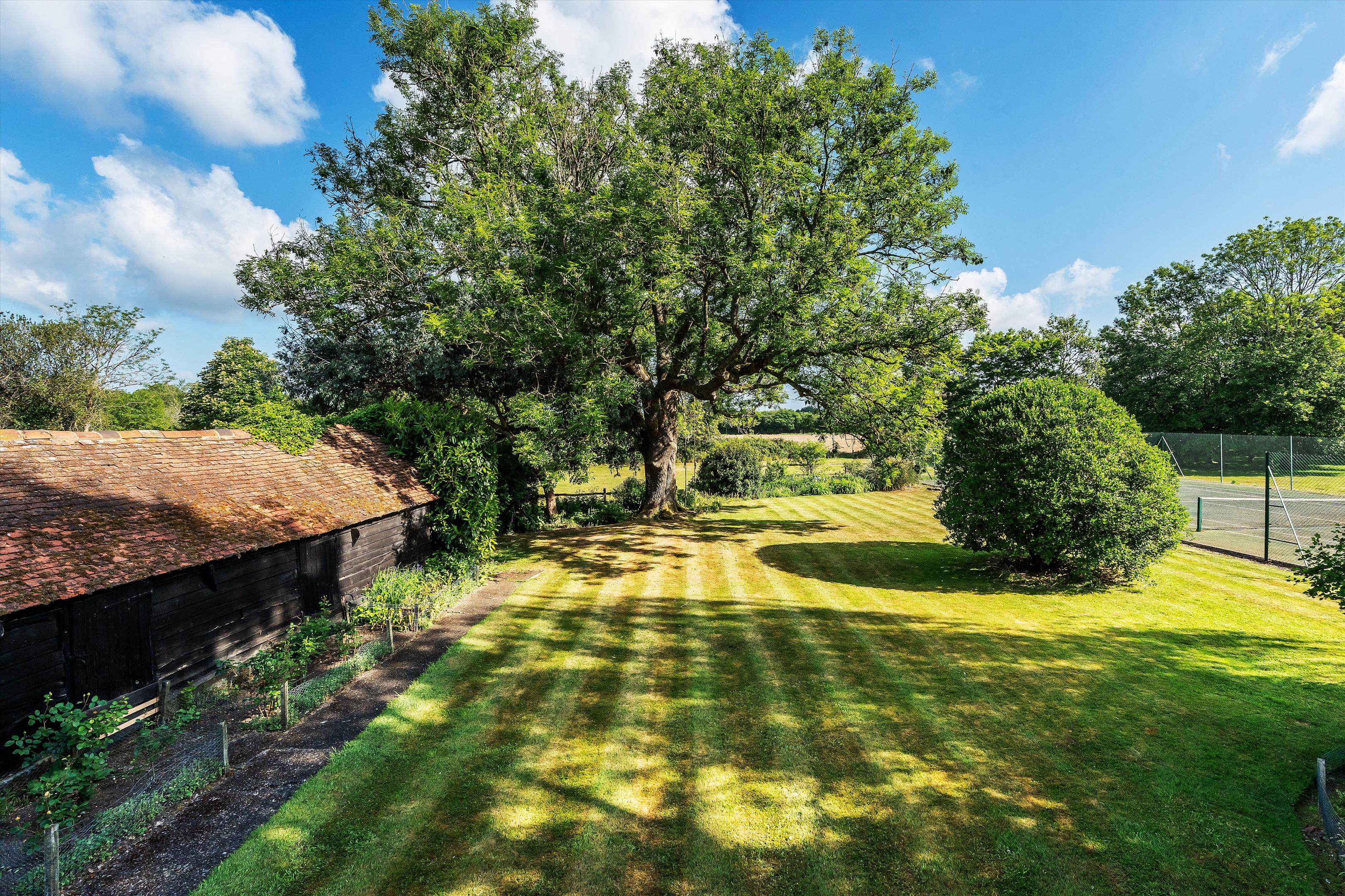 The house sits centrally within its plot of over 4.5 acres and is enveloped by mature gardens featuring a red-brick period wall, elegant willow trees, and immaculately maintained borders and box hedging. To the rear of the house is a large west-facing York stone terrace, perfect for entertaining, while on the north side of the garden there is a well-kept tennis court.