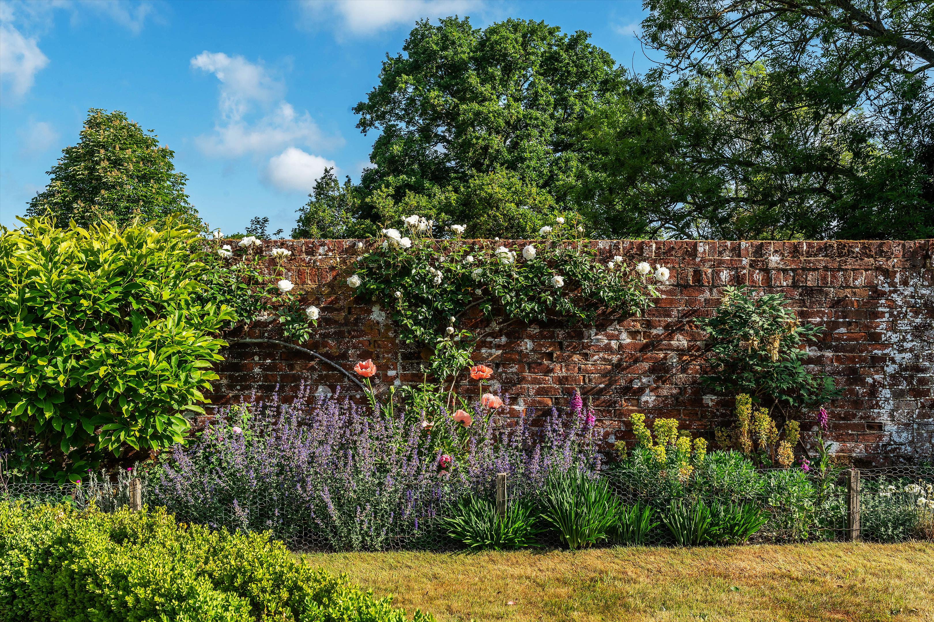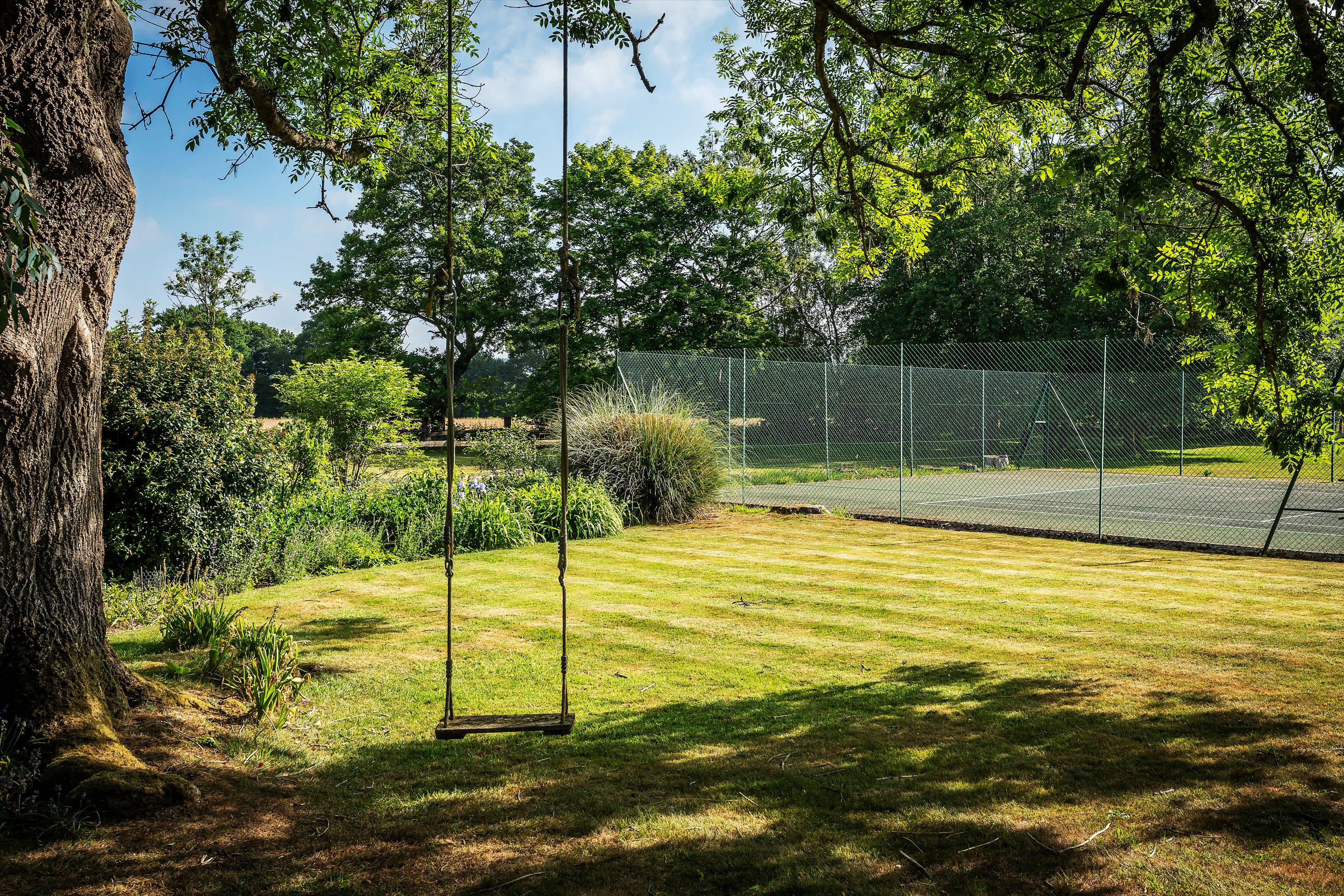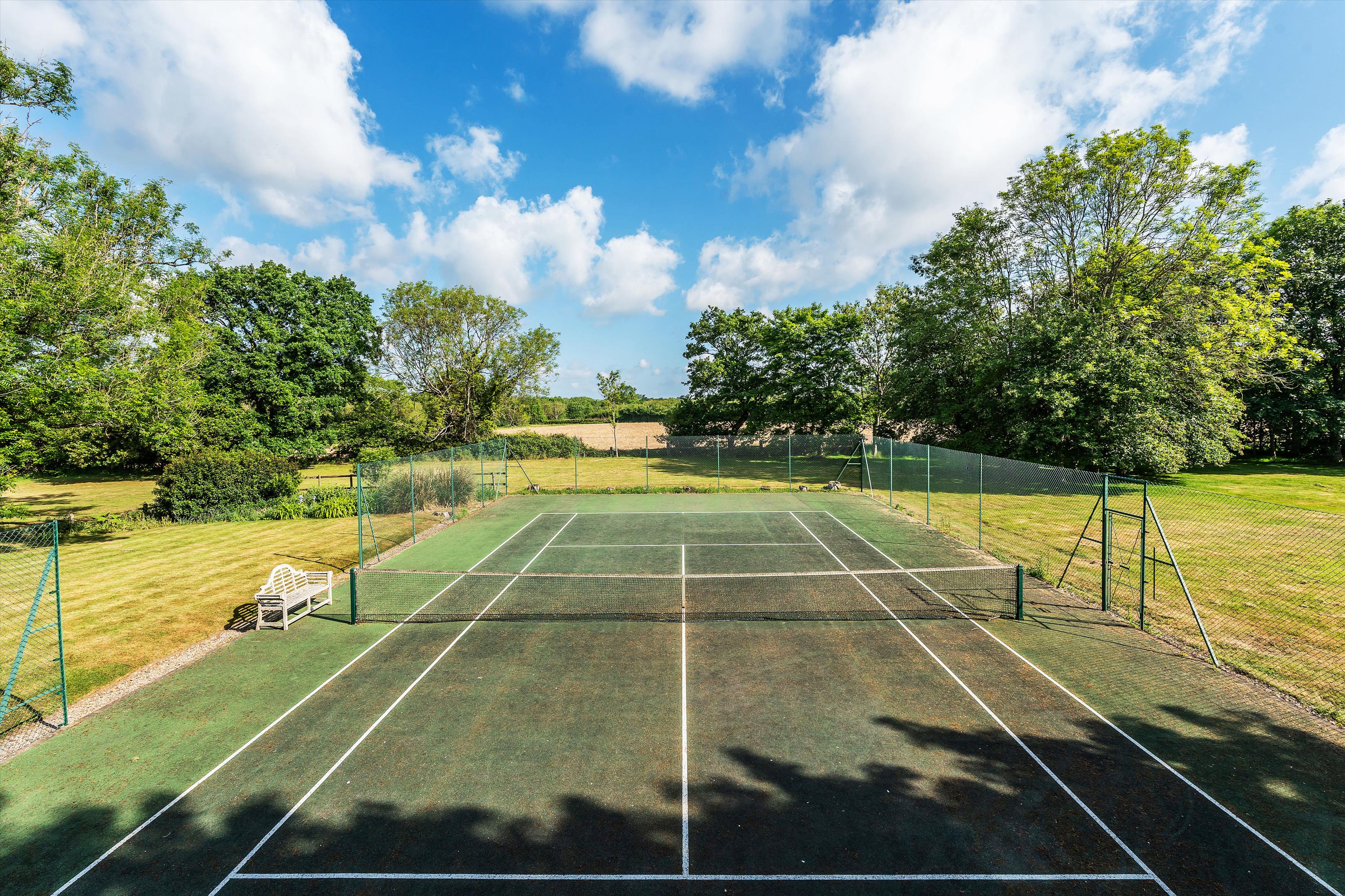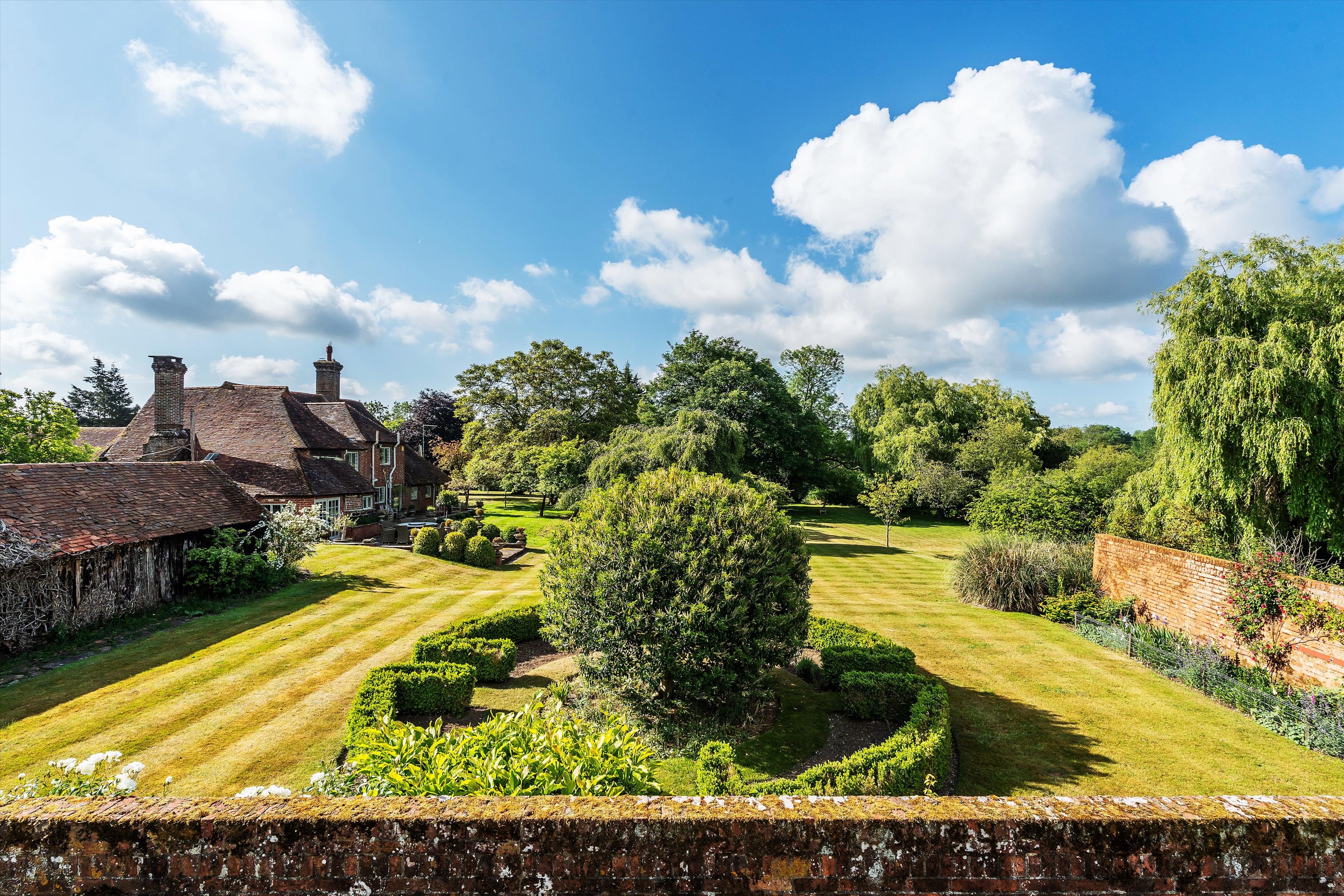 The house sits centrally within its plot of over 4.5 acres and is enveloped by mature gardens featuring a red-brick period wall, elegant willow trees, and immaculately maintained borders and box hedging. To the rear of the house is a large west-facing York stone terrace, perfect for entertaining, while on the north side of the garden there is a well-kept tennis court.