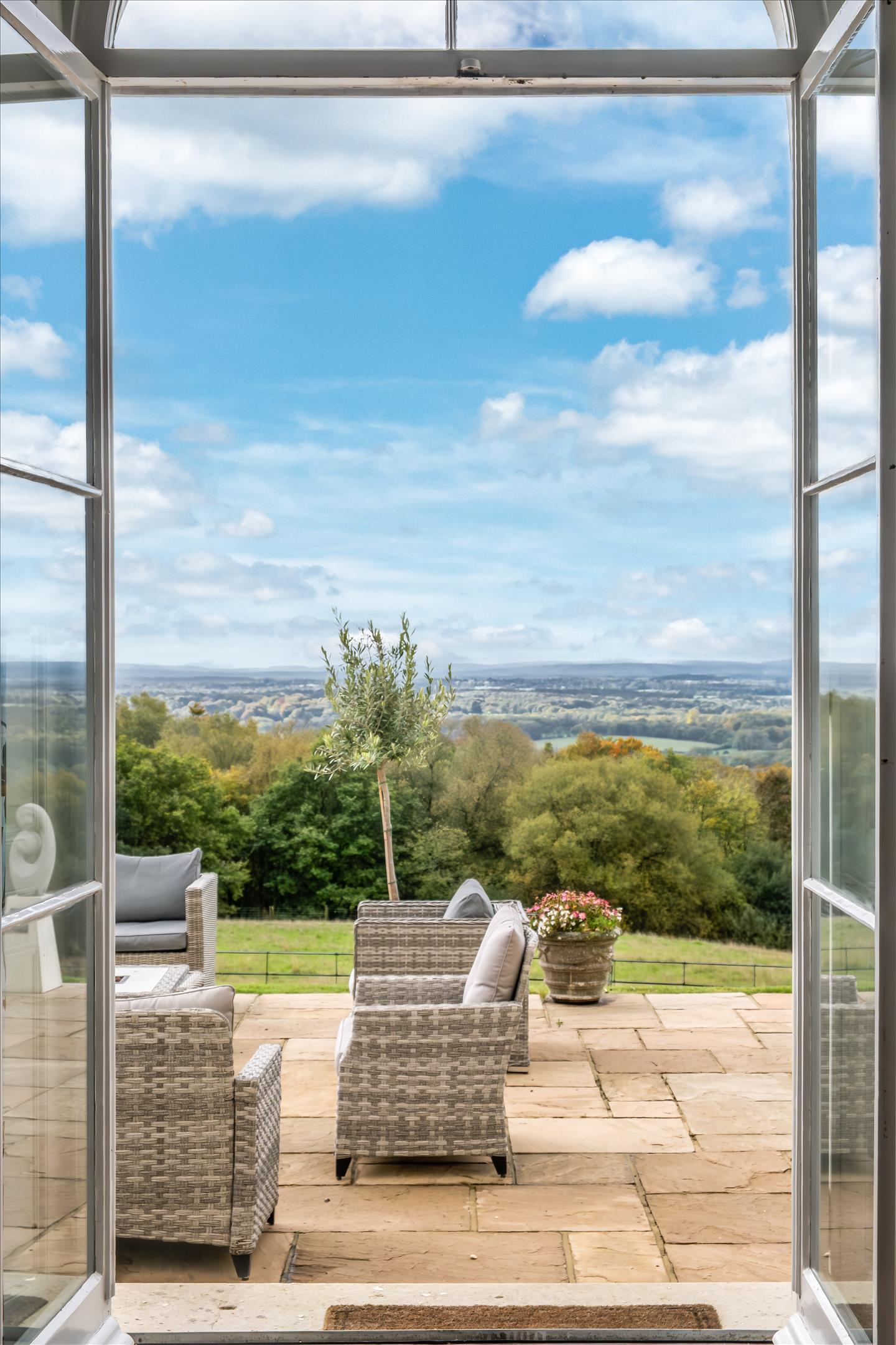 To the rear of the house, a large stone sun terrace takes full advantage of the far-reaching views. Beyond the terrace is a well-manicured lawn bordered by estate fencing, separating the formal gardens from the paddock.