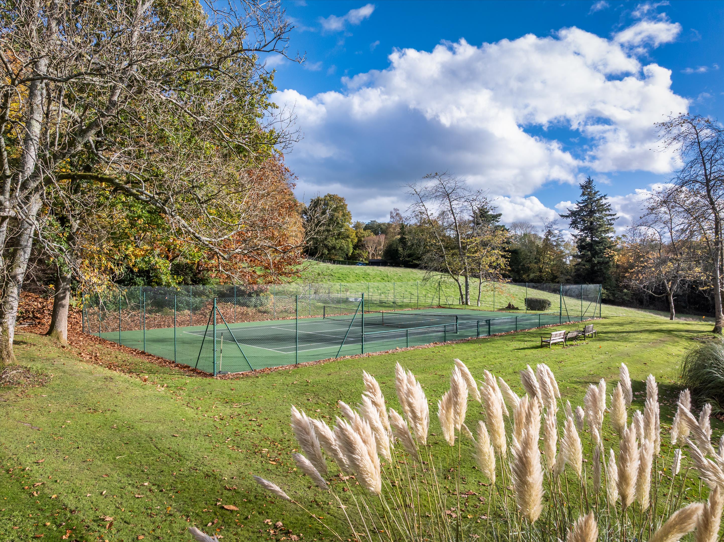 Tanhurst is approached via a long, sweeping driveway bordered by attractive estate fencing. Set within approximately 12.3 acres, the grounds include a well-maintained tennis court and a swimming pool enclosed by a beautiful red-brick period wall.