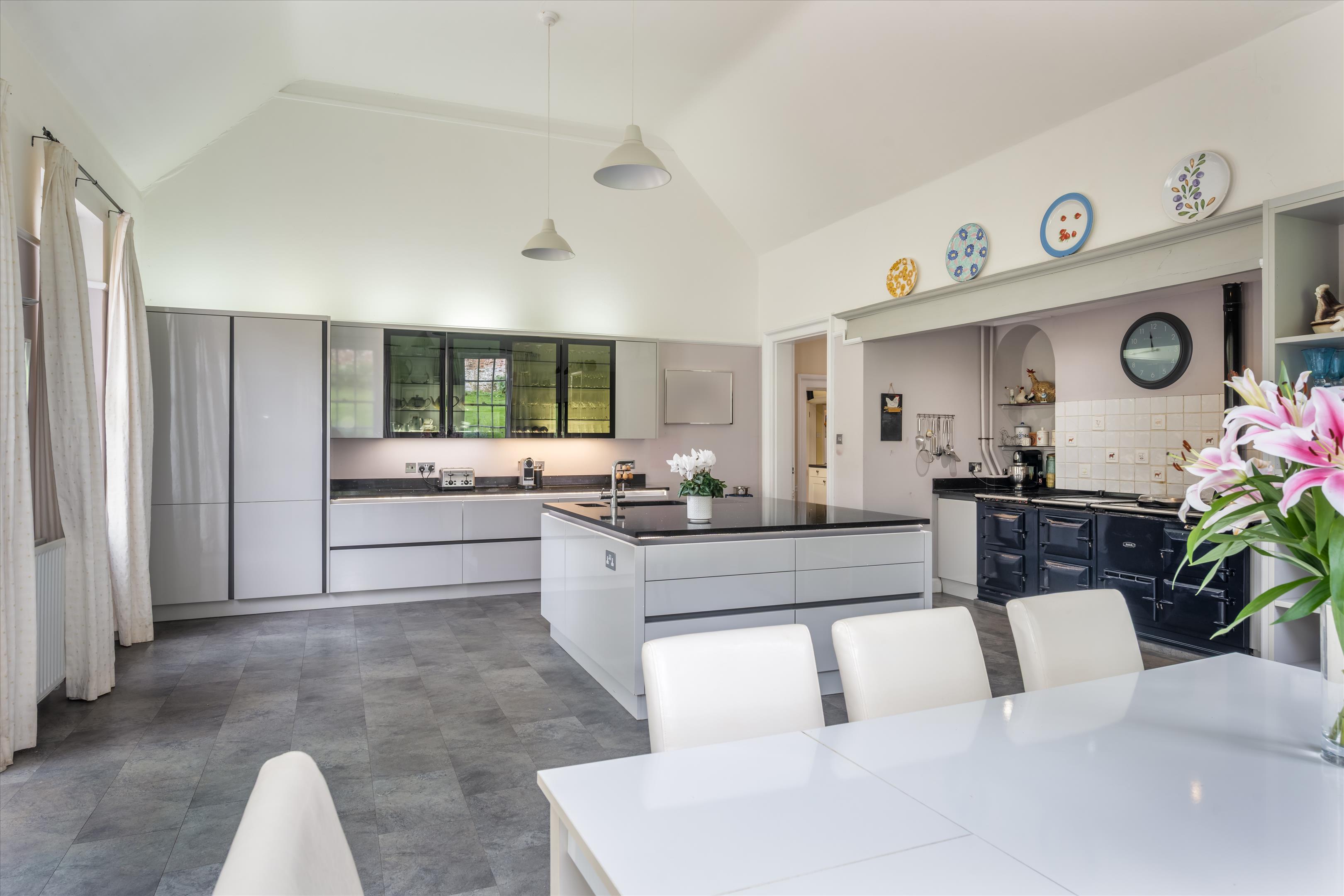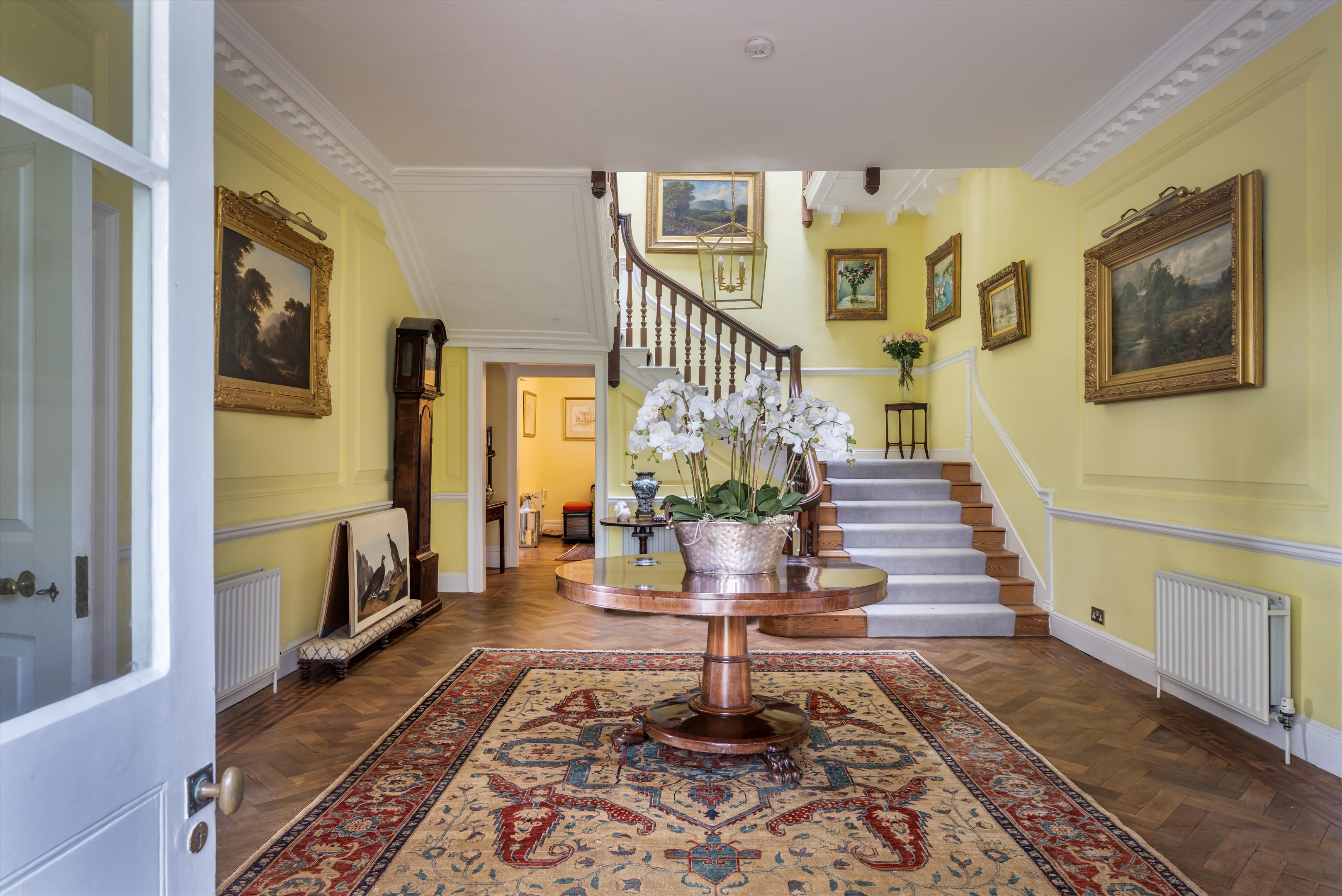 The property is predominantly arranged over three floors and offers more than 7,400 sq ft of accommodation. On the ground floor there is a vaulted reception hall and a modern, well-equipped kitchen with a large island and AGA. To the south side of the house, the sitting room opens onto the rear patio, while the drawing room with its bay window also benefits from the views. This floor also includes a music room, formal dining room, utility room and cloakroom.