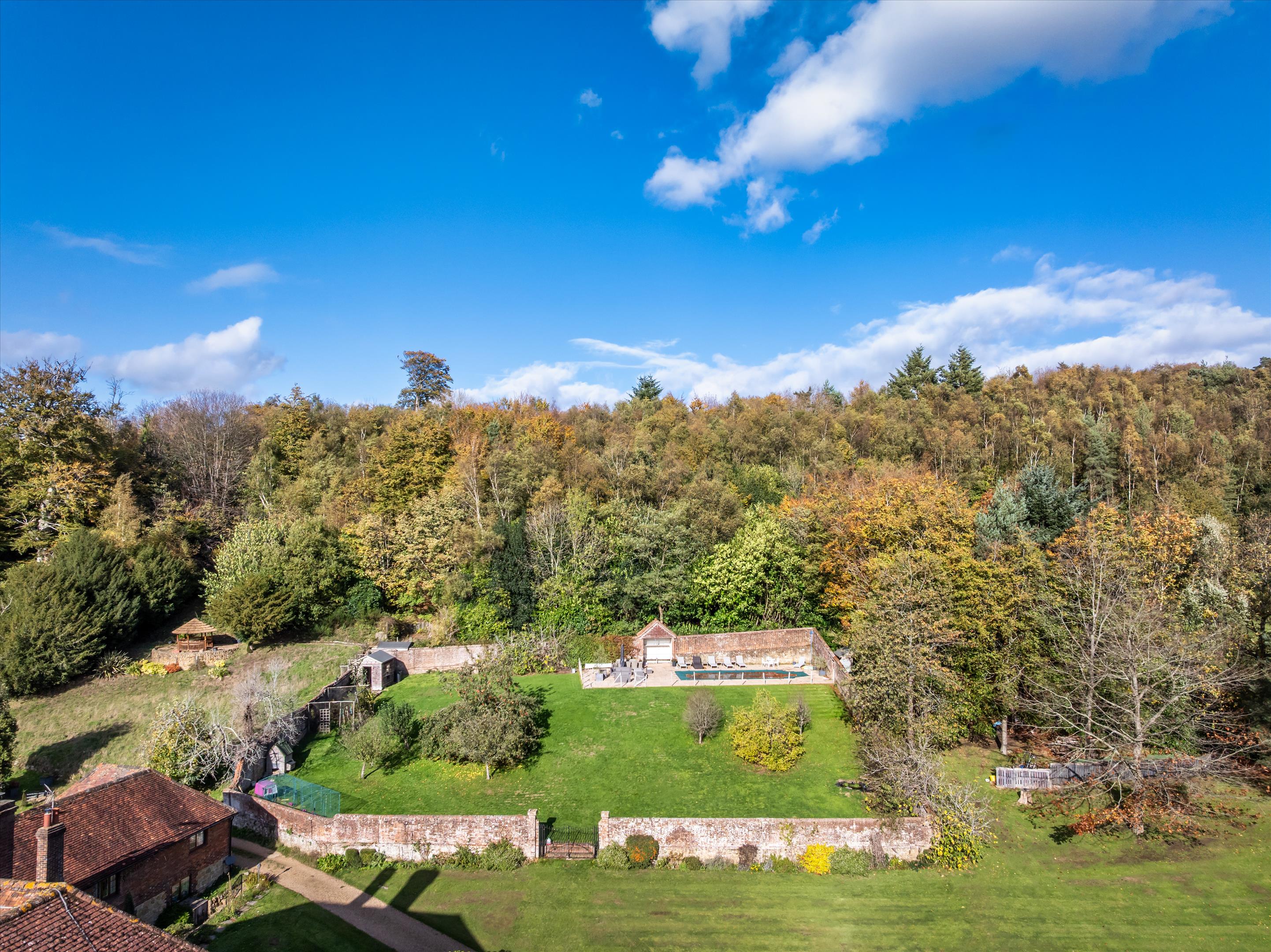 Tanhurst is approached via a long, sweeping driveway bordered by attractive estate fencing. Set within approximately 12.3 acres, the grounds include a well-maintained tennis court and a swimming pool enclosed by a beautiful red-brick period wall.