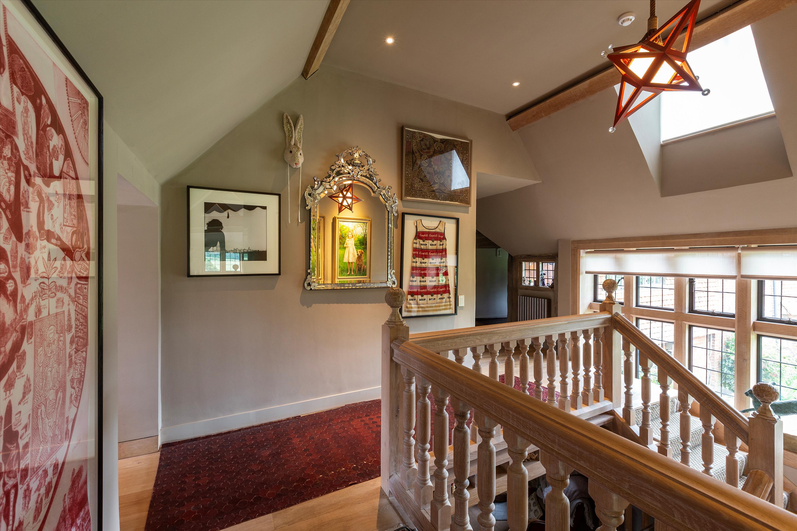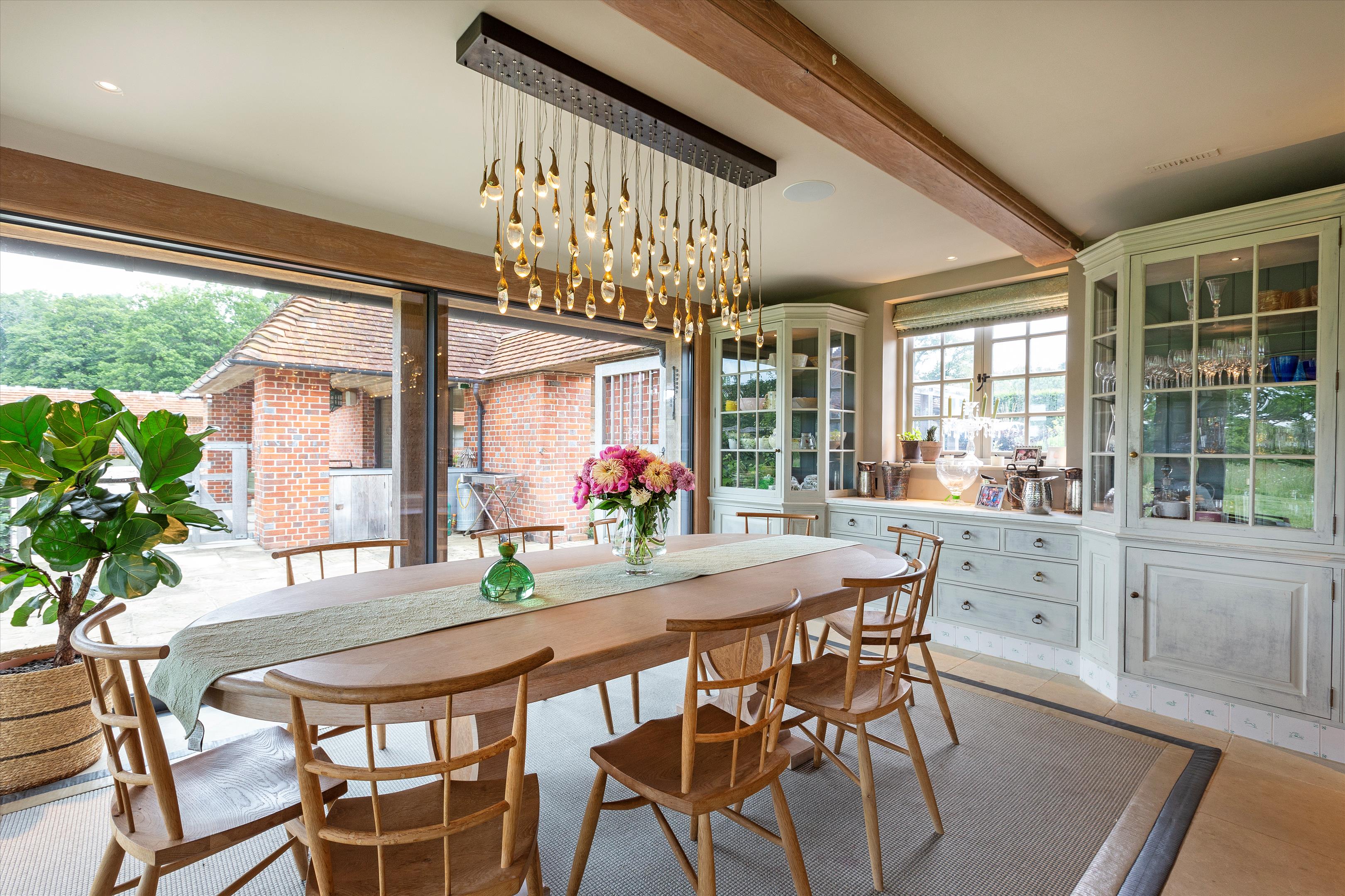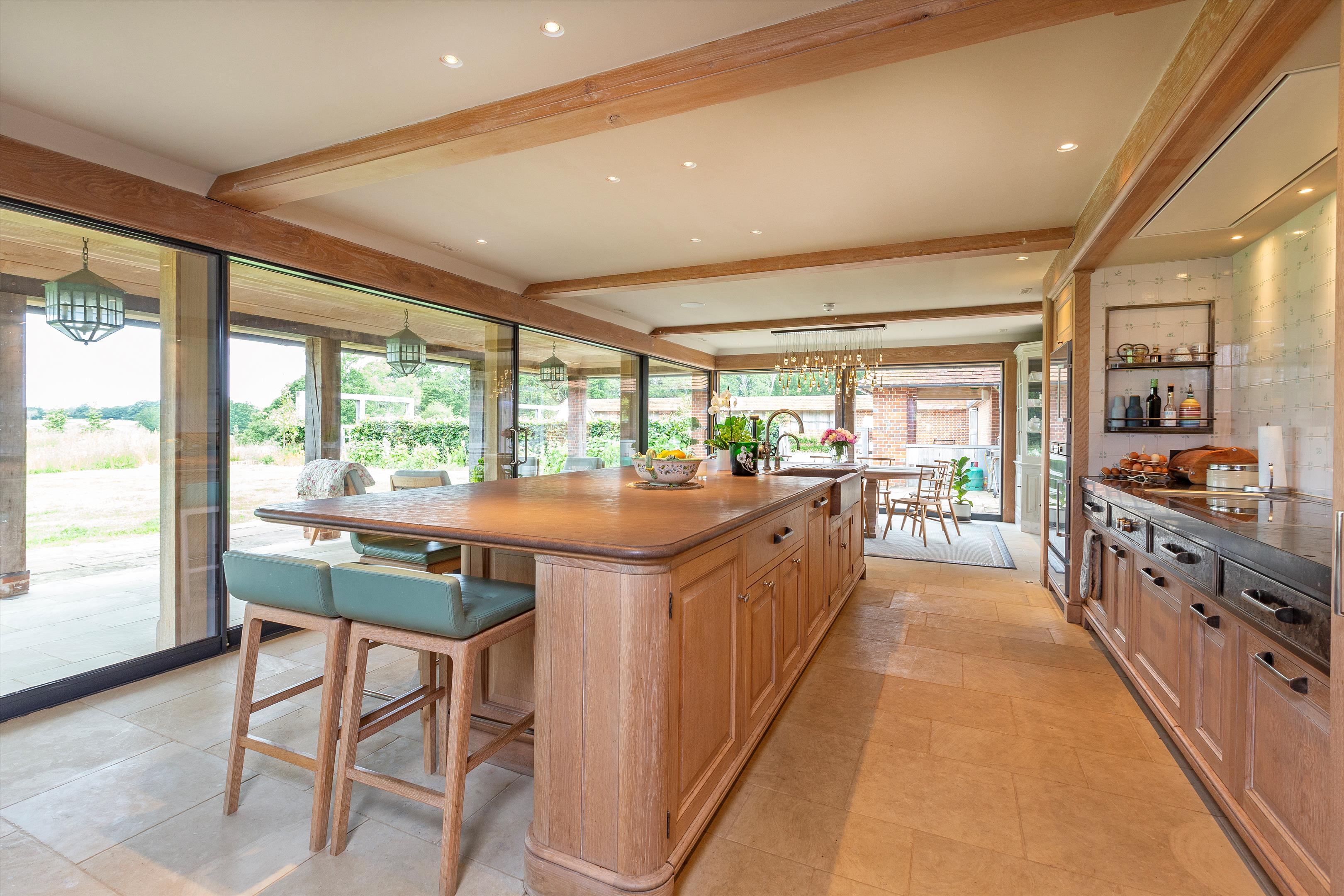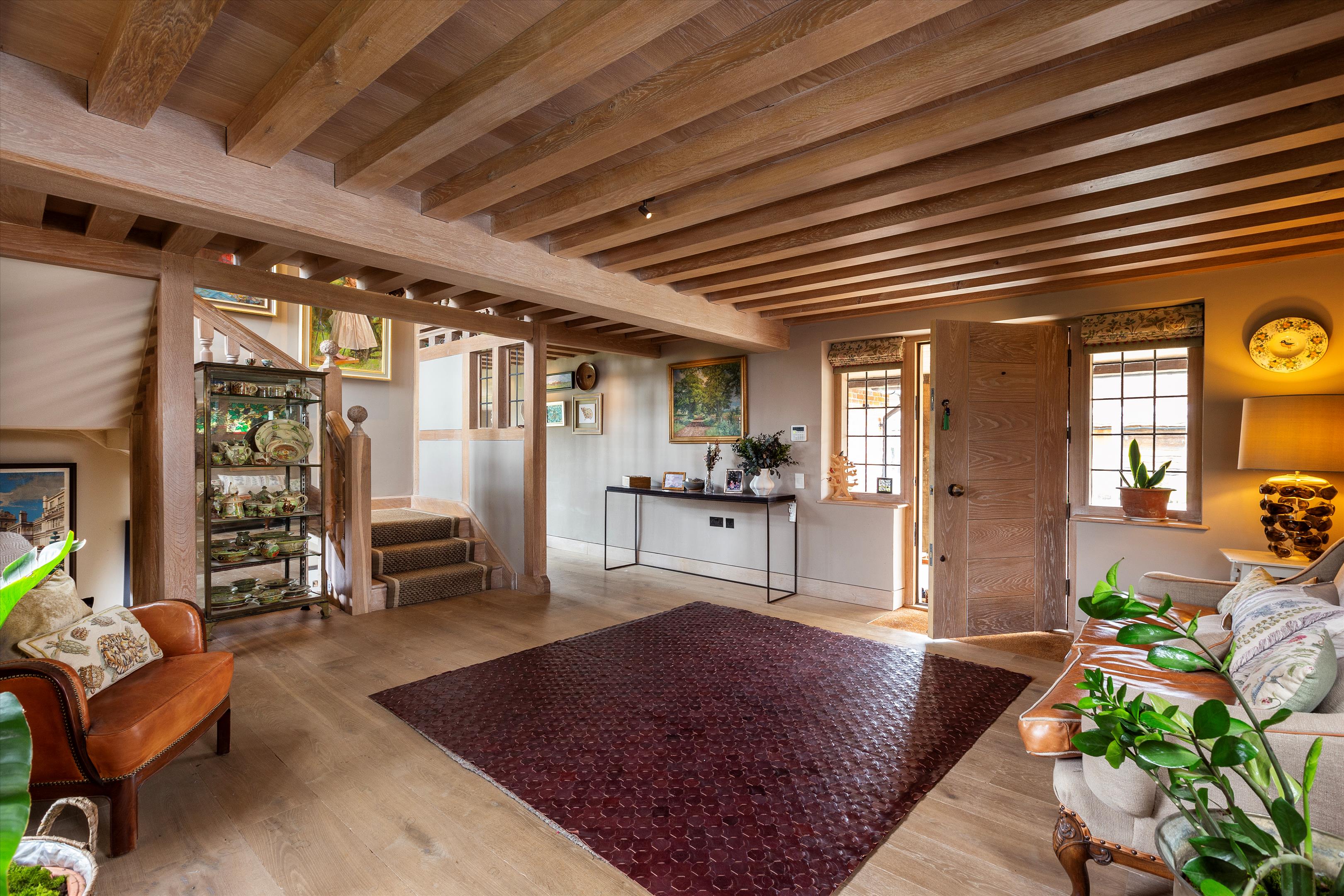 Occupying an elevated position in the rolling hills of the West Sussex-Surrey countryside, Willards Farm benefits from lovely far-reaching views to the west. The front door opens to a welcoming reception room, which branches off to the original wing of the house in one direction and the modern wing in the other. The modern wing comprises a fantastic open-plan family kitchen / dining room with pantry, fully equipped with Gaggenau appliances and handmade cabinetry, with double-height glass doors which run the length of the kitchen and open out to the garden. Adjacent is a wonderful music room, again with large dual aspect windows out to the garden, a unique hand-carved fireplace and a mezzanine above. In the other direction, the old wing of the house comprises a study, WC, snug with gas fireplace and the original drawing room featuring a fireplace and traditional wooden beams, dating back to the 16th century.