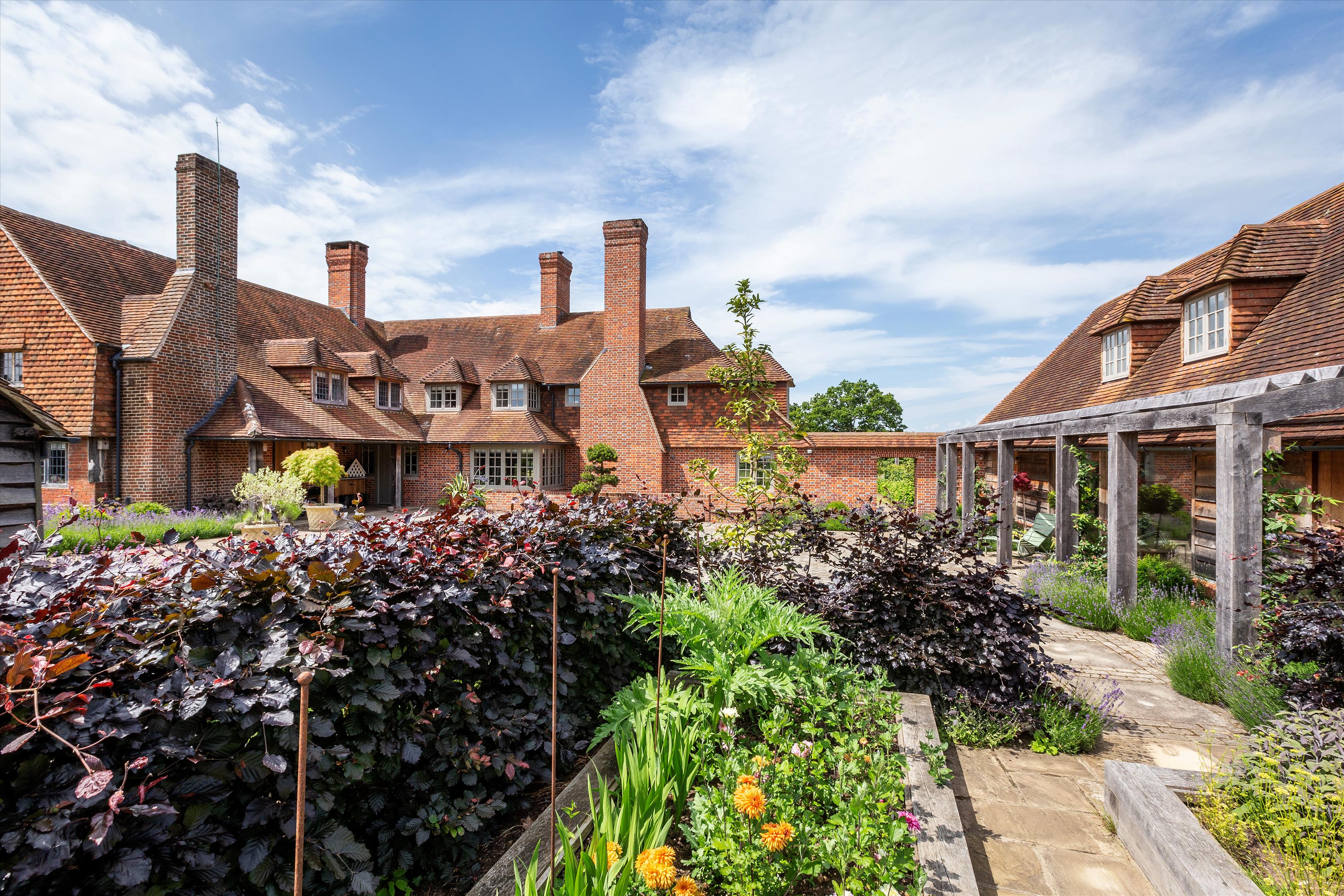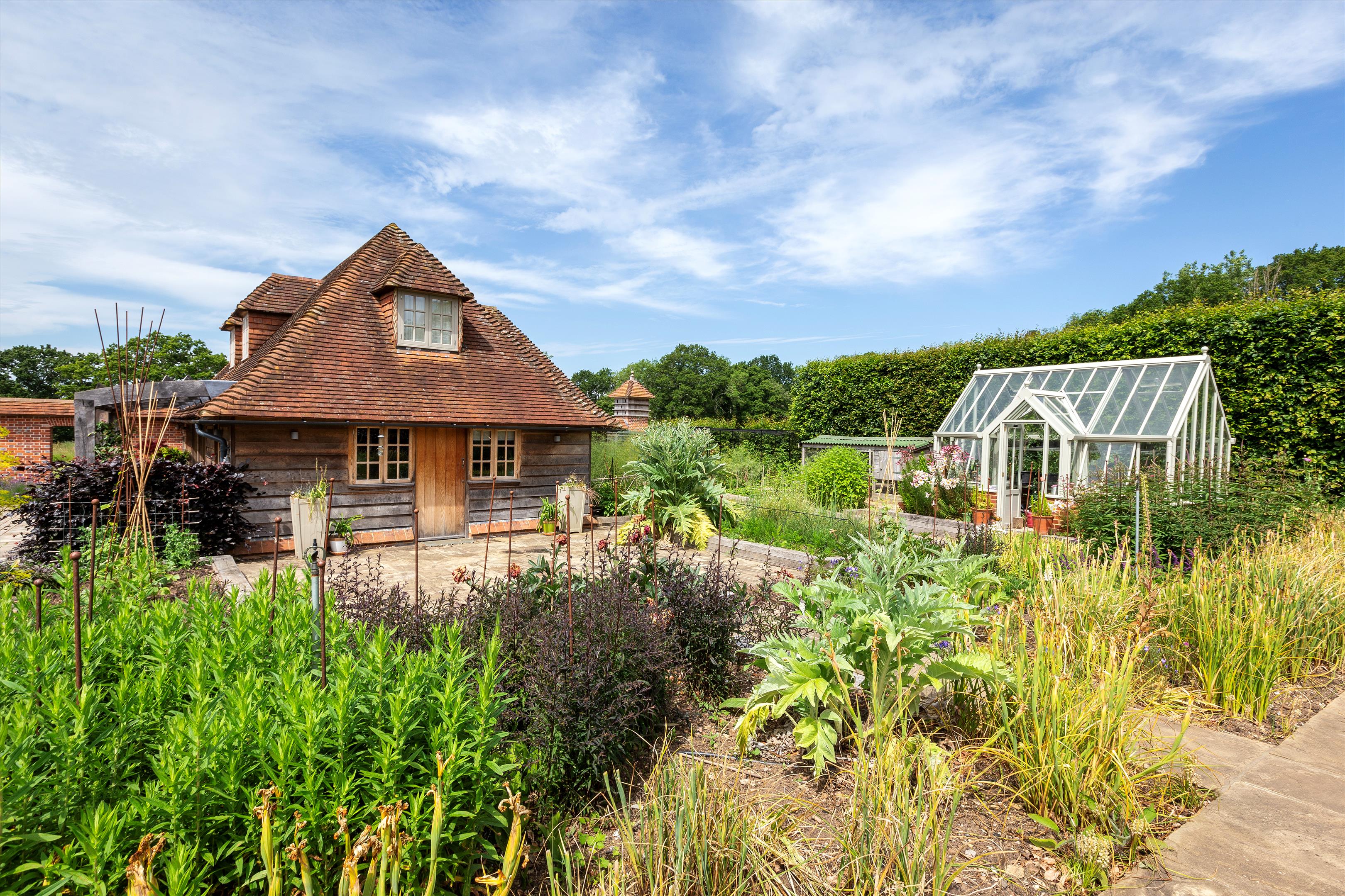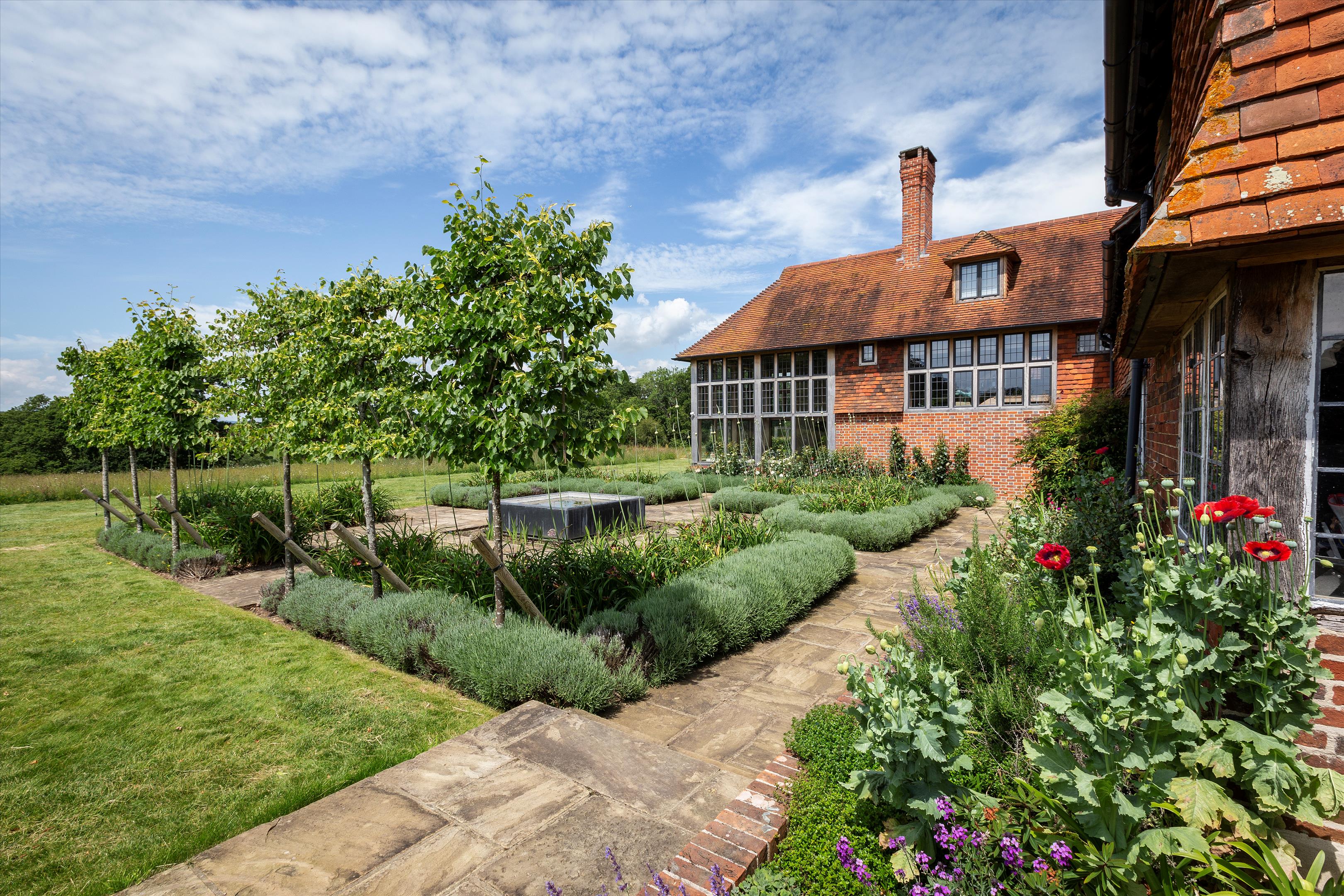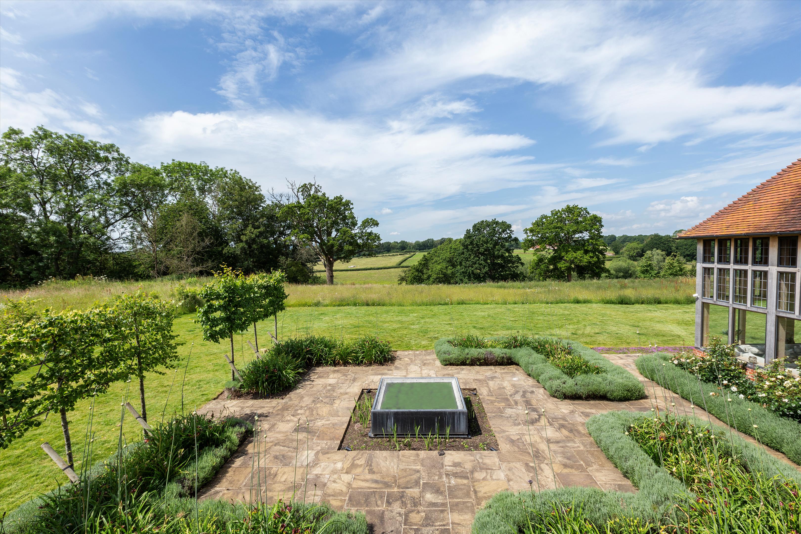 Occupying an elevated position in the rolling hills of the West Sussex-Surrey countryside, Willards Farm benefits from lovely far-reaching views to the west. The front door opens to a welcoming reception room, which branches off to the original wing of the house in one direction and the modern wing in the other. The modern wing comprises a fantastic open-plan family kitchen / dining room with pantry, fully equipped with Gaggenau appliances and handmade cabinetry, with double-height glass doors which run the length of the kitchen and open out to the garden. Adjacent is a wonderful music room, again with large dual aspect windows out to the garden, a unique hand-carved fireplace and a mezzanine above. In the other direction, the old wing of the house comprises a study, WC, snug with gas fireplace and the original drawing room featuring a fireplace and traditional wooden beams, dating back to the 16th century.