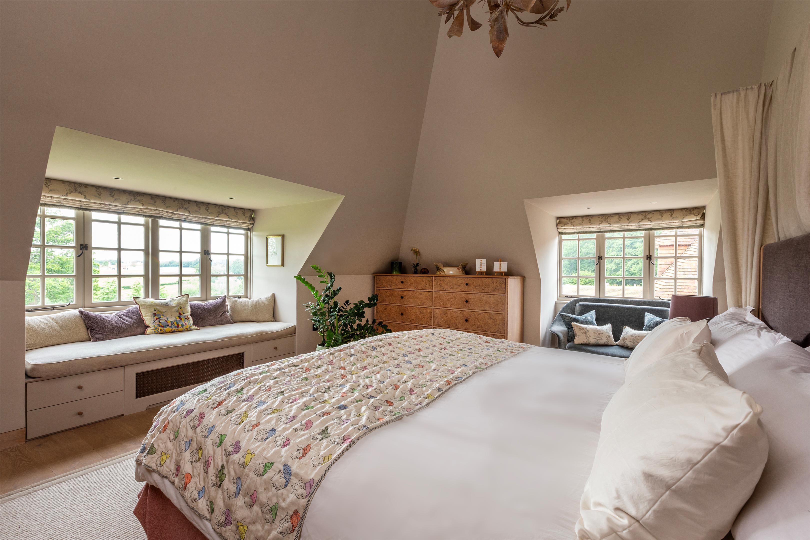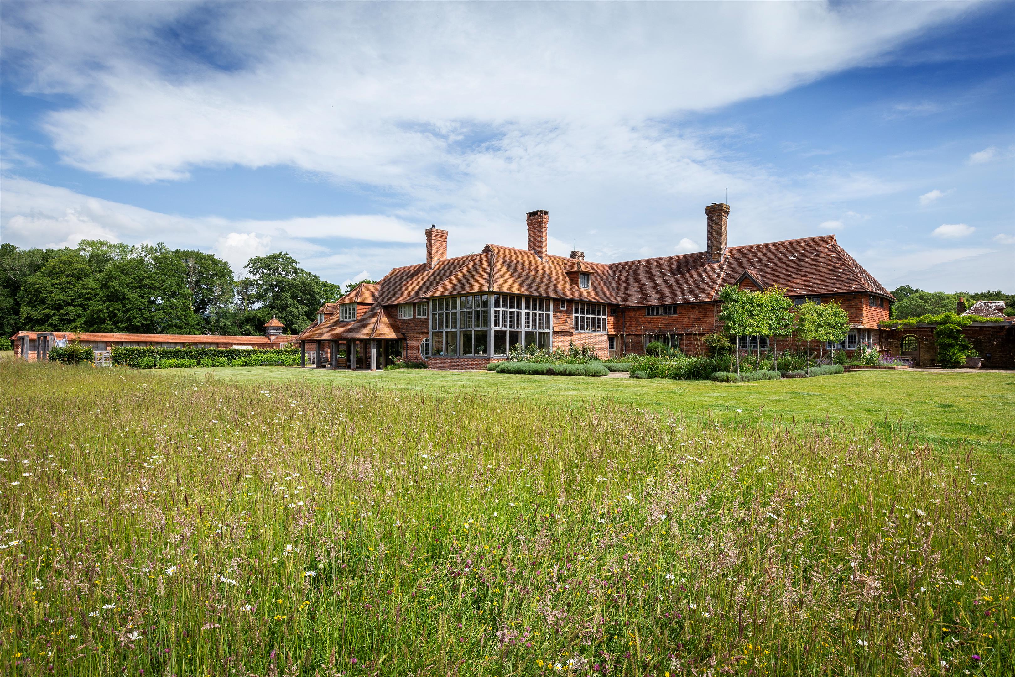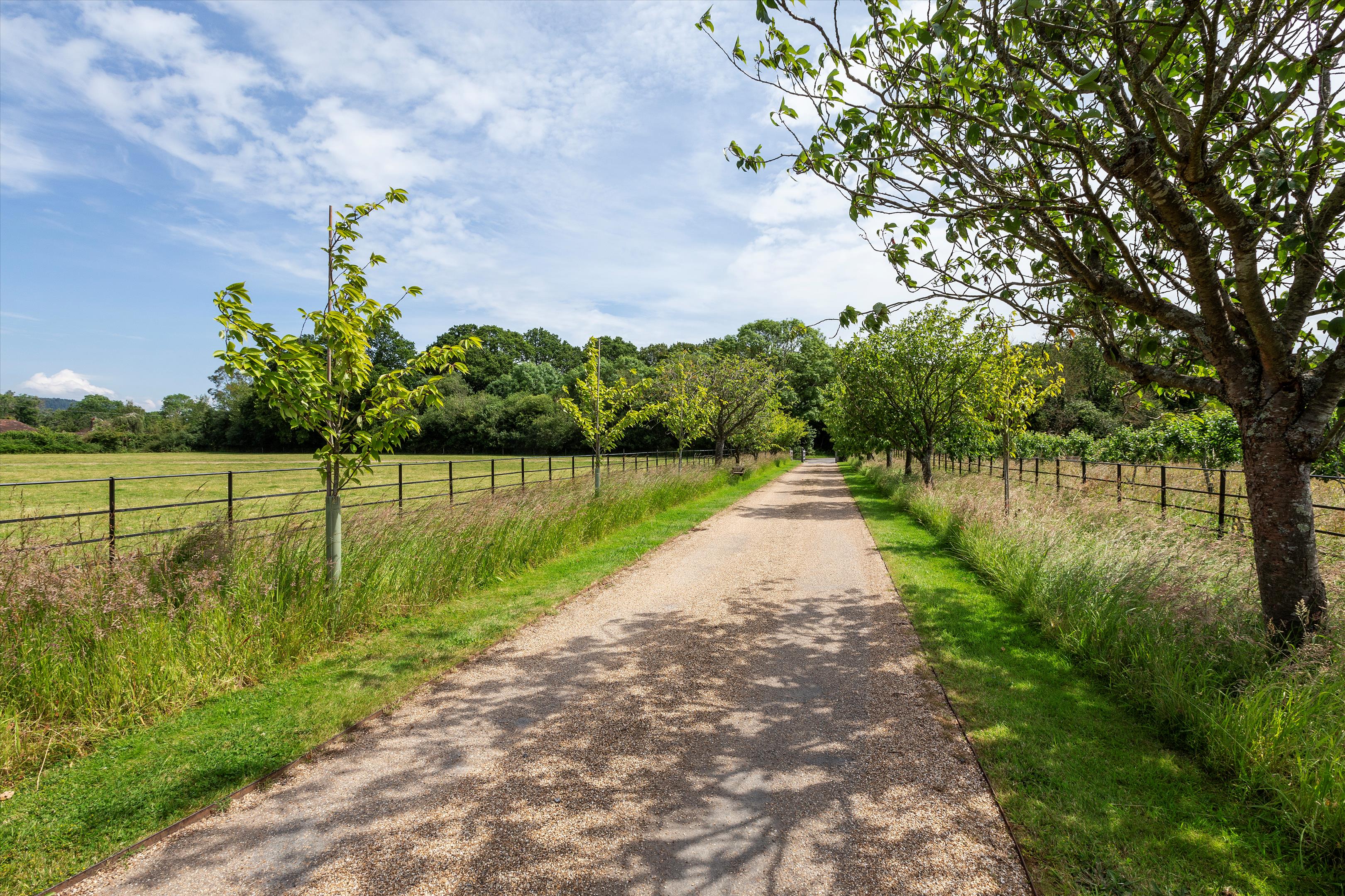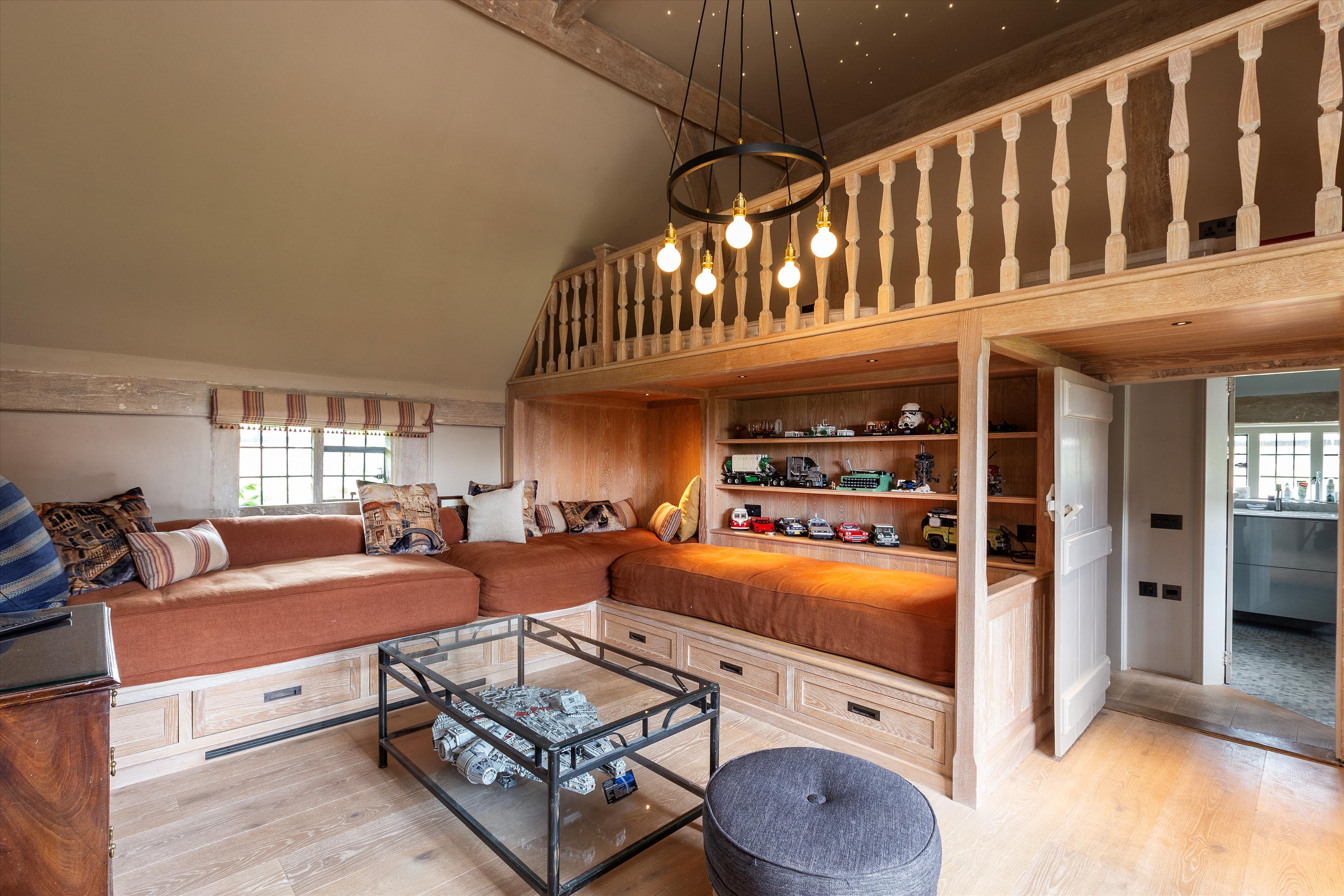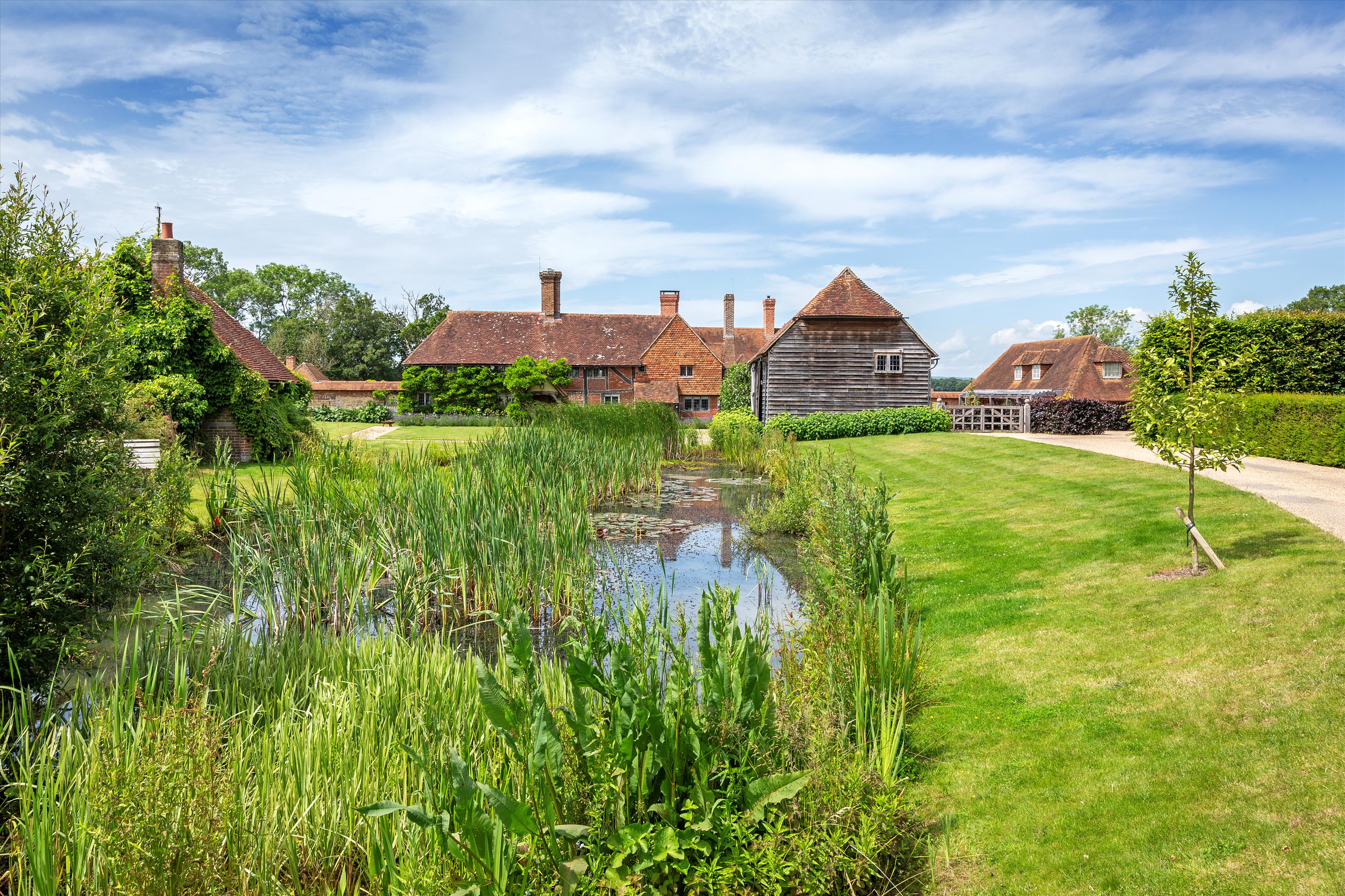 Occupying an elevated position in the rolling hills of the West Sussex-Surrey countryside, Willards Farm benefits from lovely far-reaching views to the west. The front door opens to a welcoming reception room, which branches off to the original wing of the house in one direction and the modern wing in the other. The modern wing comprises a fantastic open-plan family kitchen / dining room with pantry, fully equipped with Gaggenau appliances and handmade cabinetry, with double-height glass doors which run the length of the kitchen and open out to the garden. Adjacent is a wonderful music room, again with large dual aspect windows out to the garden, a unique hand-carved fireplace and a mezzanine above. In the other direction, the old wing of the house comprises a study, WC, snug with gas fireplace and the original drawing room featuring a fireplace and traditional wooden beams, dating back to the 16th century.