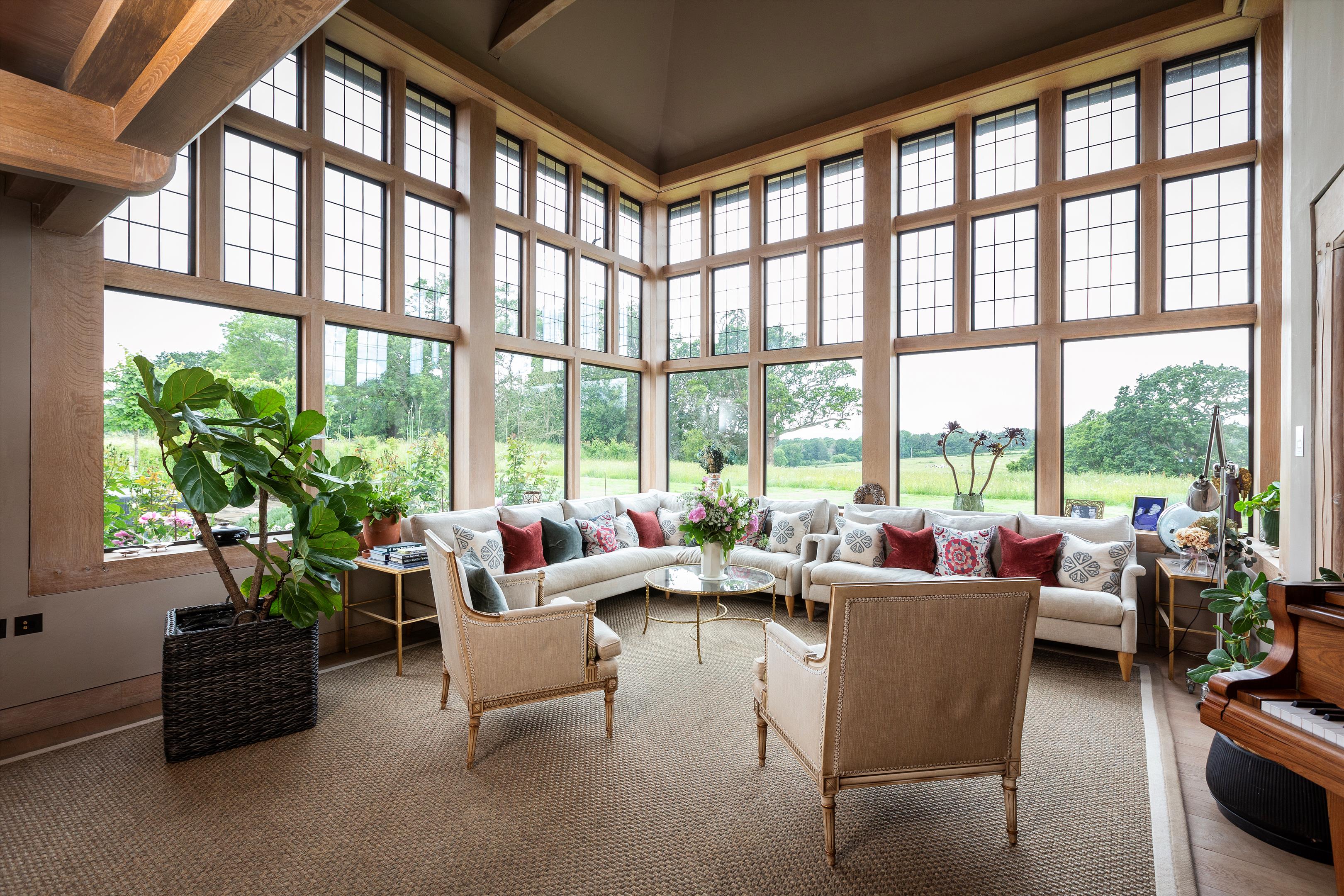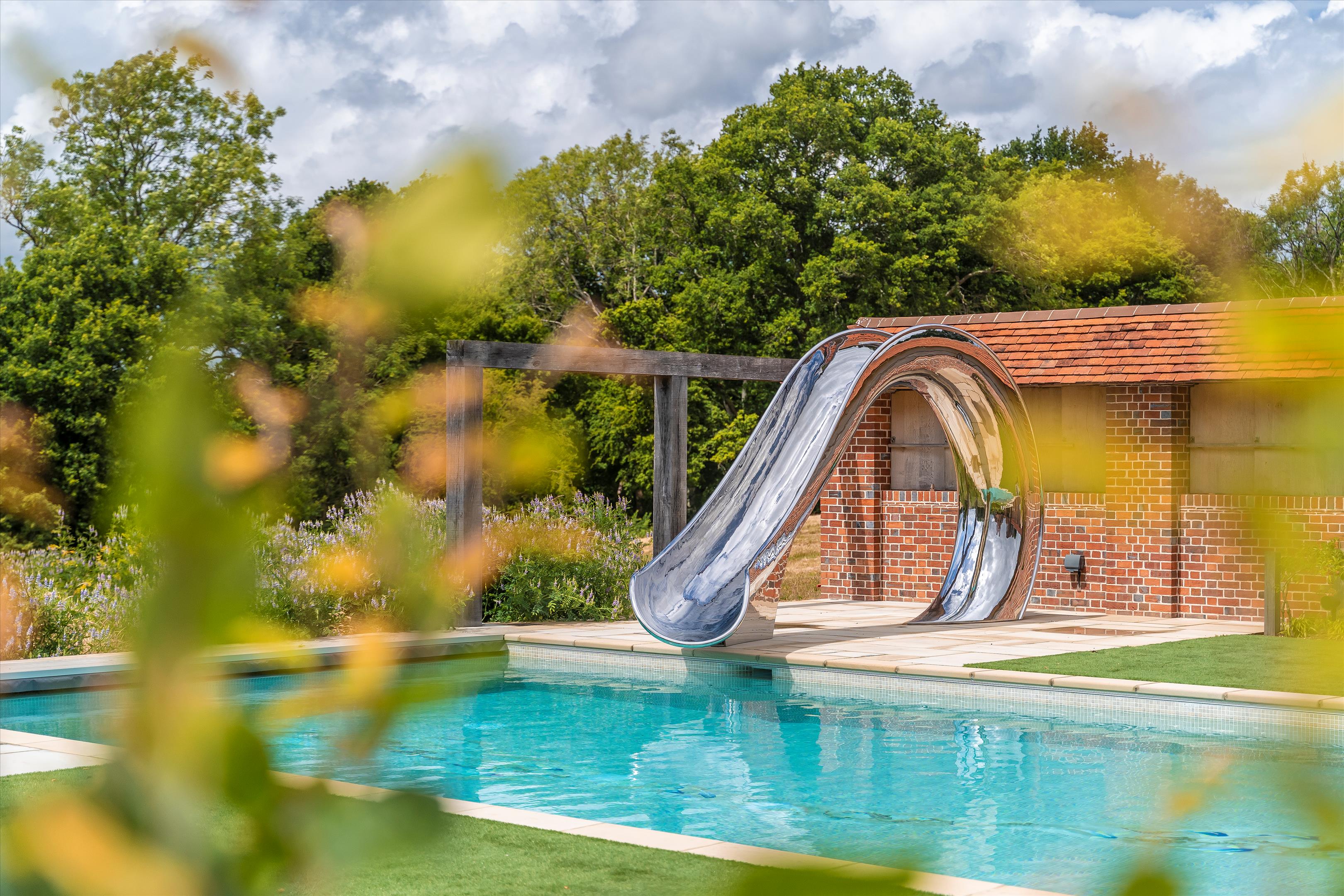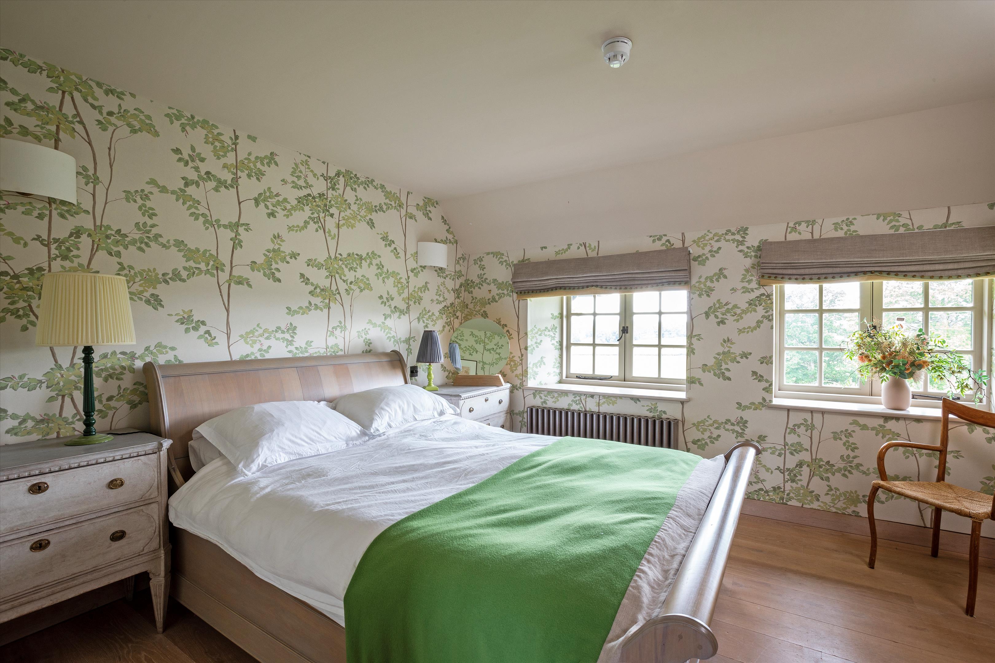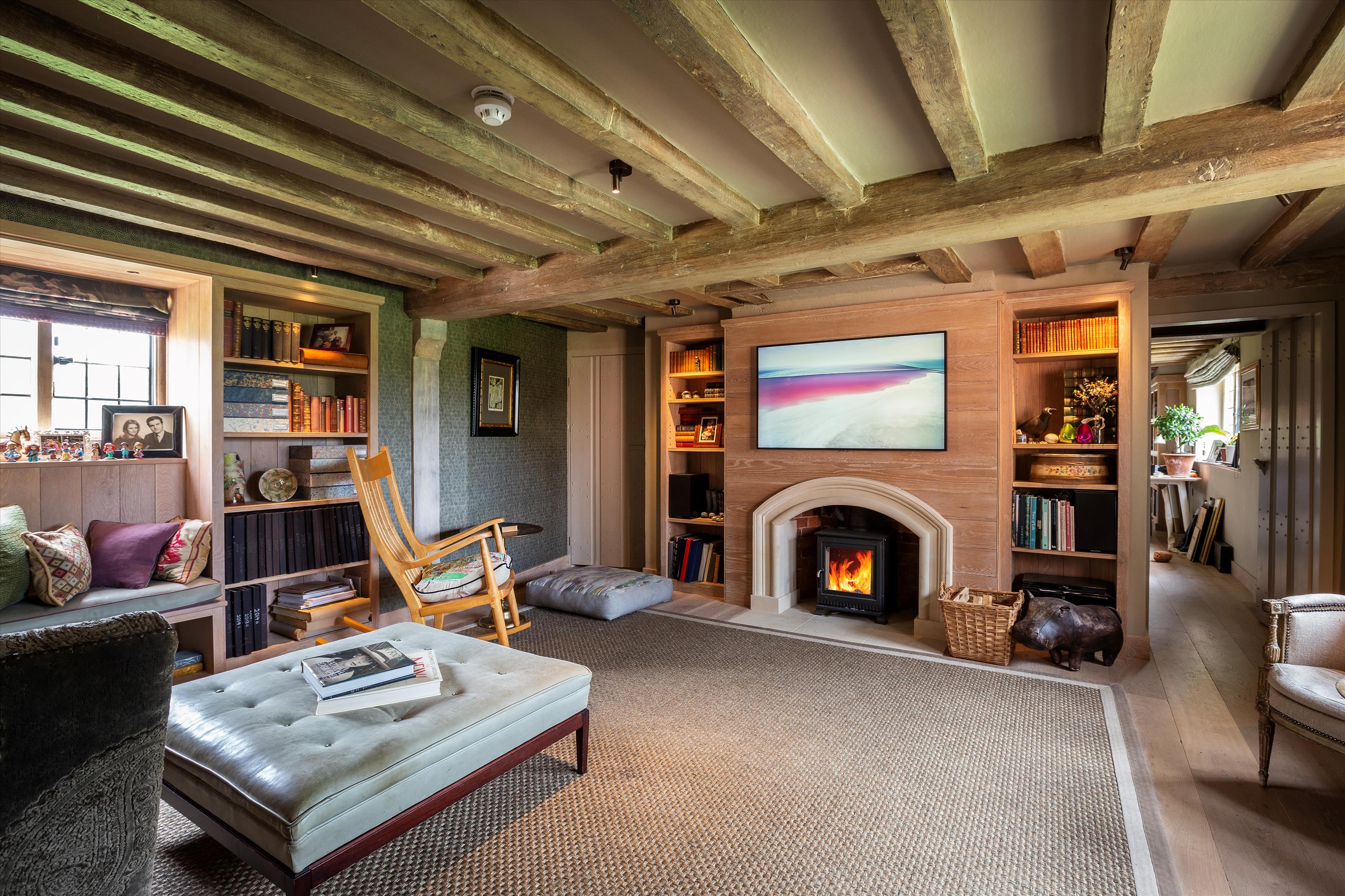 Occupying an elevated position in the rolling hills of the West Sussex-Surrey countryside, Willards Farm benefits from lovely far-reaching views to the west. The front door opens to a welcoming reception room, which branches off to the original wing of the house in one direction and the modern wing in the other. The modern wing comprises a fantastic open-plan family kitchen / dining room with pantry, fully equipped with Gaggenau appliances and handmade cabinetry, with double-height glass doors which run the length of the kitchen and open out to the garden. Adjacent is a wonderful music room, again with large dual aspect windows out to the garden, a unique hand-carved fireplace and a mezzanine above. In the other direction, the old wing of the house comprises a study, WC, snug with gas fireplace and the original drawing room featuring a fireplace and traditional wooden beams, dating back to the 16th century.