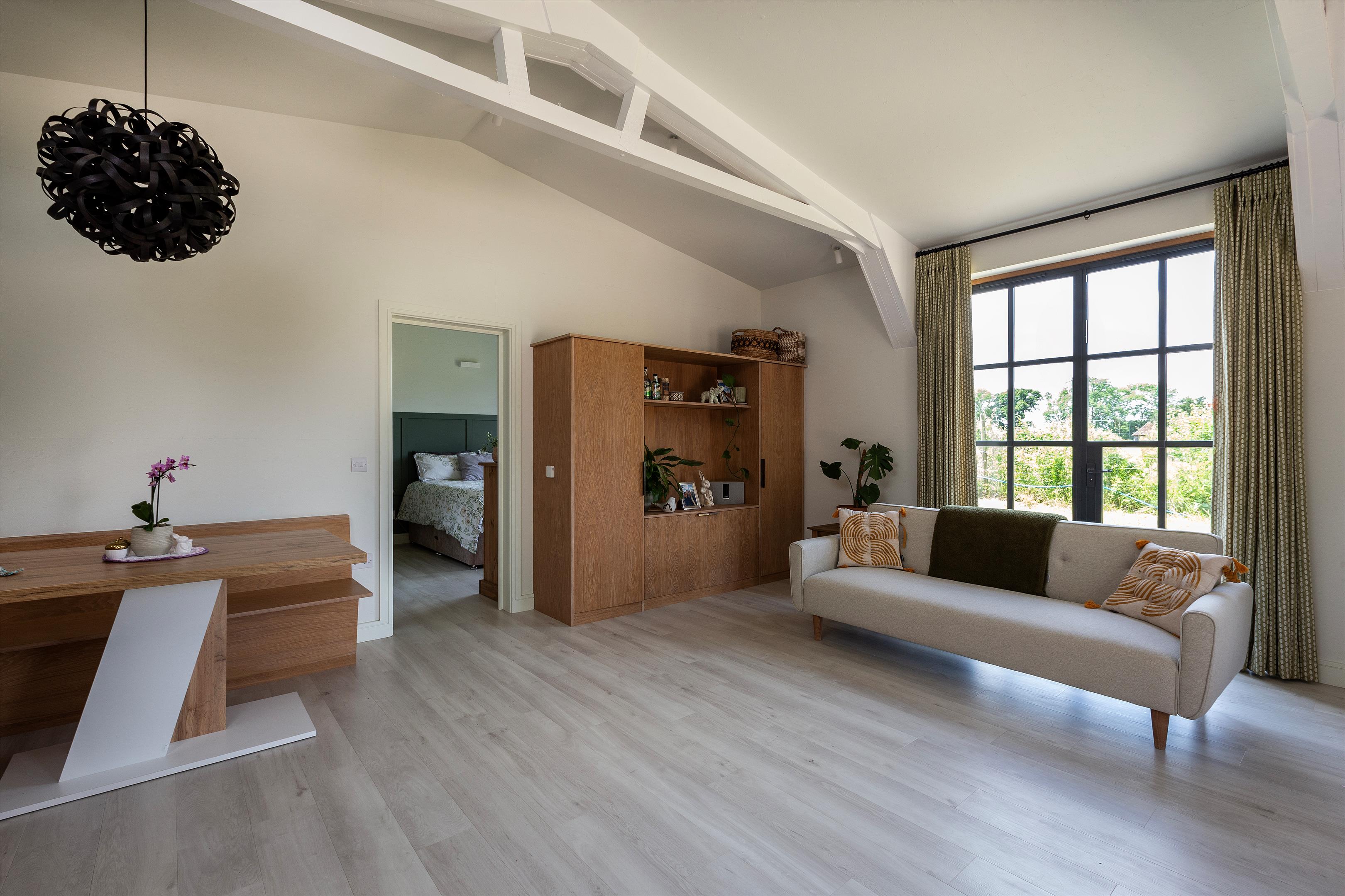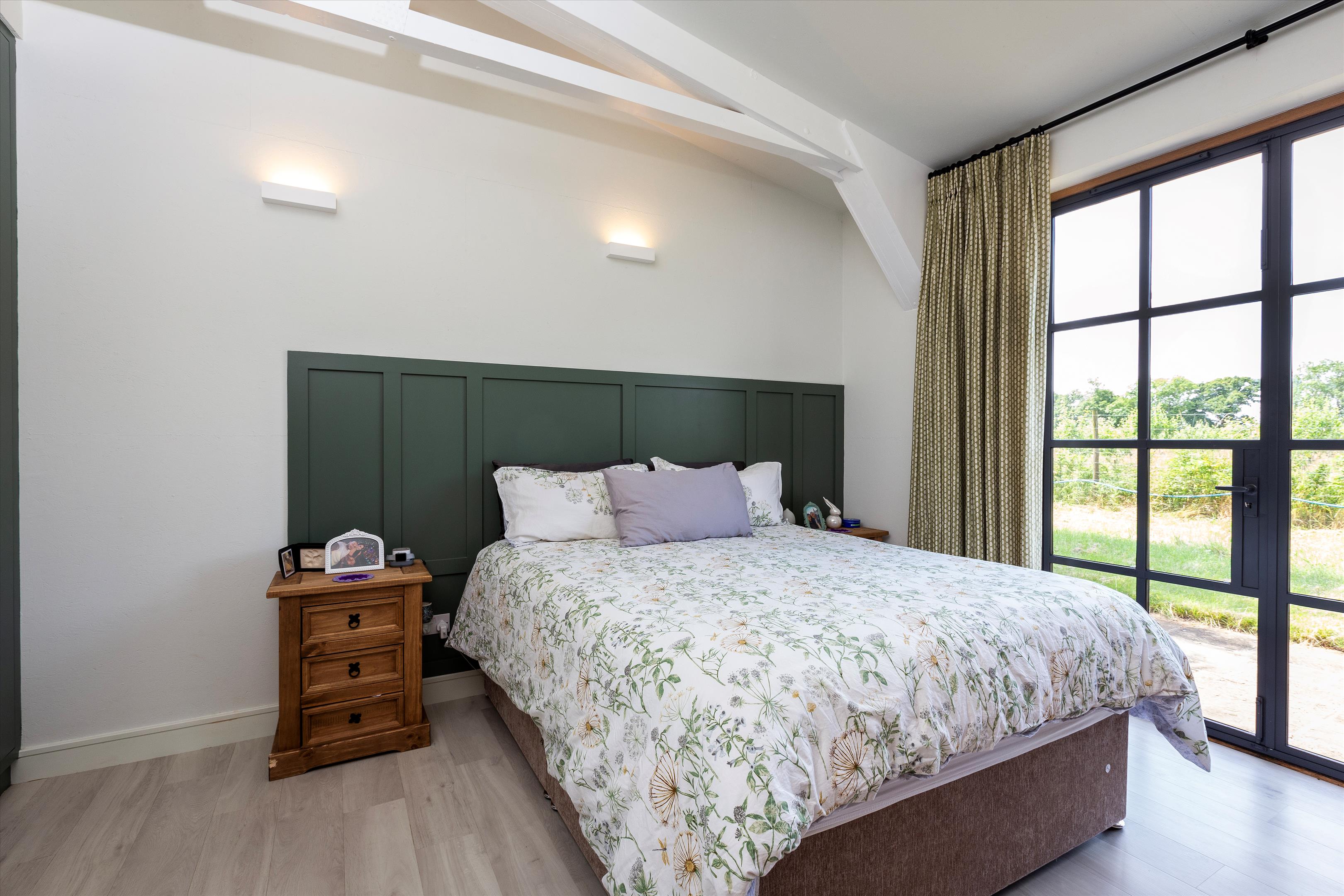 Spitfire Barn: a quirky newly converted one bedroom barn conversion with open-plan kitchen/living area and large glass doors in both bedroom and living room.