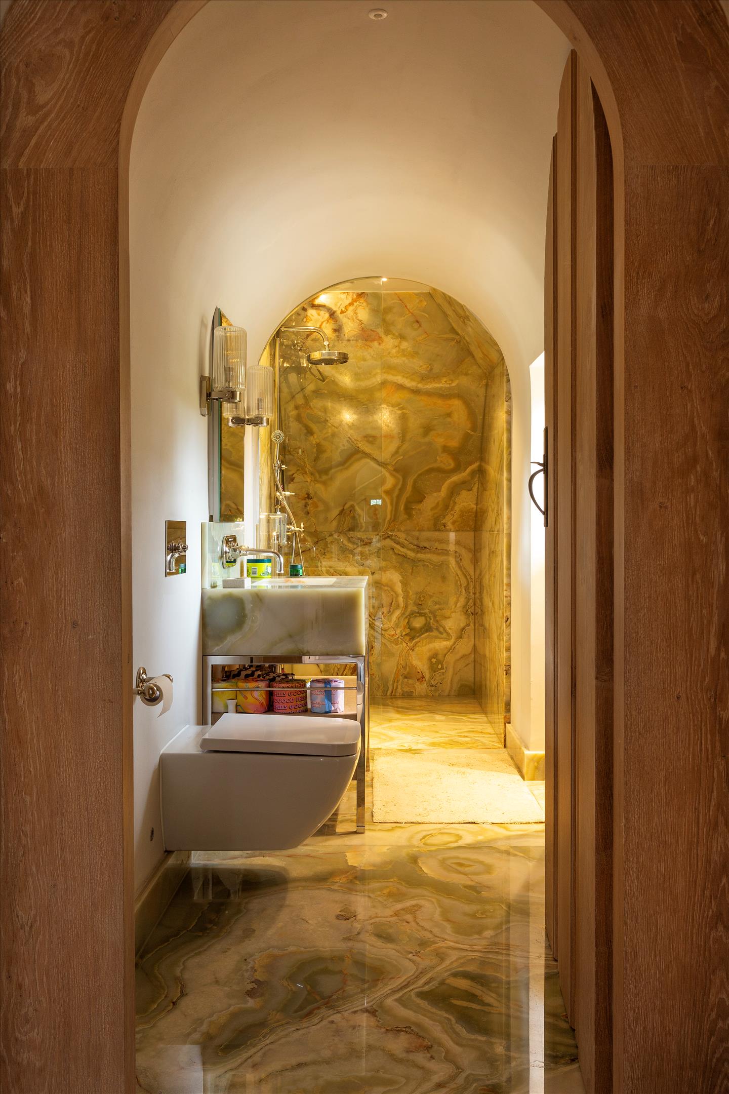 The newly installed cellar comprises a family media room, shower room and sauna, wine cellar, laundry area, plant room and central utility room, with staff access from outside via service steps. Upstairs, both the principal bedroom and guest bedroom are well-sized with en suites, with four further bedrooms, a 'den' with starry ceiling and mezzanine, a family bathroom impressively constructed almost entirely from onyx, a shower room and WC.
