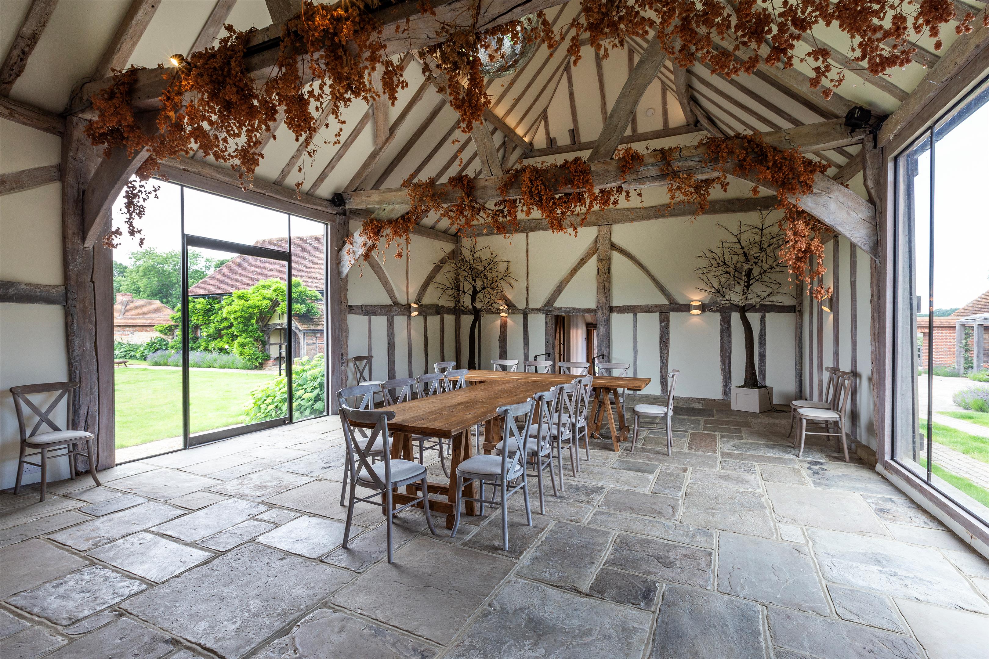 The Barn: a historic old cart barn, now converted to a large party barn providing a fabulous open space for entertaining. Featuring traditional wooden beams, full-size glass doors on either side, a large light up disco ball, a fully equipped kitchen and two WCs.