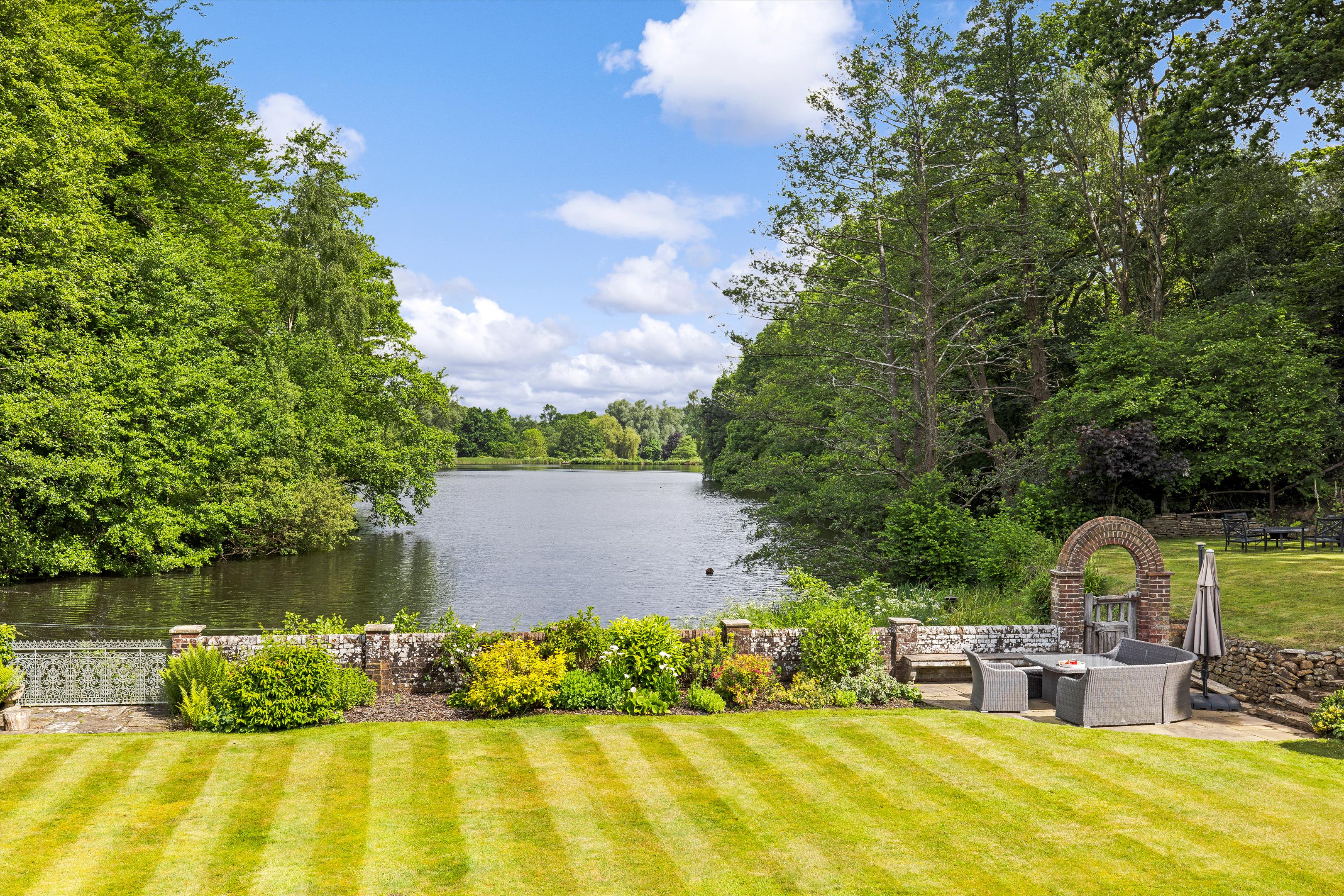 Abutting the rear of the house is a loggia and terrace and the level lawns extend to the lake. This area is interspersed with shrub borders and creates a most wonderful lakeside setting.