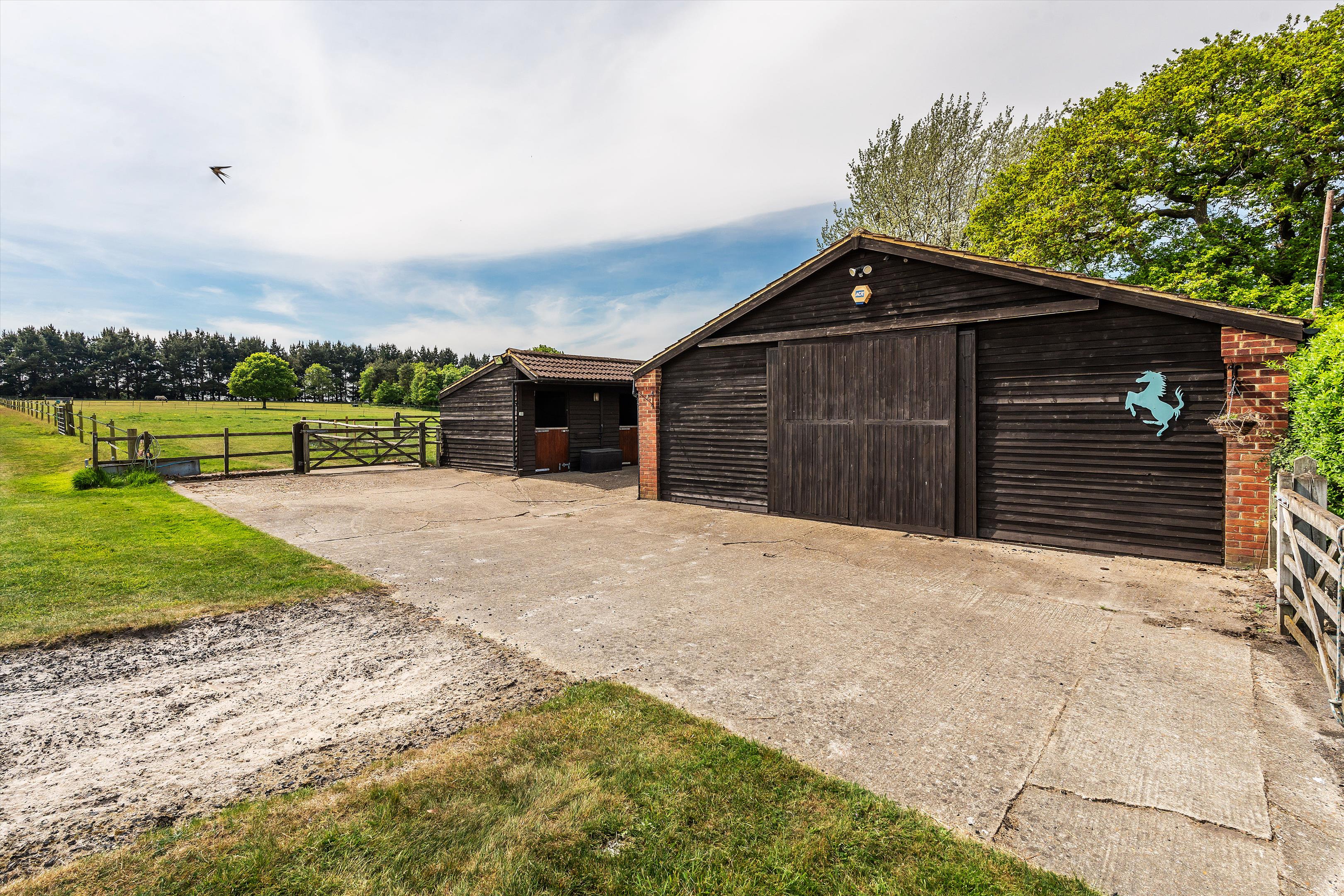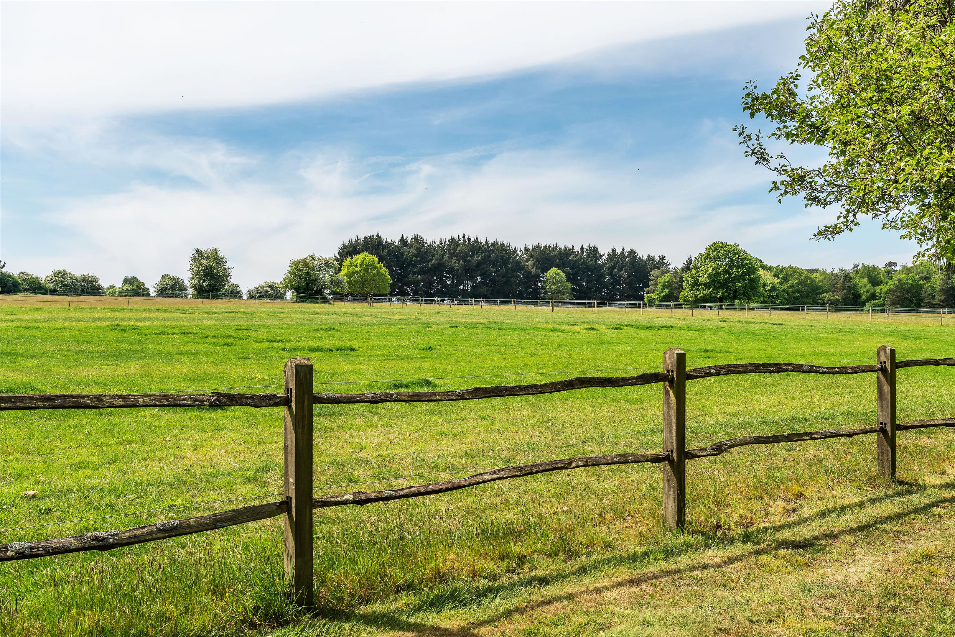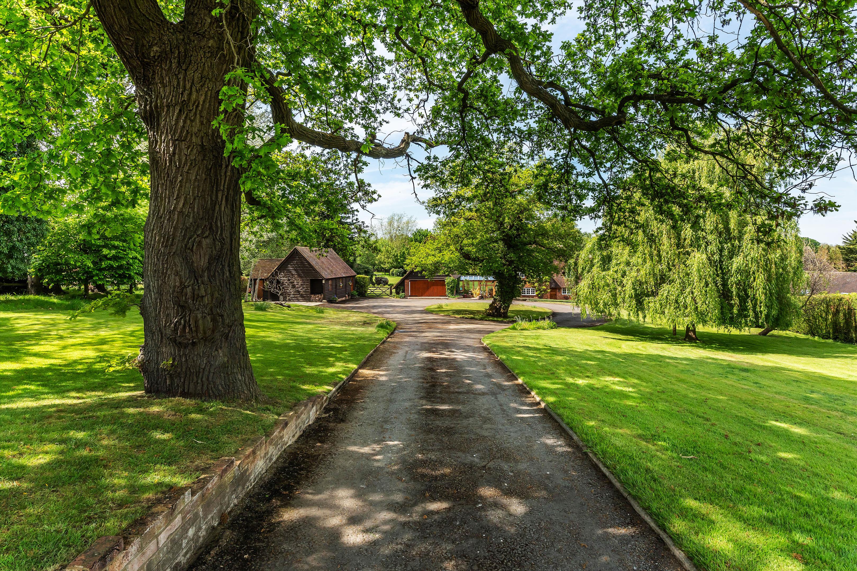 The house is approached from Blanchards Hill through electric wooden gates down a very long, tree lined carriage drive, passing open paddocks and culminating in a turning circle with large parking area in front of the house and annexe.