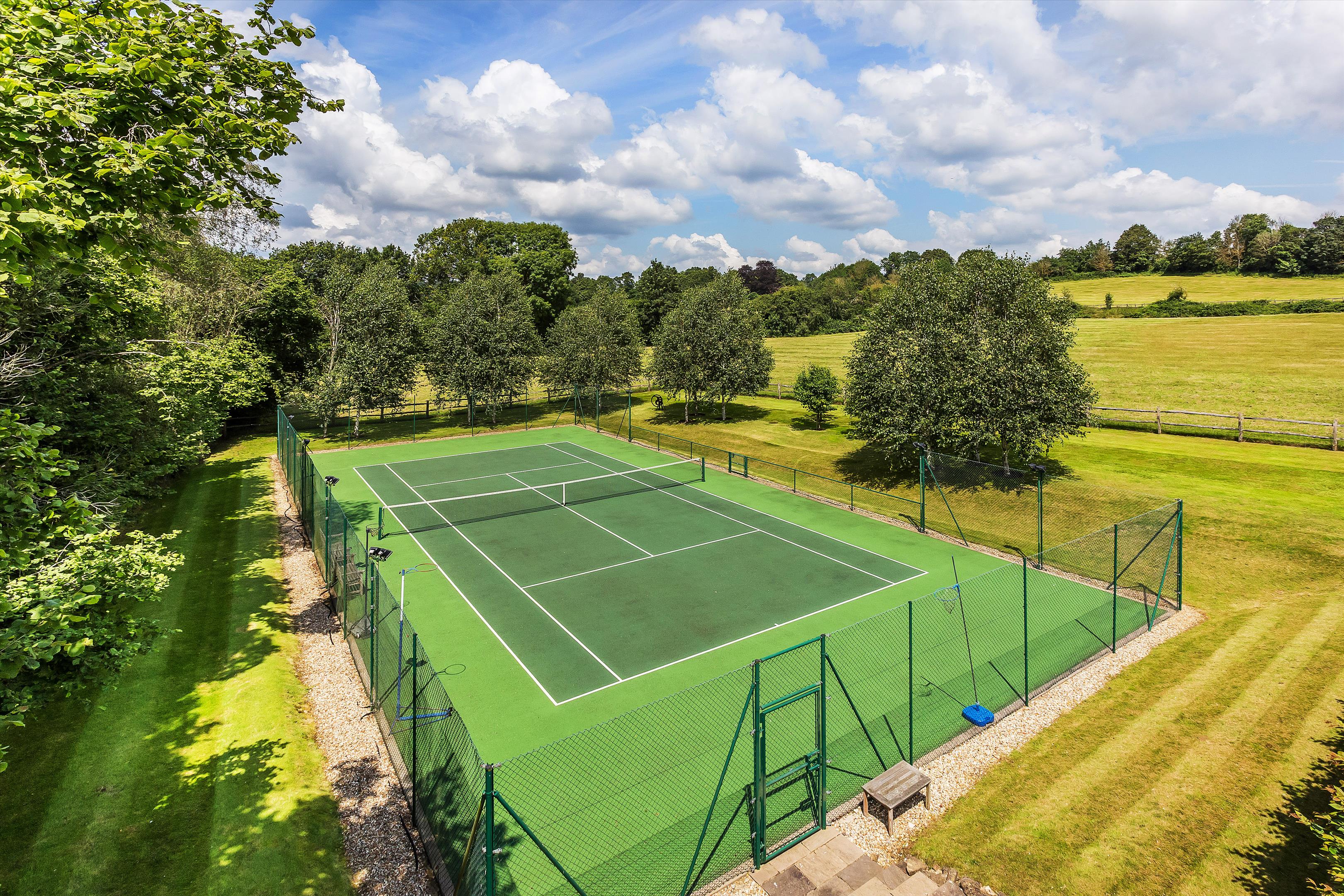 The drive continues to a courtyard enclosed on three sides by the house and its adjacent garage range. Lying mainly to the south, the gardens include well-formed borders within box hedging and neat gravelled paths. Opening out from the garden room and kitchen are extensive paved terraces, ideal for al fresco entertaining. A hard-surfaced tennis court and adjoining seating area sit within the grounds.