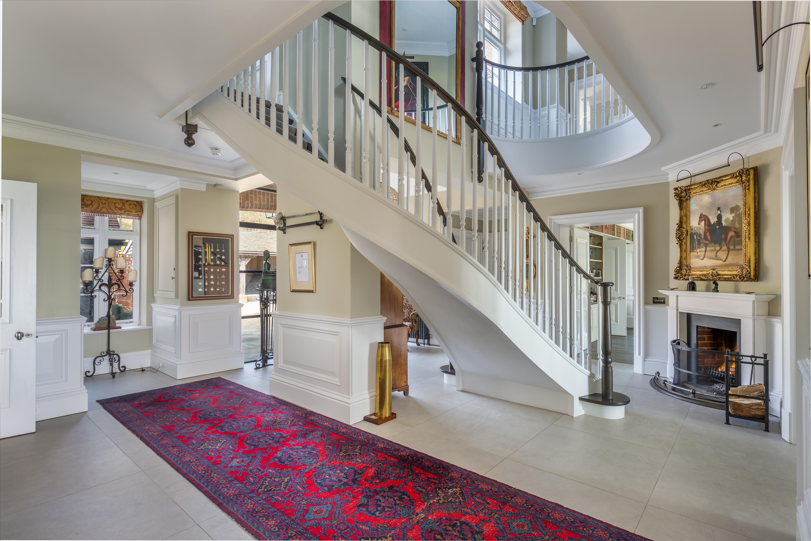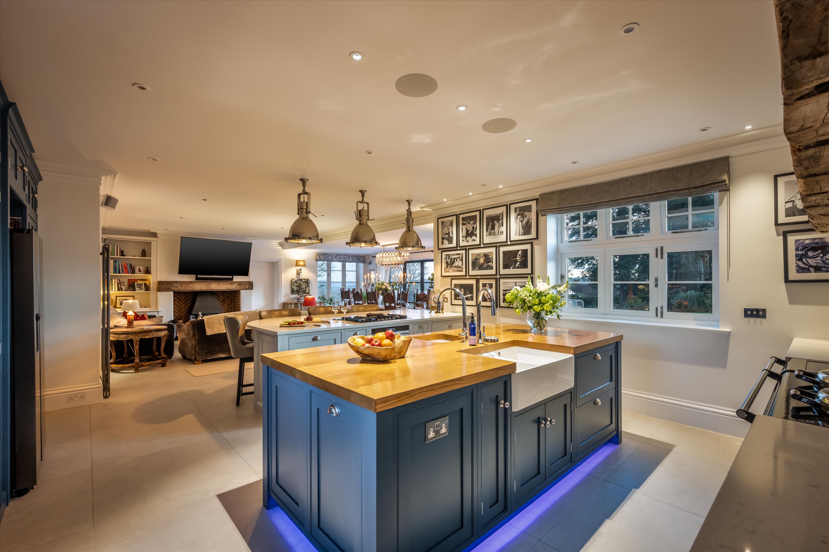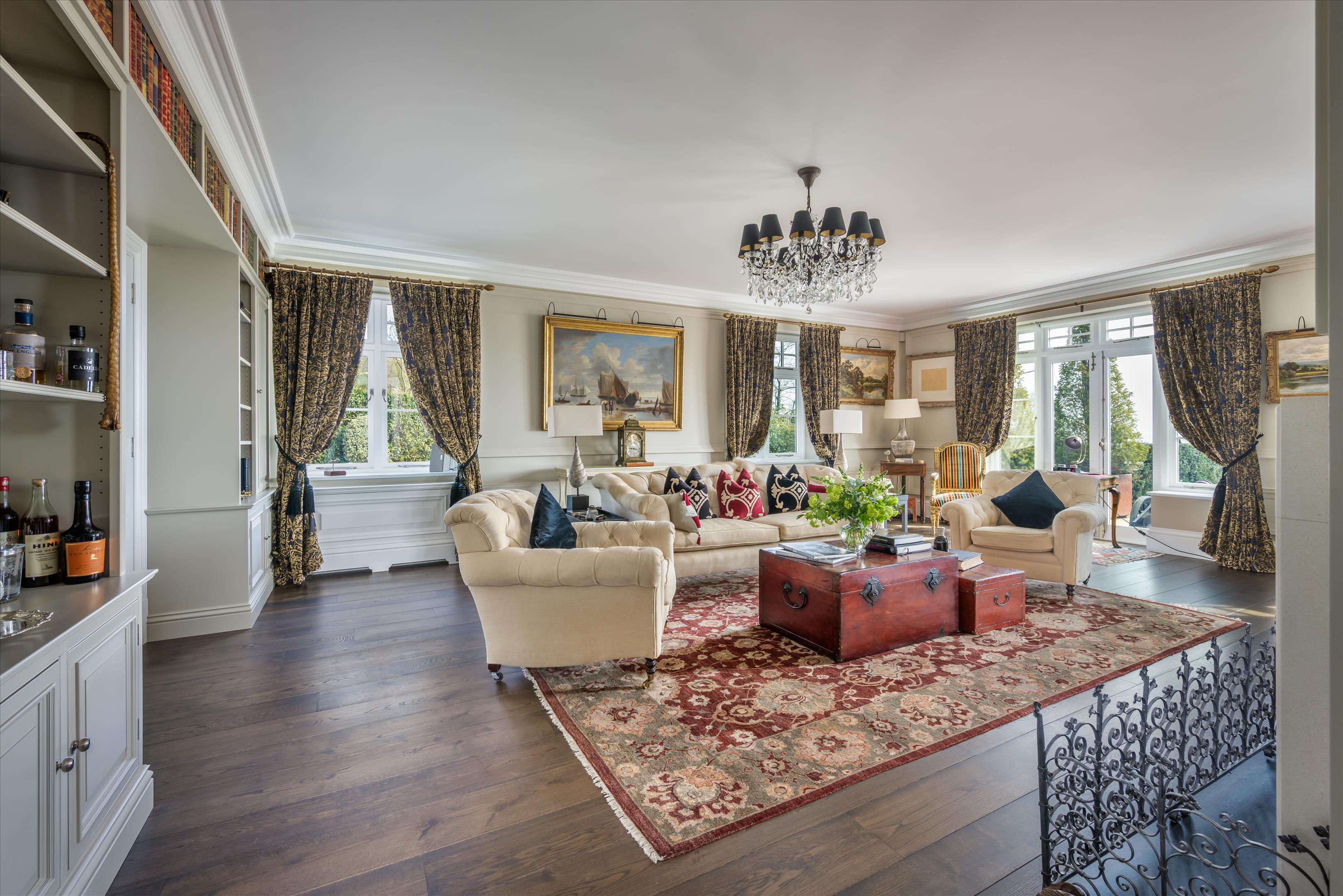 The house flows beautifully and offers a series of well-proportioned reception rooms with impressive ceiling heights. Of particular note are the spacious drawing room, elegant dining room and pool room. The open plan kitchen/breakfast room includes white granite surfaces, an AGA and partially vaulted breakfast area, with floor to ceiling Crittall door windows which accentuate the views even further.