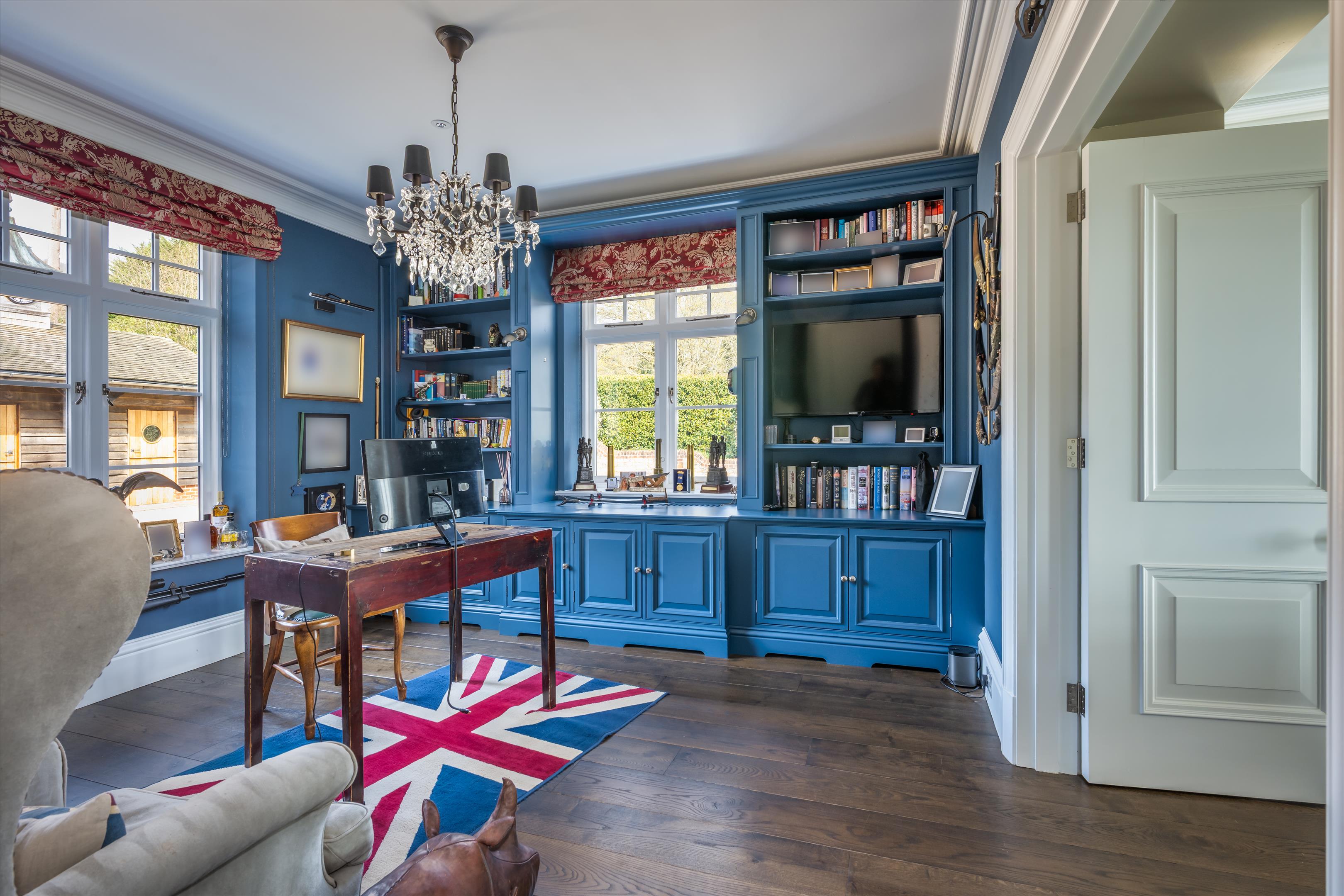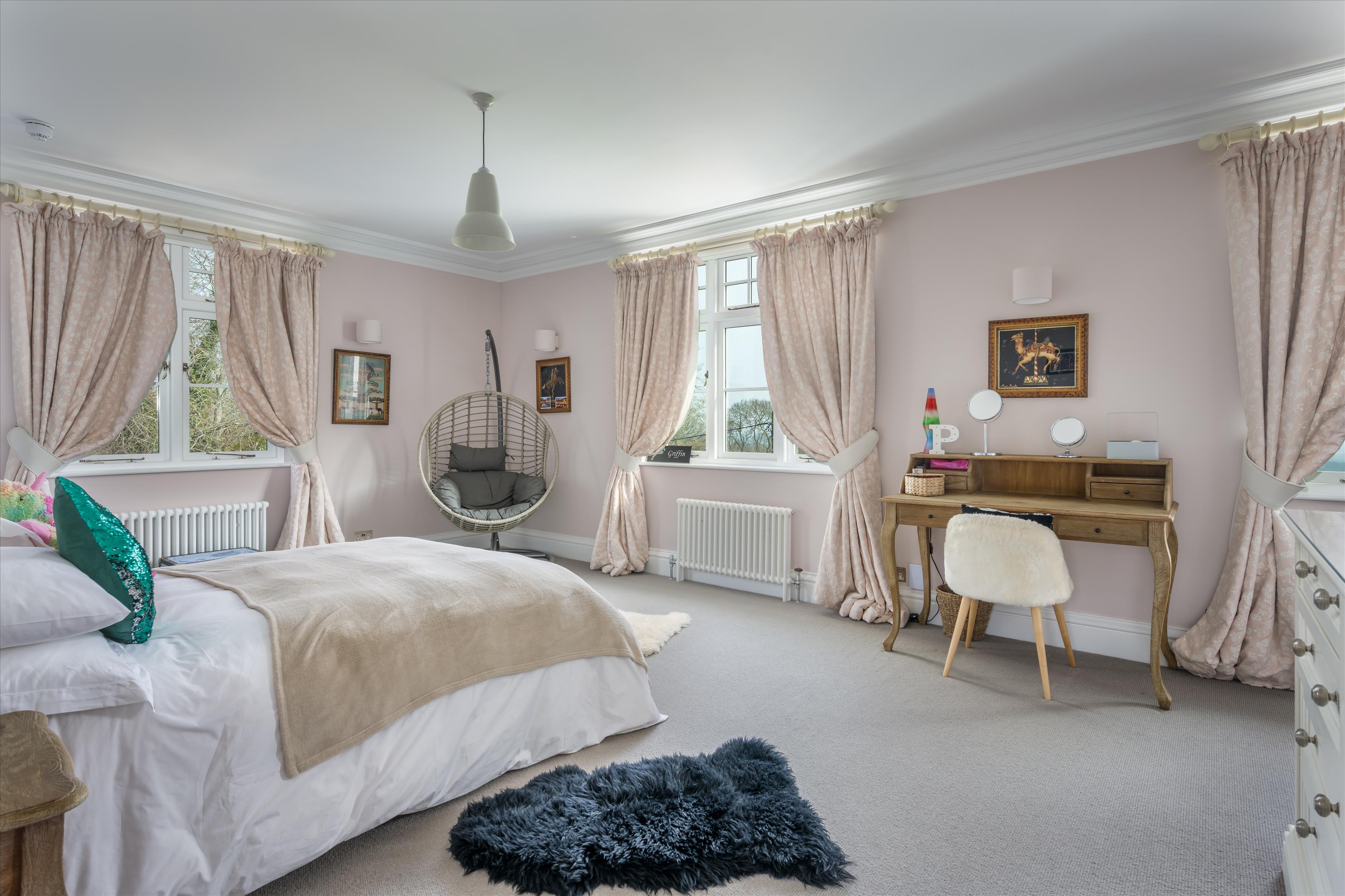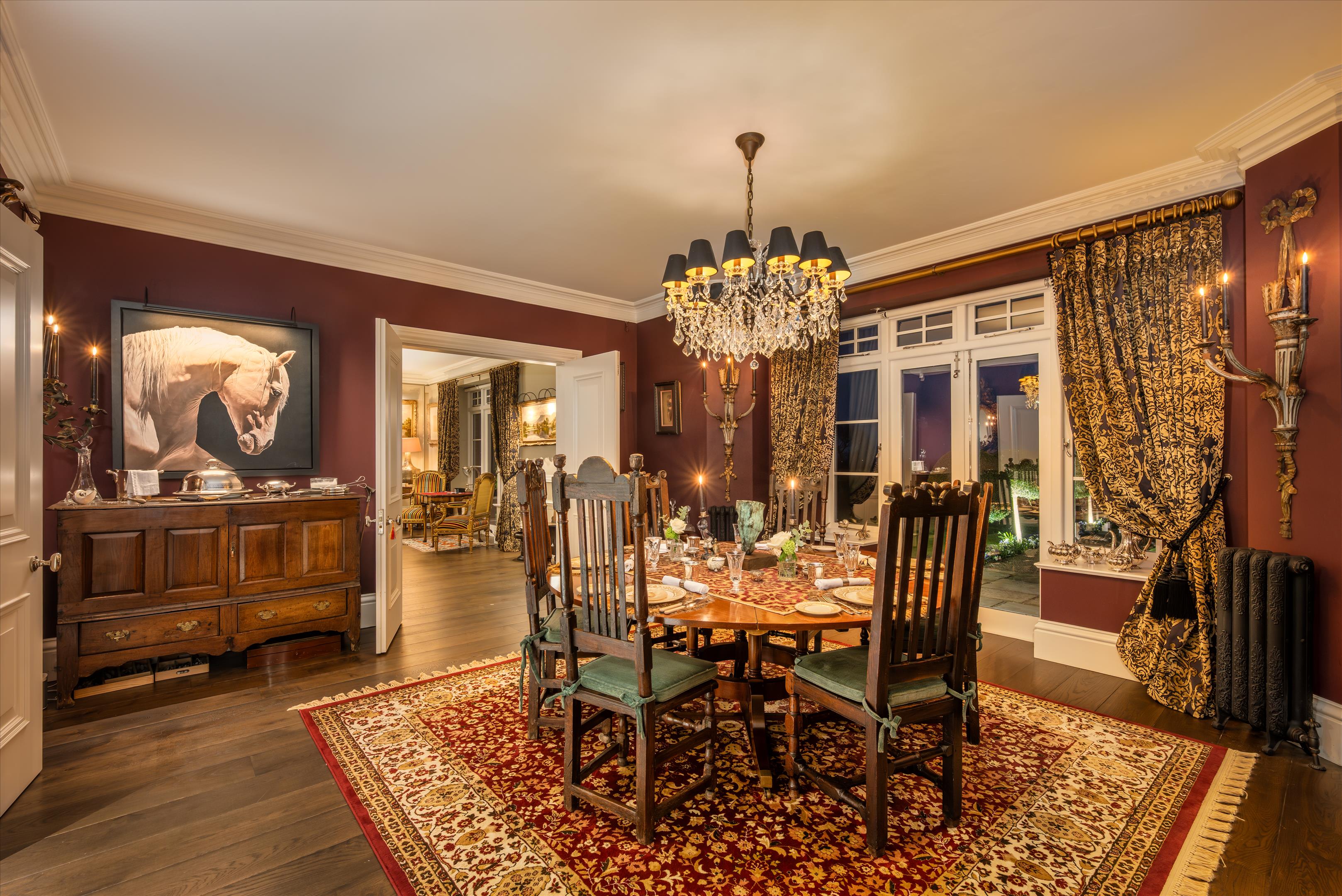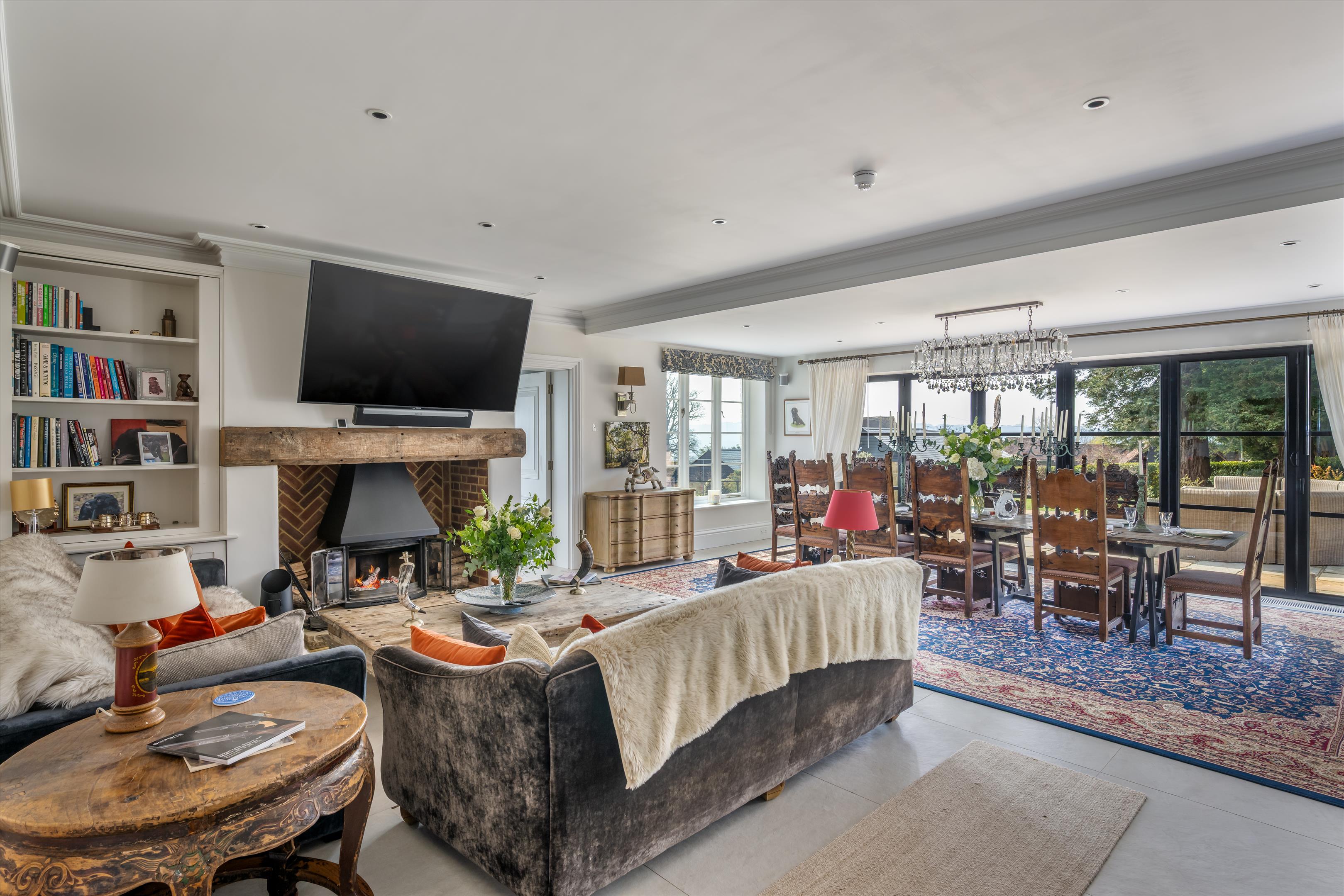 The house flows beautifully and offers a series of well-proportioned reception rooms with impressive ceiling heights. Of particular note are the spacious drawing room, elegant dining room and pool room. The open plan kitchen/breakfast room includes white granite surfaces, an AGA and partially vaulted breakfast area, with floor to ceiling Crittall door windows which accentuate the views even further.