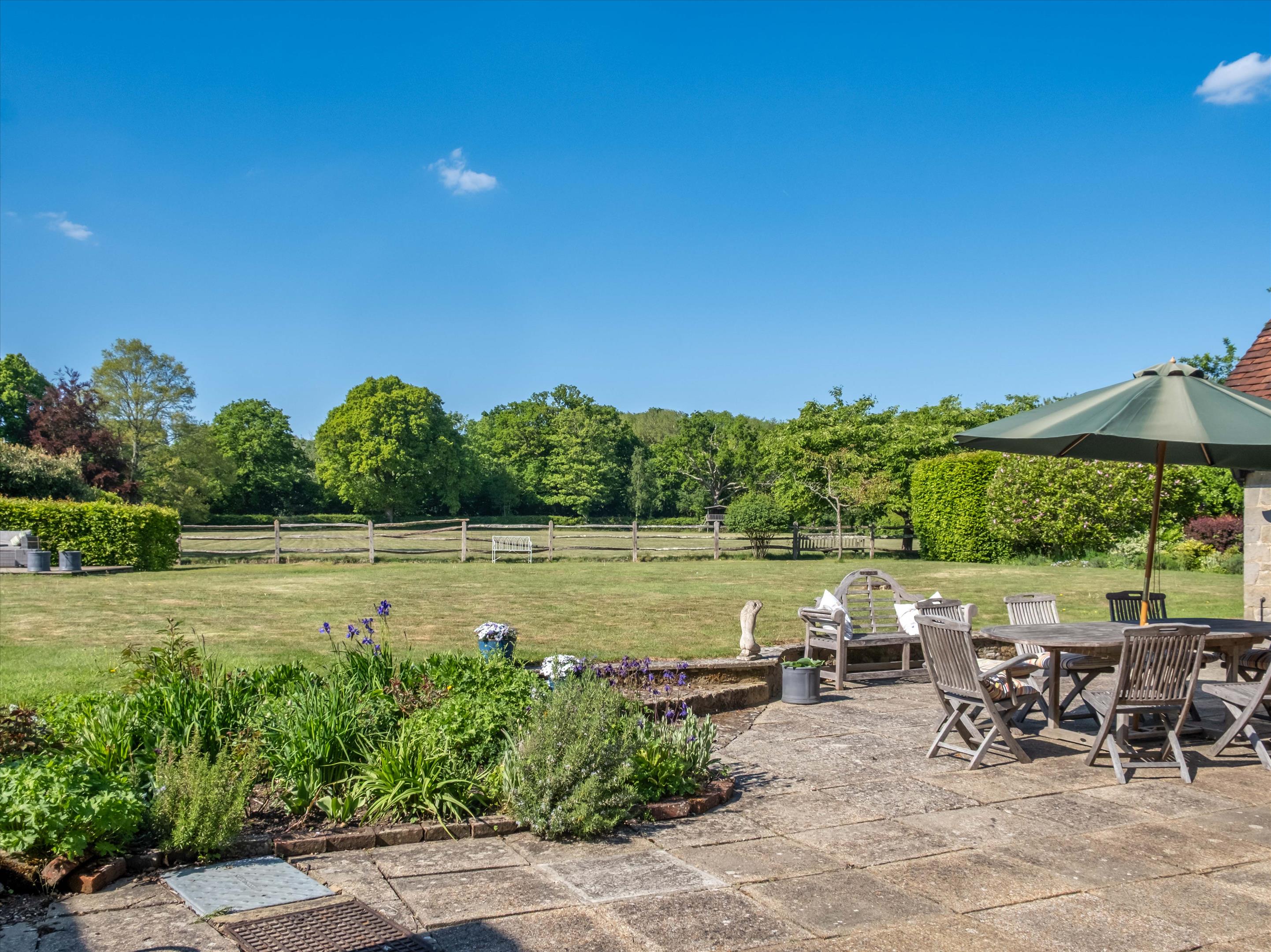 The property is accessed via an old farm gate into a gravelled courtyard providing parking for numerous cars. To the rear of the property the main house is bounded by sun terraces and formal lawns, with established shrub borders and a kitchen garden. Beyond this and separated from the main gardens via a post-and-rail fence, is the meadow, with the whole property being bounded by mature trees allowing for great privacy.