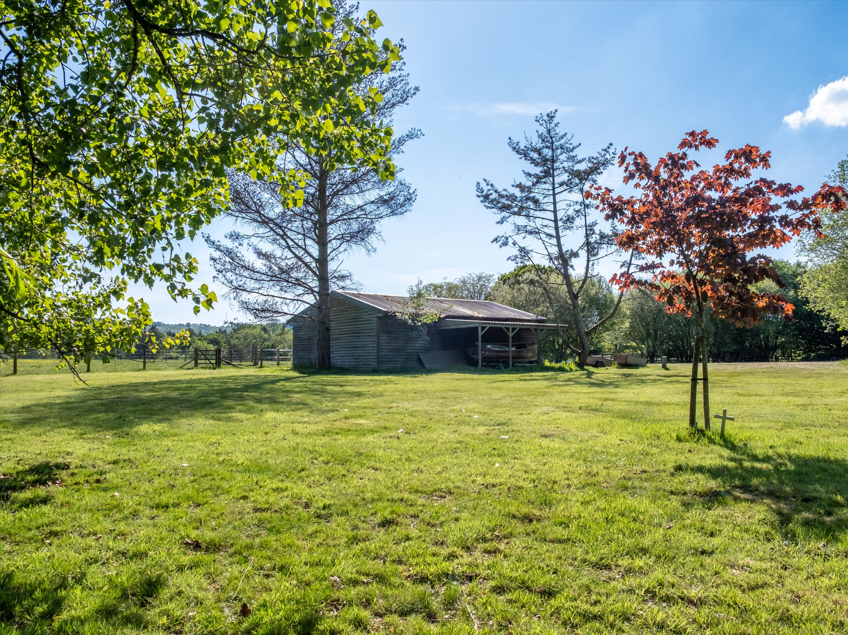Across the farm lane from the main house is a secondary area of land which is currently used for the grazing of horses and has historically been used to graze sheep. Here lies the agricultural barn, currently used for storage and a small paddock.