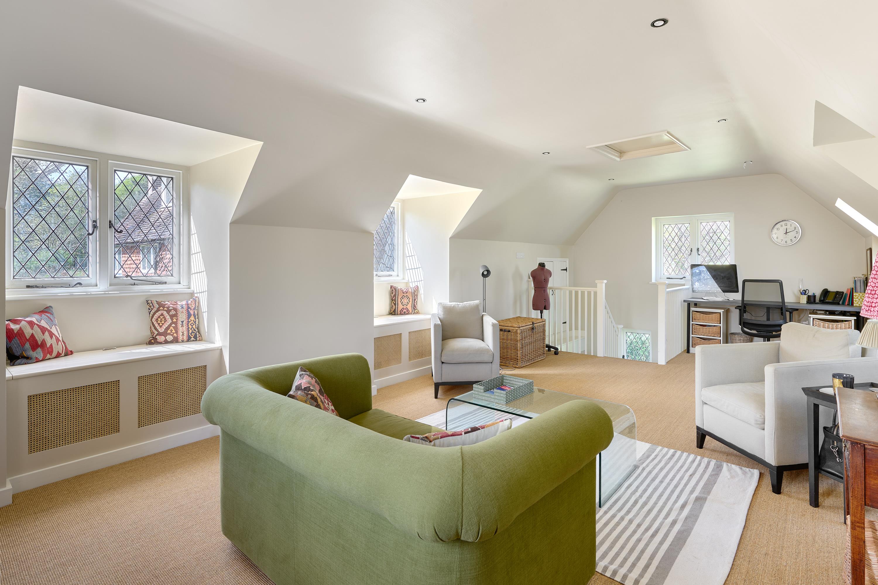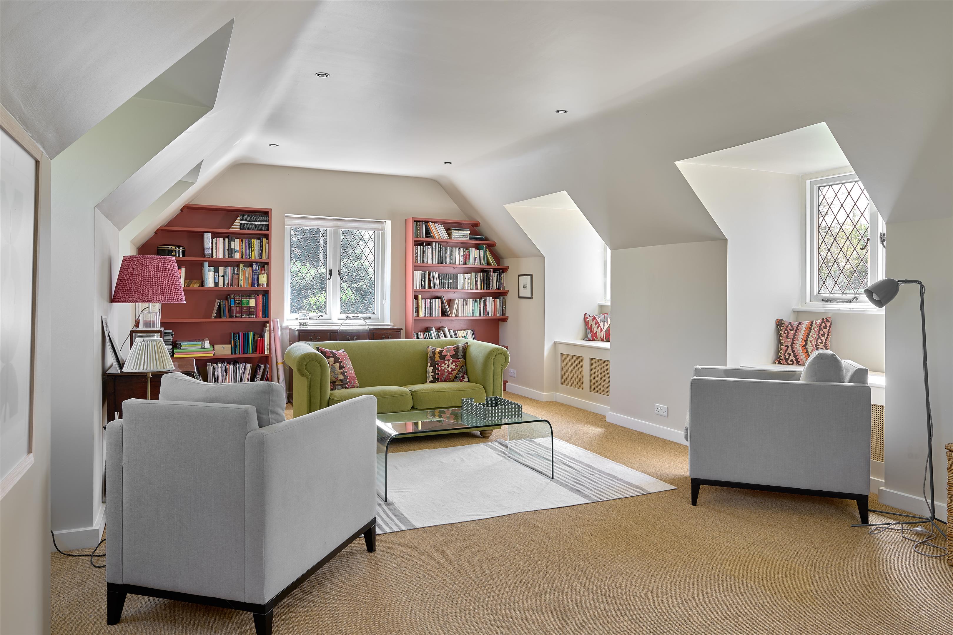 To the first and second floors are accessed by either of the two staircases in the main house, there are five good-sized bedrooms currently, two of which have bathrooms en suite, and there is a family bathroom. Additionally, are a den/occasional bedroom on the second floor and an unmodernized bedroom with provision for a bathroom en suite. The principal bedroom is located in the more recent 20th Century part of the property, has an en suite bathroom, built-in storage, and an attractive fireplace. The bedrooms have comfortable ceiling heights and enjoy wonderful surrounding aspects of the grounds with plentiful natural light throughout the day. Notably above the integral garage is a superb and highly versatile room currently used as a study with sisal carpets, aspects on all four sides, and window seats.