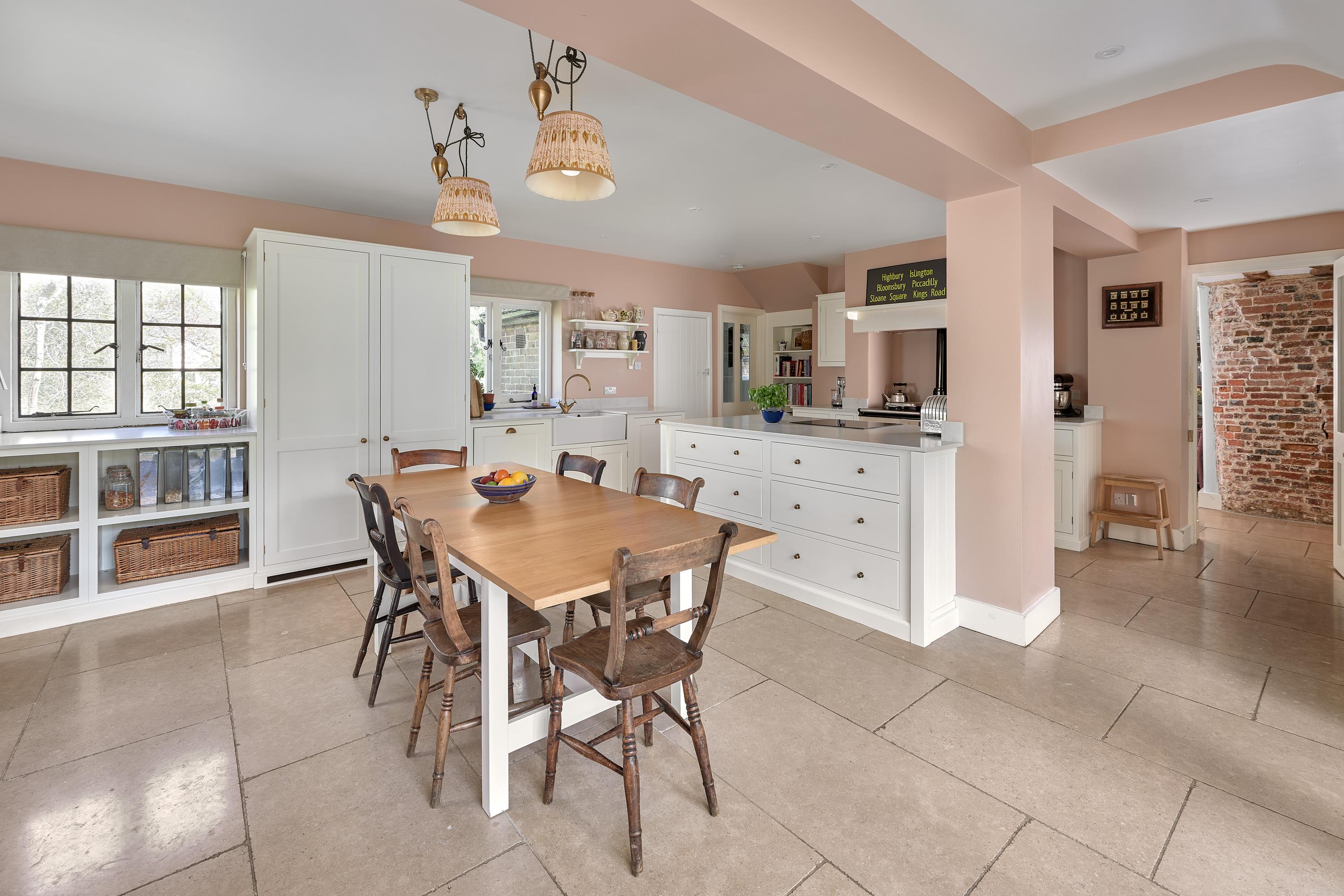 Upon entering the house via the large covered oak porch, one is greeted by an elegantly proportioned entrance hall with a wood burning stove and limestone flooring. Adjacent is the drawing room with a substantial inglenook fireplace with a small bench seat on one side, a dual aspect featuring some of the leaded light windows, and sisal carpets. Beyond is the living room and playroom, with a further fireplace and wood burning stove and well-placed storage cupboards. The kitchen/breakfast room is the heart of the home featuring an AGA, new Devol kitchen with quartz tops throughout, an island with plentiful storage and integrated electric oven with induction hob. Sash windows and large glass doors to the north and west allow the room to be filled with light throughout the day, and the room additionally benefits from a double Belfast sink, further storage and a pantry. Further to the ground floor are the dining room, and adjacent to the garage a utility room and WC.