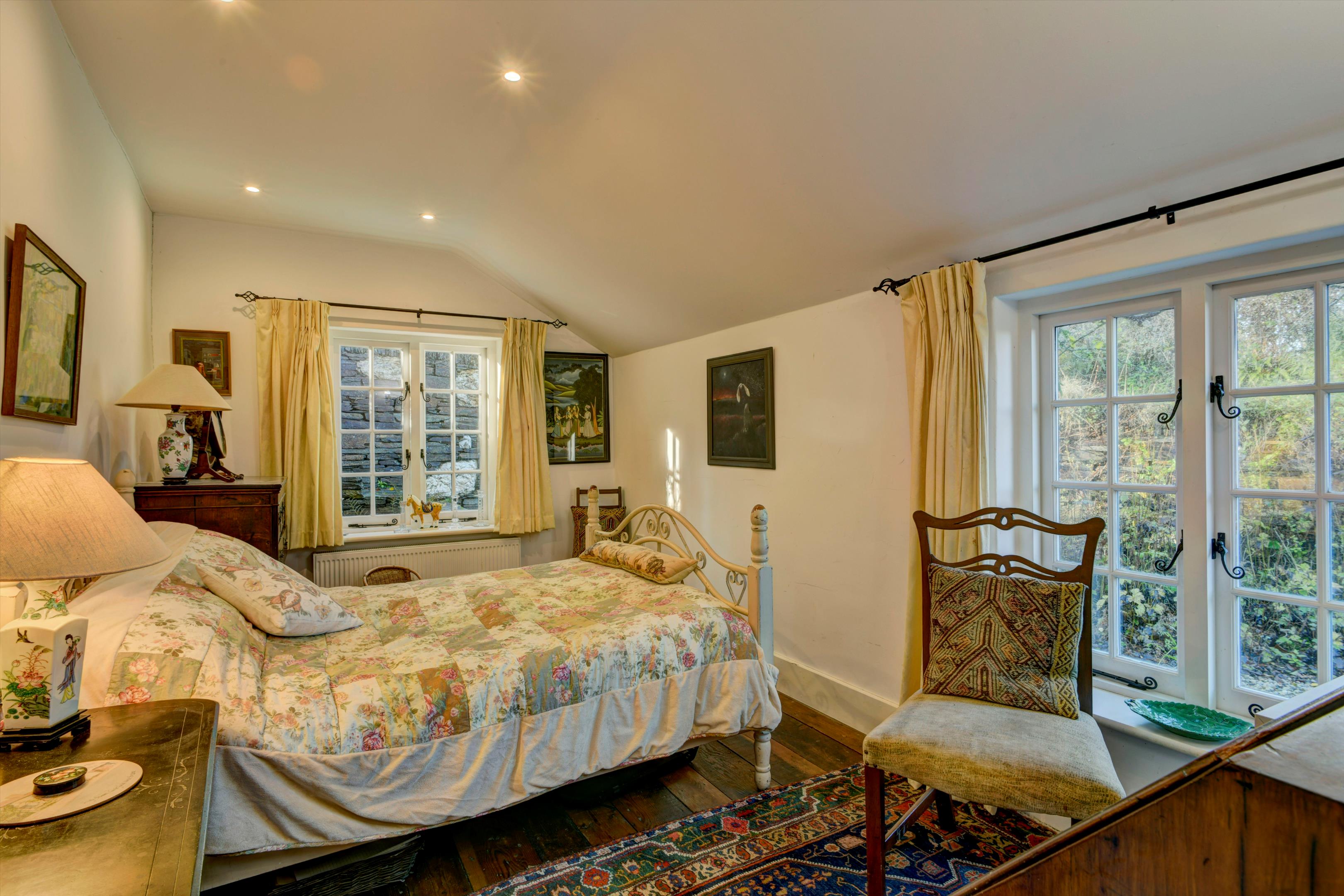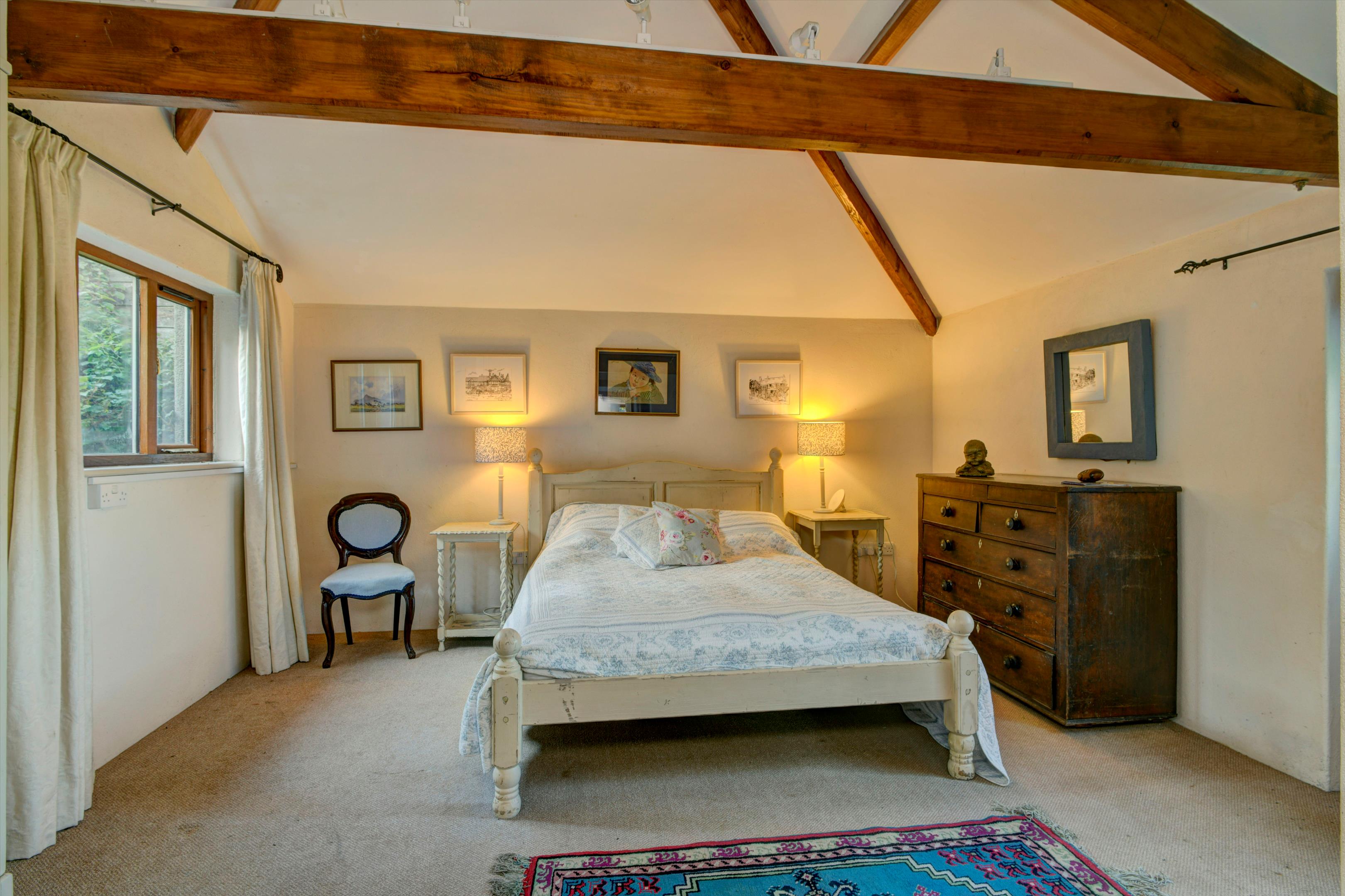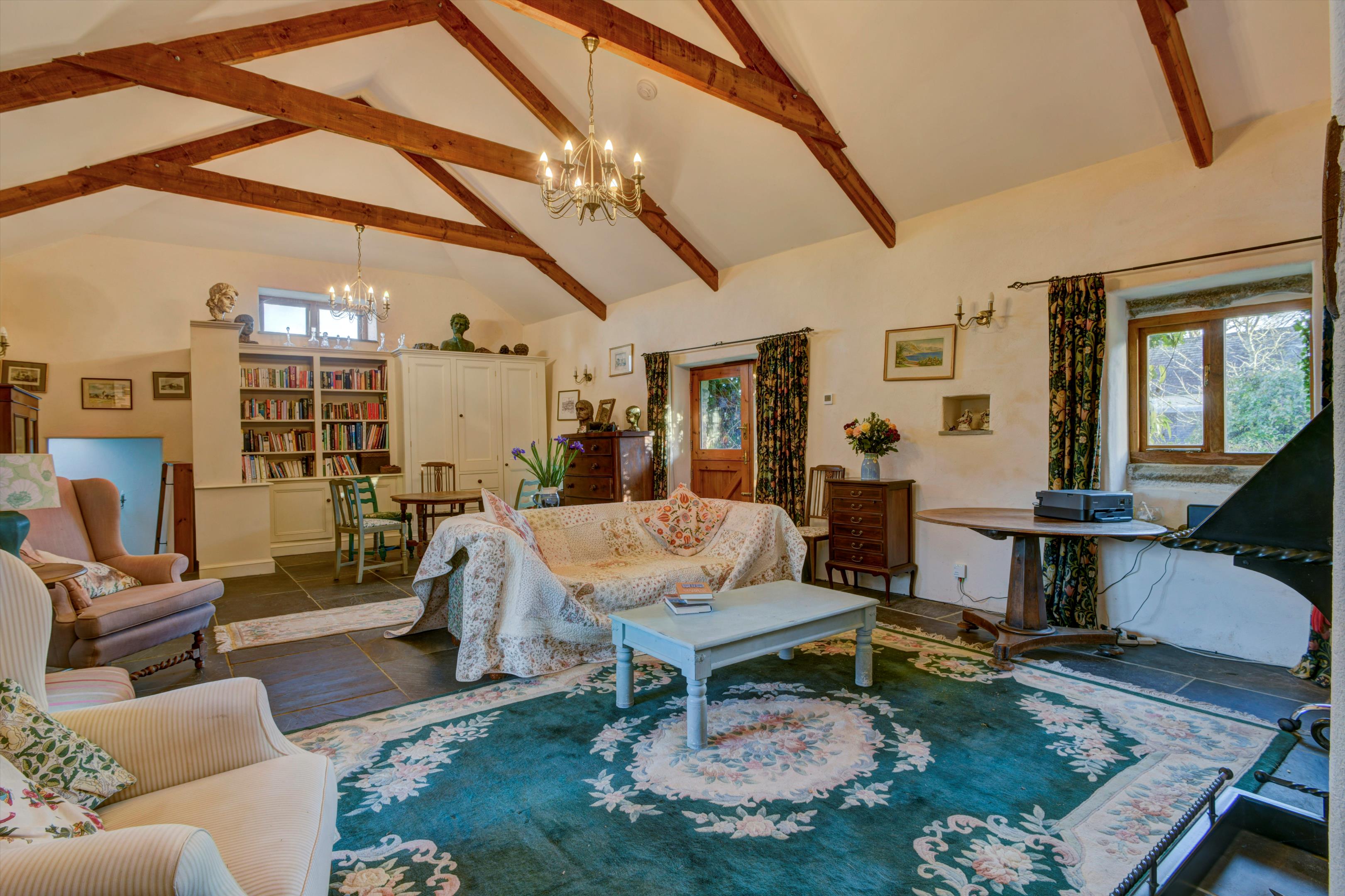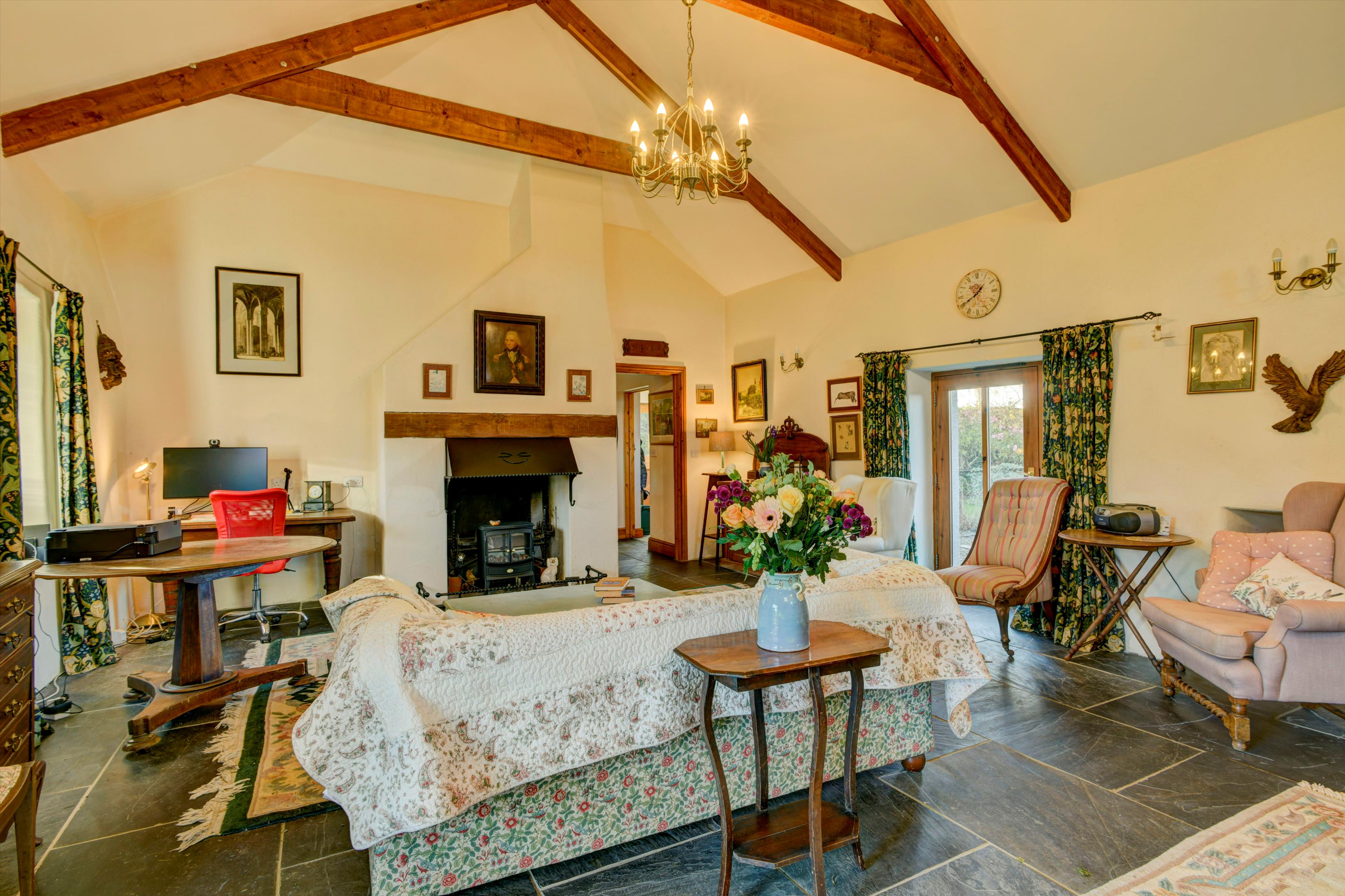 To the rear of the farmhouse is a separate, self-contained converted barn featuring an open fire and exposed roof timbers. The barn includes a fitted kitchen, two bedrooms, and a WC with wash basin off the main bedroom, as well as two fully fitted shower rooms. Underfloor heating runs throughout the barn.