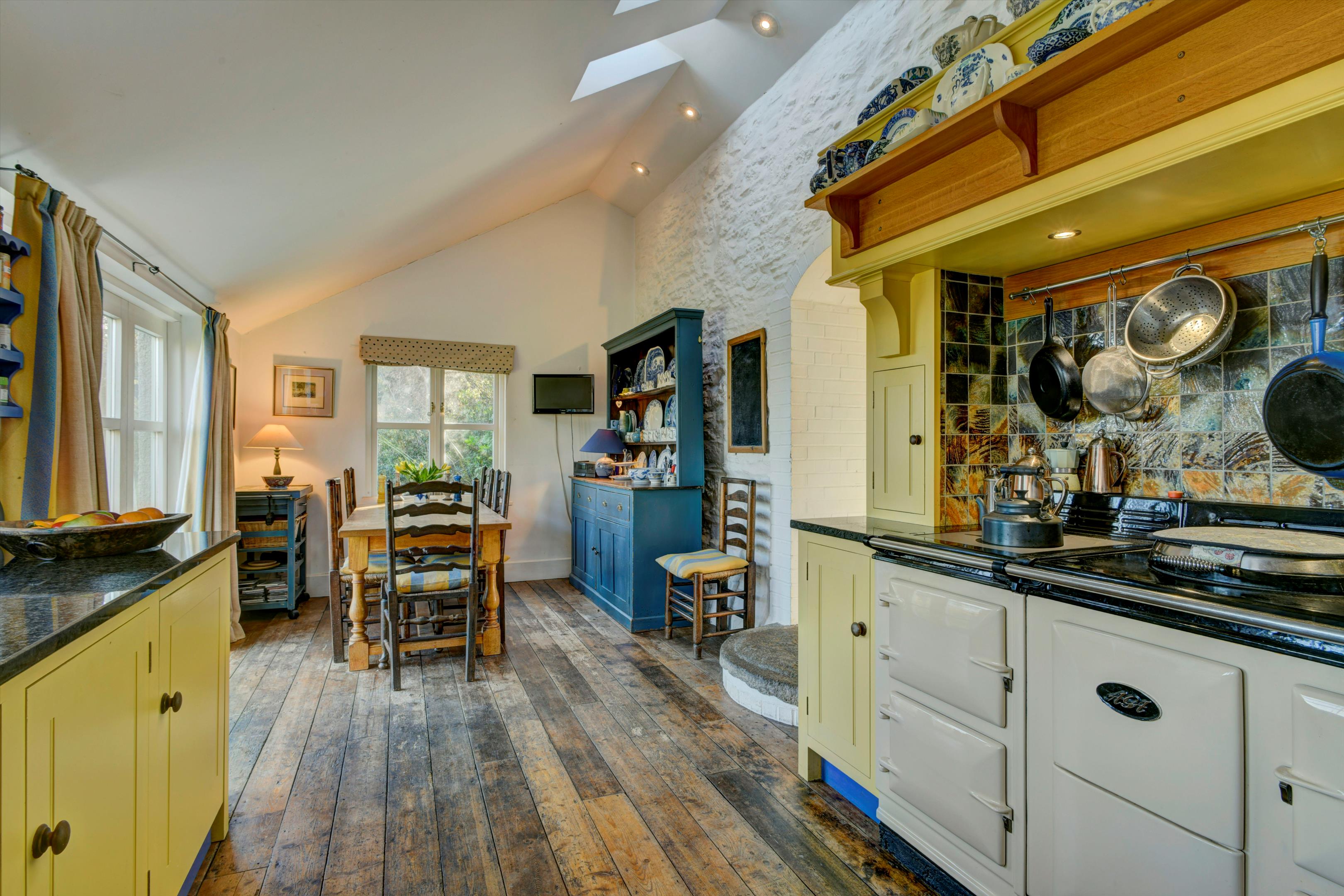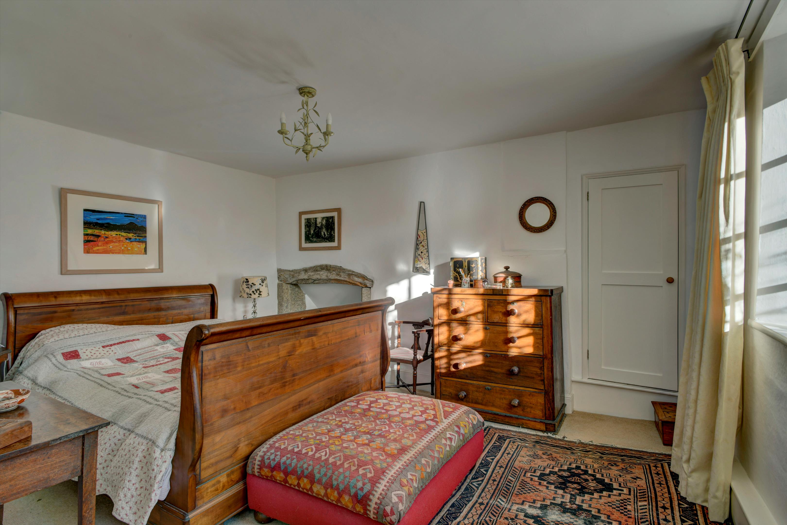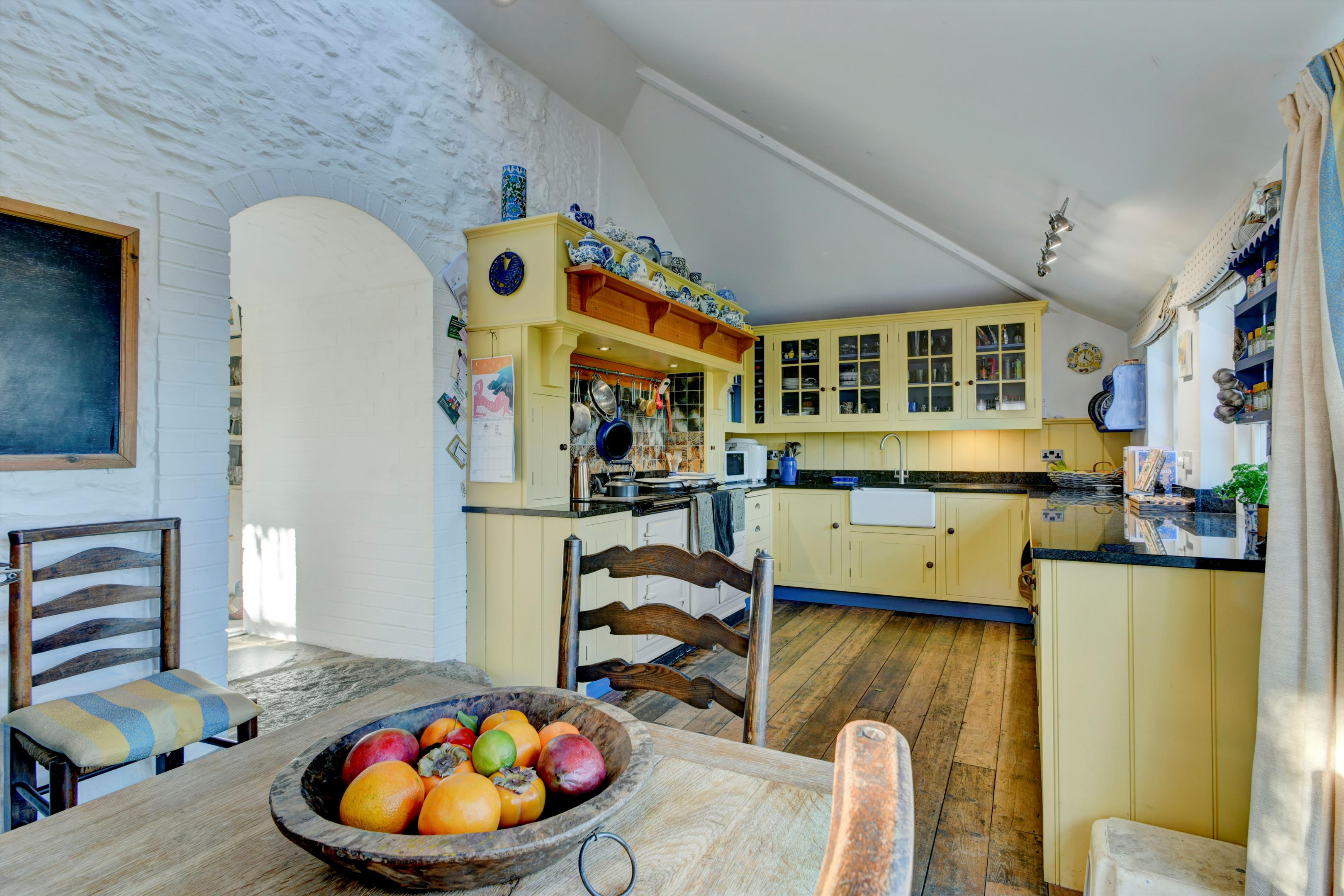The stone arched door into the porch, within the two storey projecting gable, leads into the cross passage hall with a sitting room with a stone fireplace and woodburner to one side and dining room with AGA to the other, both with exposed beams and an ancient mullioned window. There is also a utility room and a large traditional walk-in pantry. Off the dining room is the fully fitted kitchen/breakfast room with electric Aga and with French doors to the gardens.