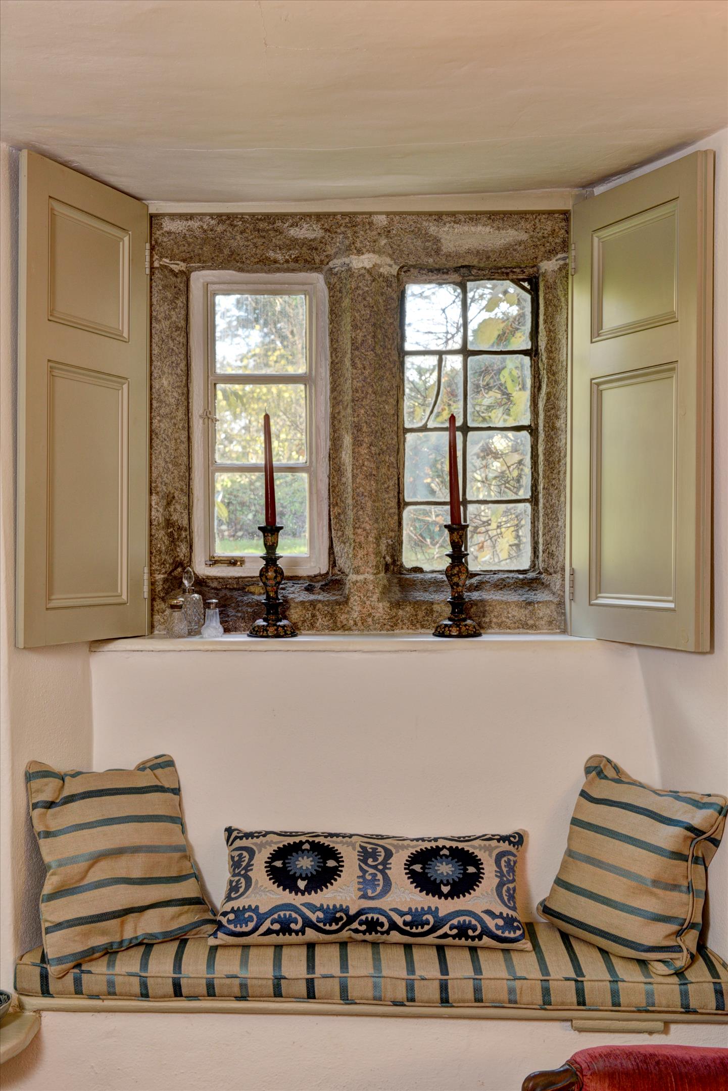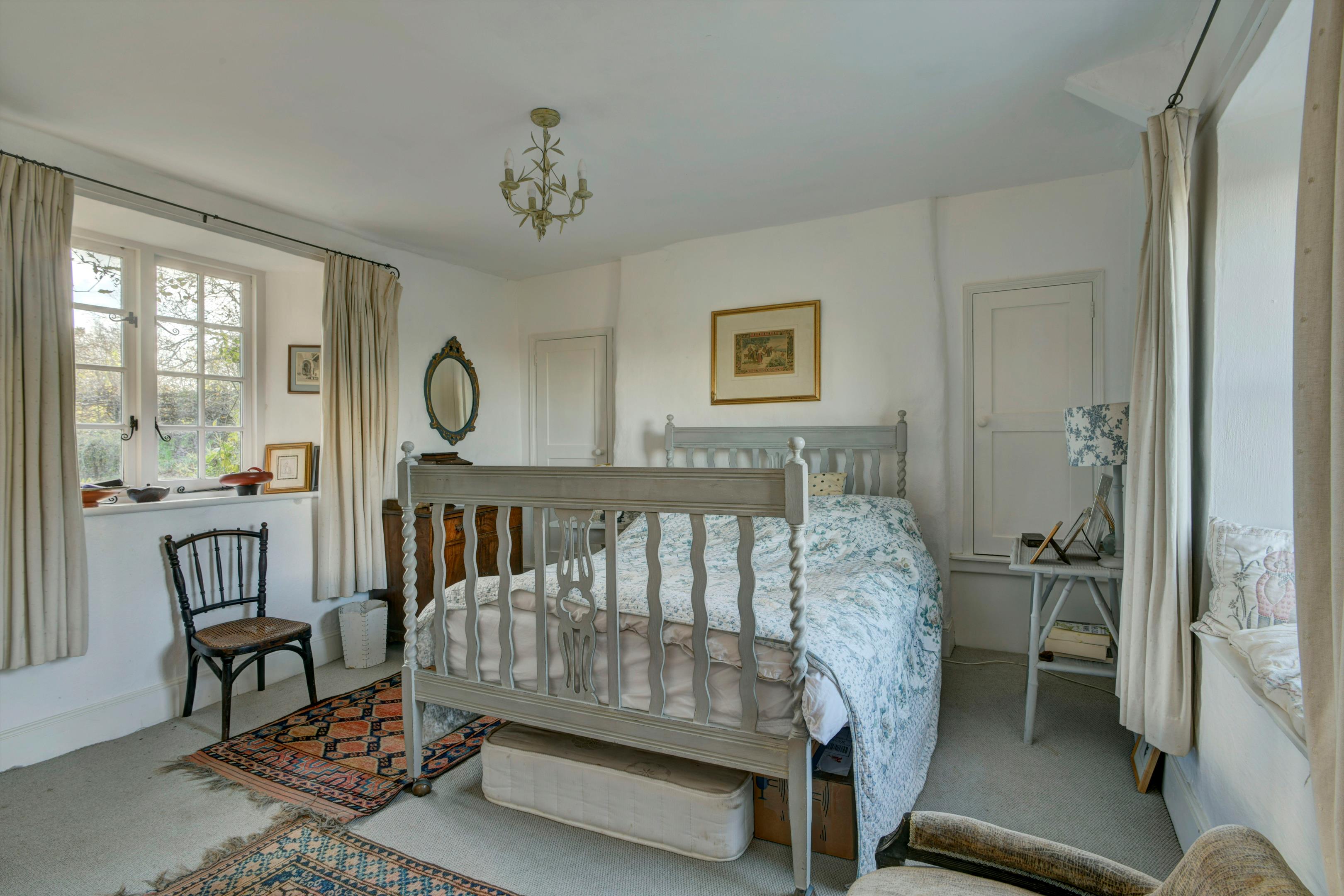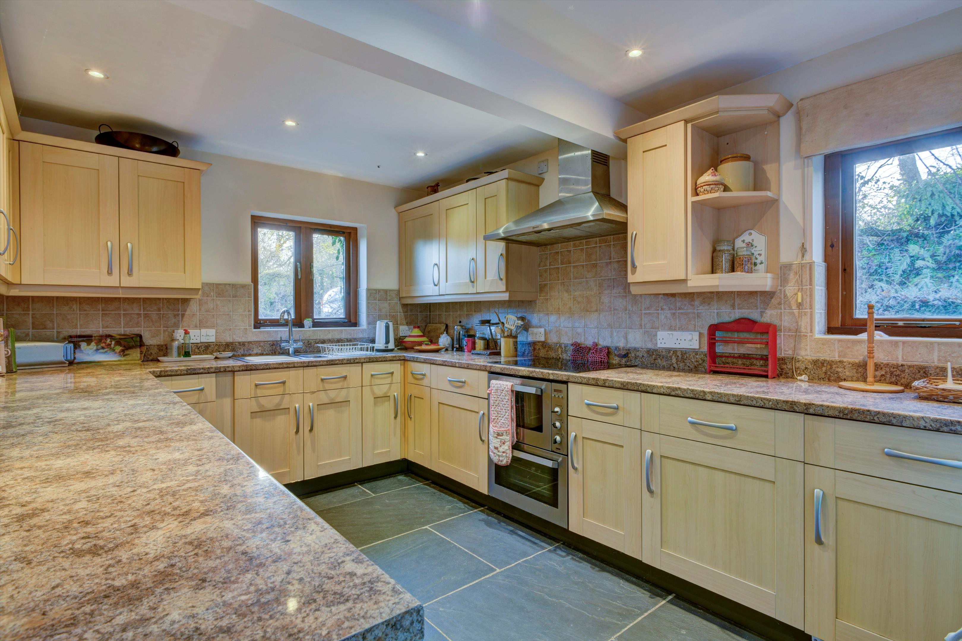 The stone arched door into the porch, within the two storey projecting gable, leads into the cross passage hall with a sitting room with a stone fireplace and woodburner to one side and dining room with AGA to the other, both with exposed beams and an ancient mullioned window. There is also a utility room and a large traditional walk-in pantry. Off the dining room is the fully fitted kitchen/breakfast room with electric Aga and with French doors to the gardens.