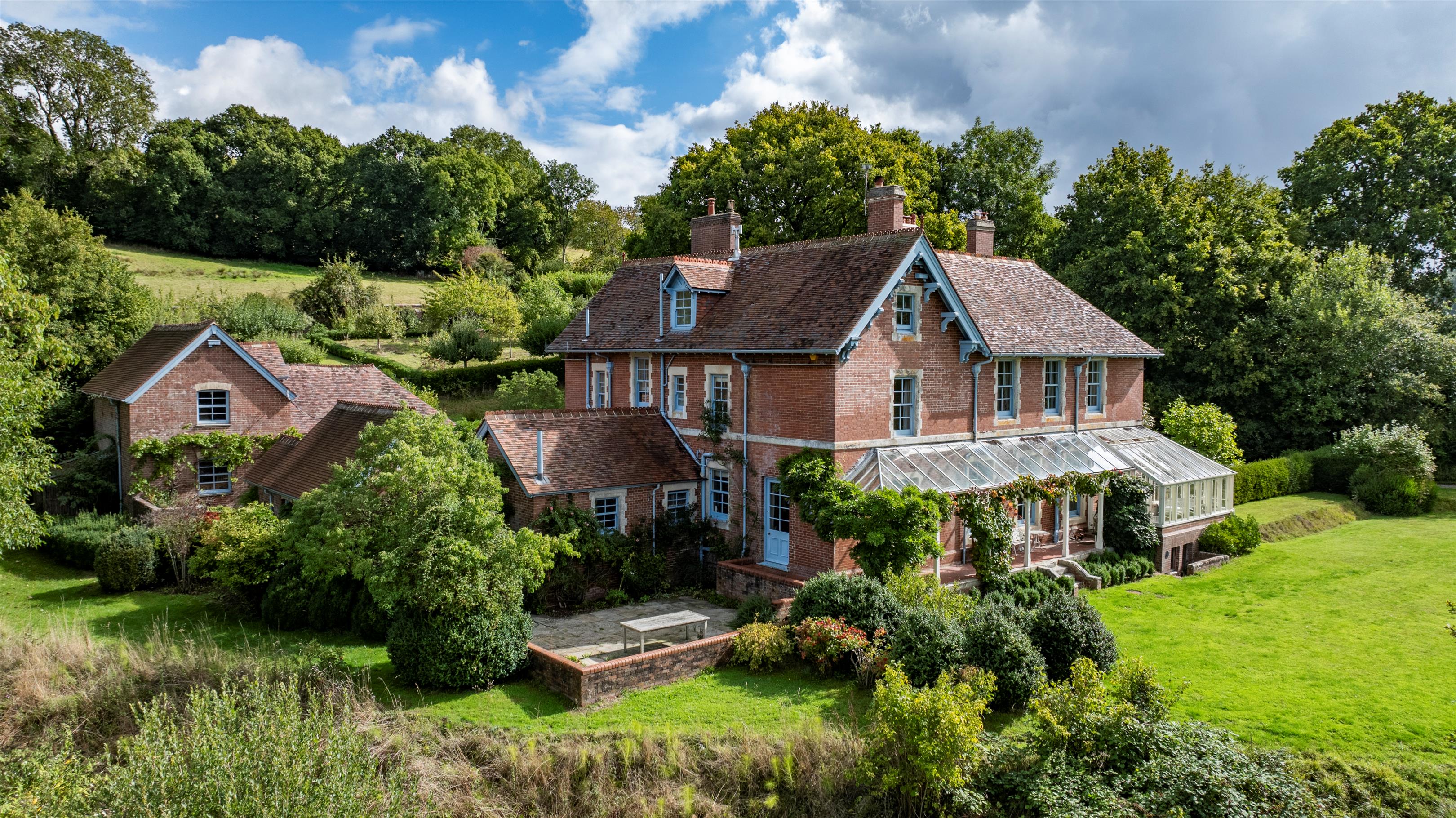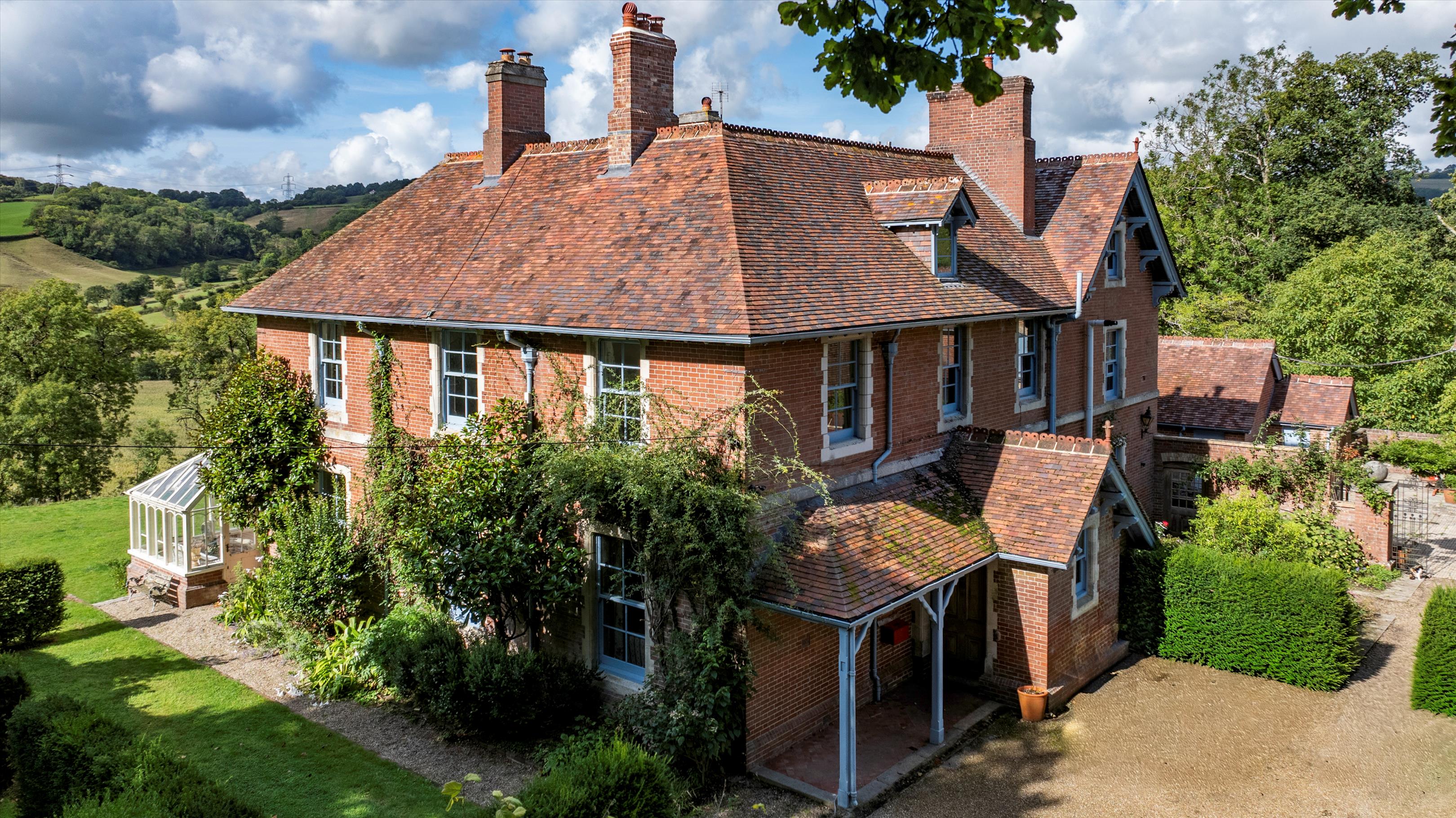 Set up on the side of the unspoilt, pretty valley carrying the River Yarty as it flows down from the Blackdown Hills, Yarty House enjoys complete peace and quiet along with lovely, far-reaching views over the surrounding countryside. The house is an impressive, unlisted family house with over 6,500 sq ft of living space. It is built of red brick with two storeys under a plain clay tile roof with deep eaves, tall 12 pane sash windows with dressed sandstone surrounds and an elegant, glazed veranda overlooking the garden. In addition, the property has an upper floor within the roof space plus a suite of cellars below the ground floor. Internally it has well-proportioned