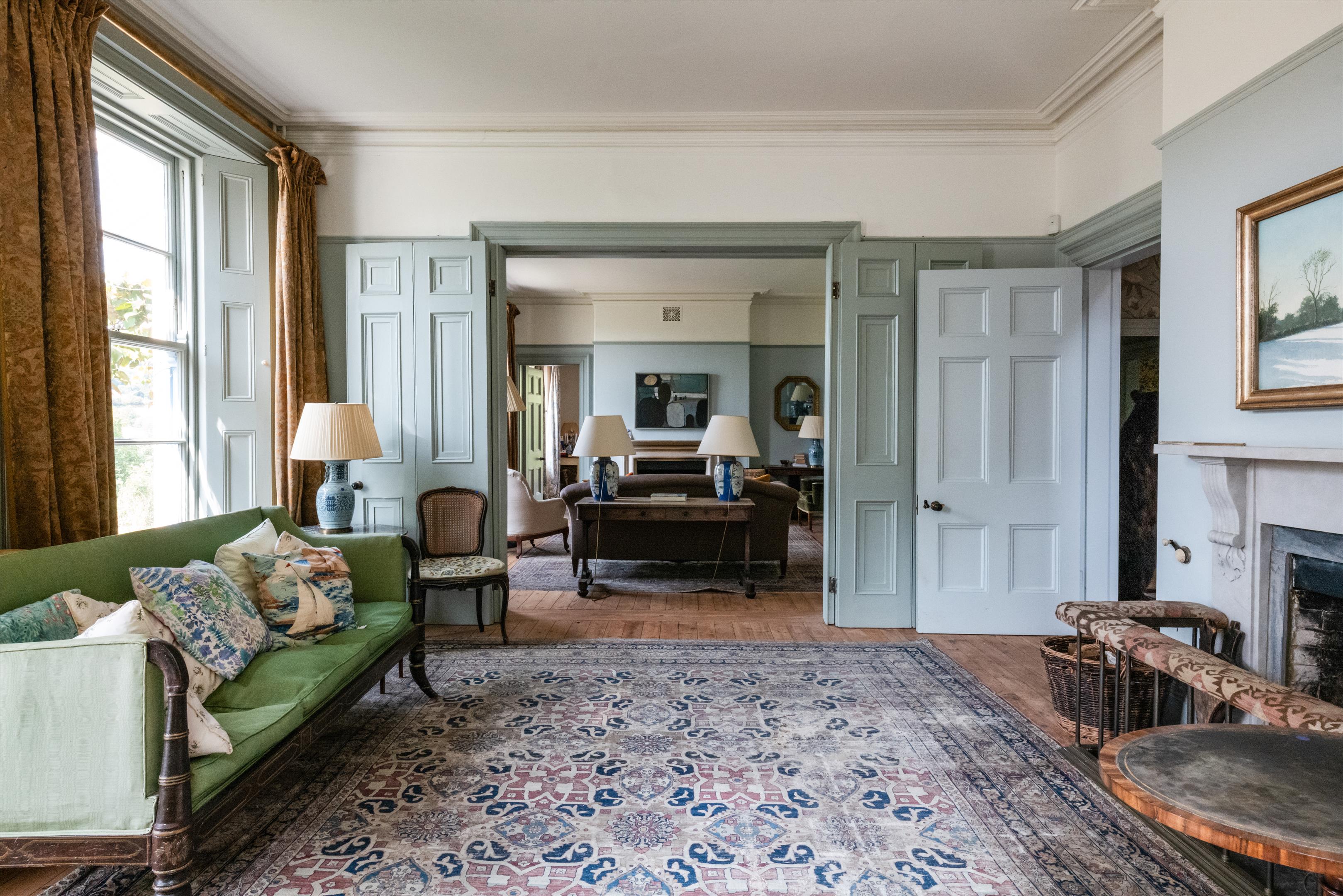 rooms with high ceilings, all grouped around a central hall and first floor landing. Overall, the house has a wonderful feeling of charm and space and has retained most of its original fittings including several fireplaces and copious internal joinery including panelled doors, working shutters and window seats. The ground floor has four principal reception rooms, with the sitting and drawing rooms connected by a pair of doors that create a large entertainment space when opened. In addition, the ground floor has a conservatory off one end of the veranda and a large kitchen/breakfast room fitted with a four-oven AGA. Upstairs there are a total of eight double bedrooms, all with lovely views out over lush countryside, plus four bathrooms of which two are en suite.