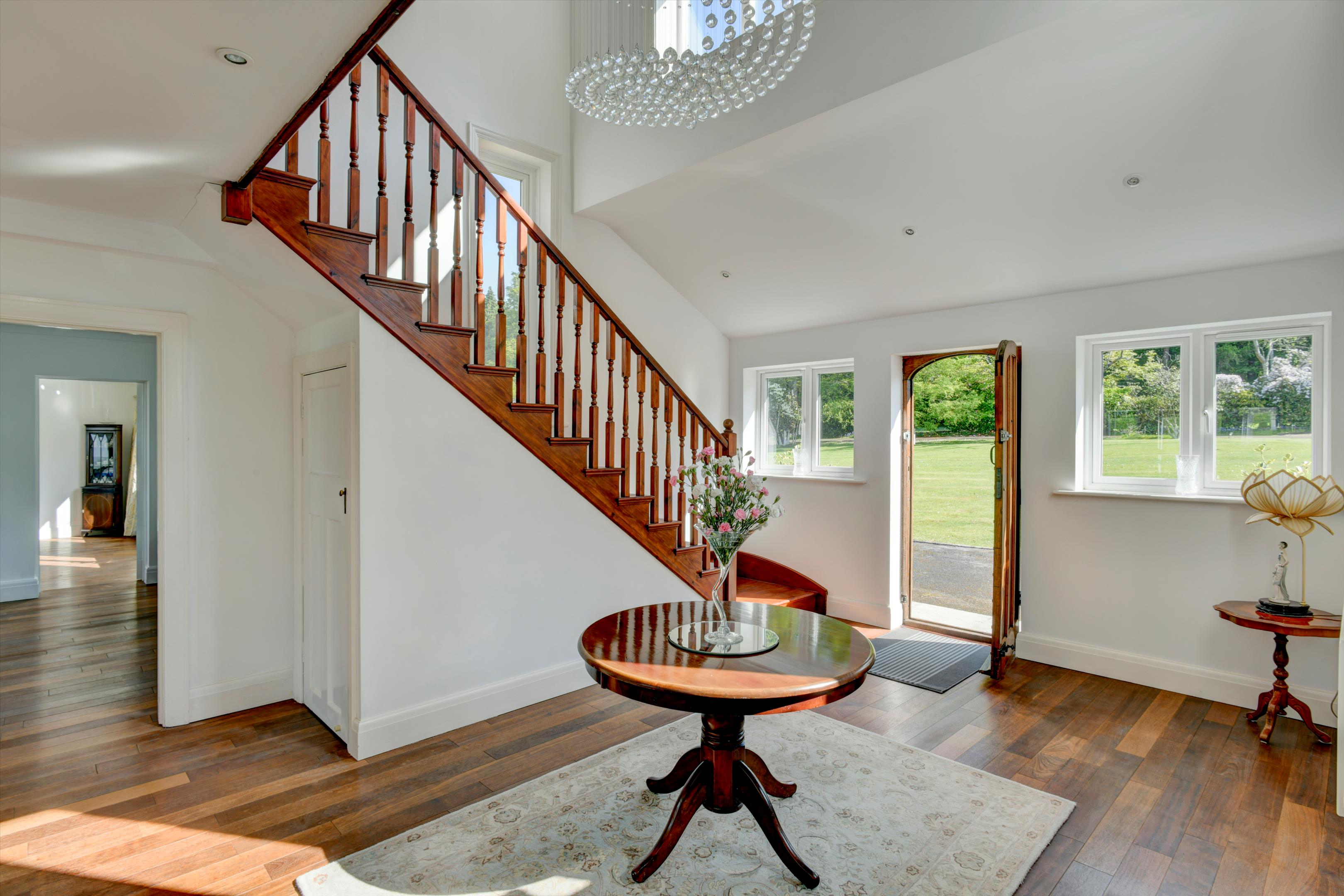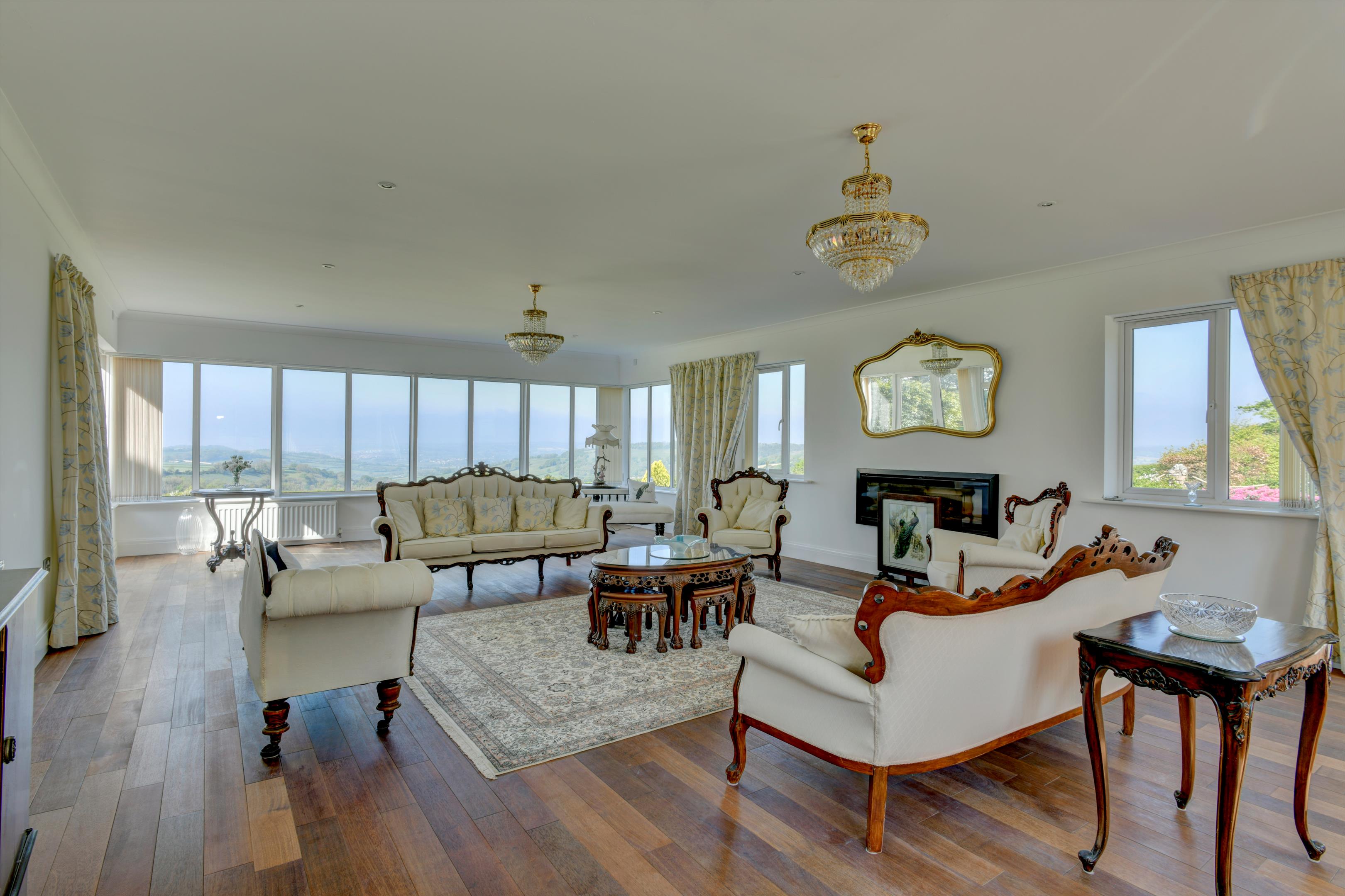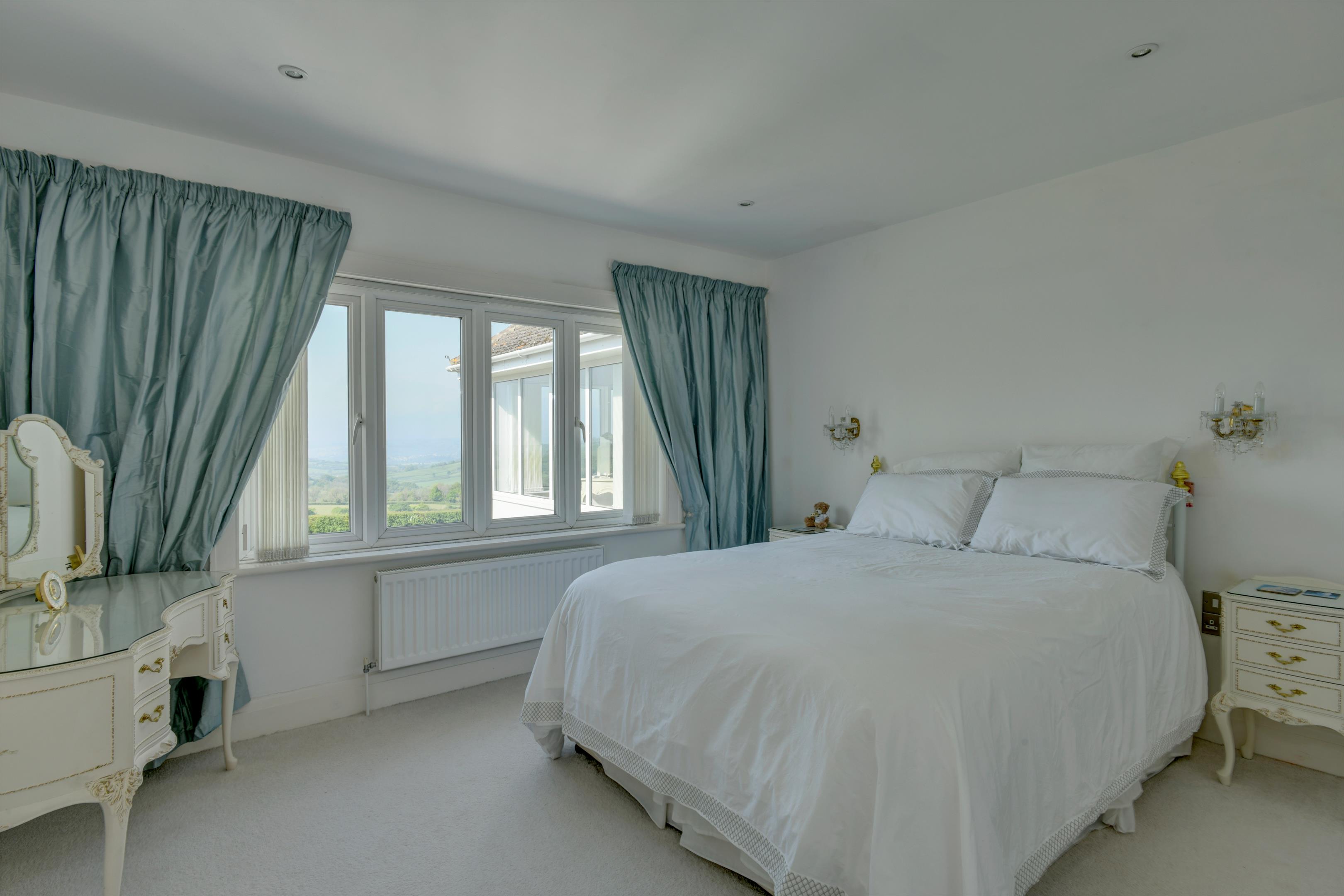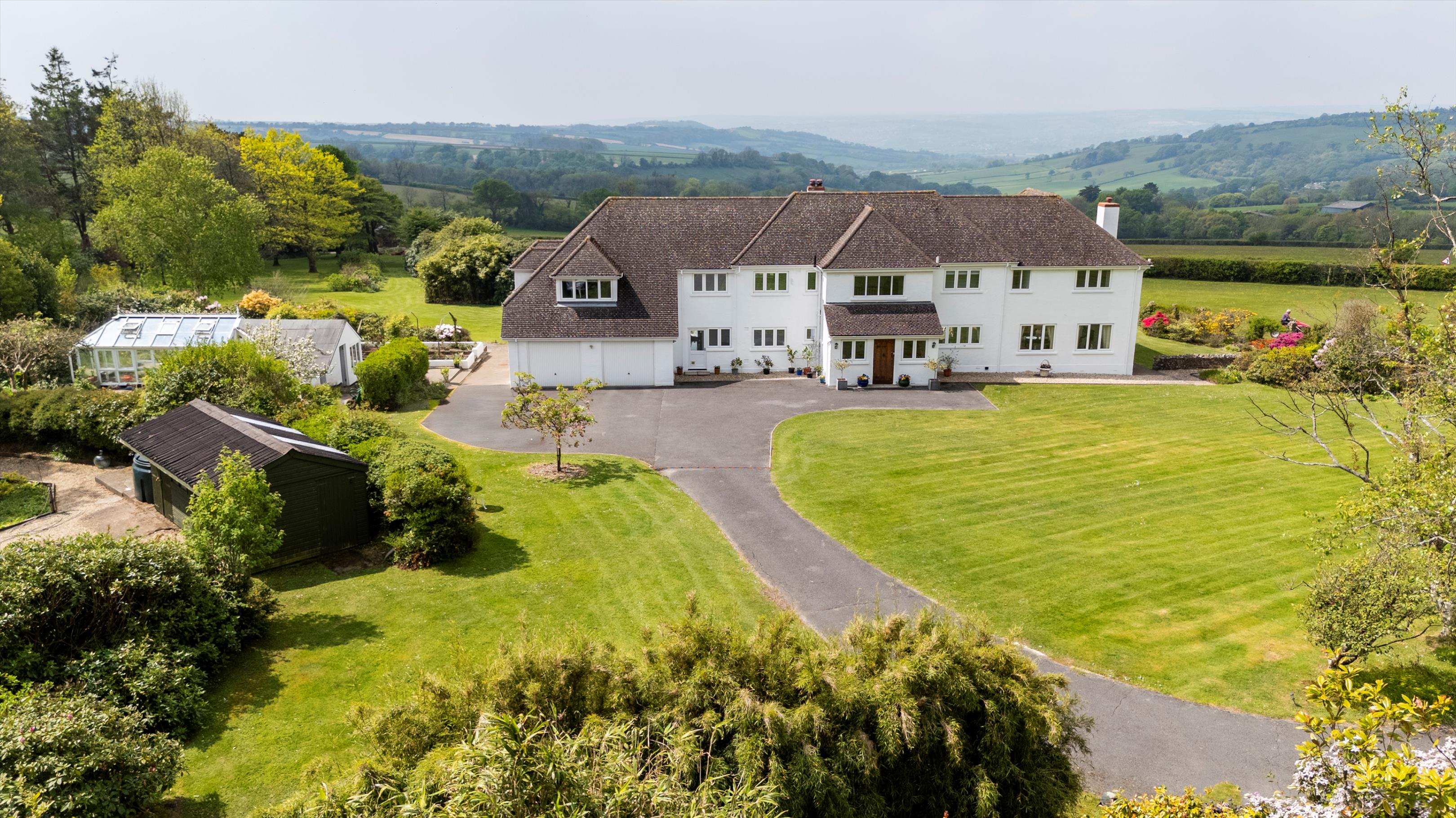 There is no doubt why the location of Hartgrove house was chosen as the spot for a significant country house. This country house enjoys an elevated position that provides unique and magnificent south westerly views across the Axe valley and unspoilt countryside. The house dates back to the 1930s and has been extended and fully renovated to a high standard by the current owners. It has been thoughtfully designed to allow a practical layout for cosy family living, as well as providing a luxurious and spacious environment for entertaining, through purposely designed, well-proportioned reception rooms. The contemporary neutral décor throughout allows for turnkey living, while also easily enabling prospective buyers to add their own personal style. The kitchen and all four reception rooms have French doors which open onto a large terrace which enjoys the south westerly views and is ideal for entertaining guests. Upstairs five bedrooms enjoy the panoramic countryside views whilst the sixth bedroom has a peaceful rural view across the front lawn towards the woodlands.