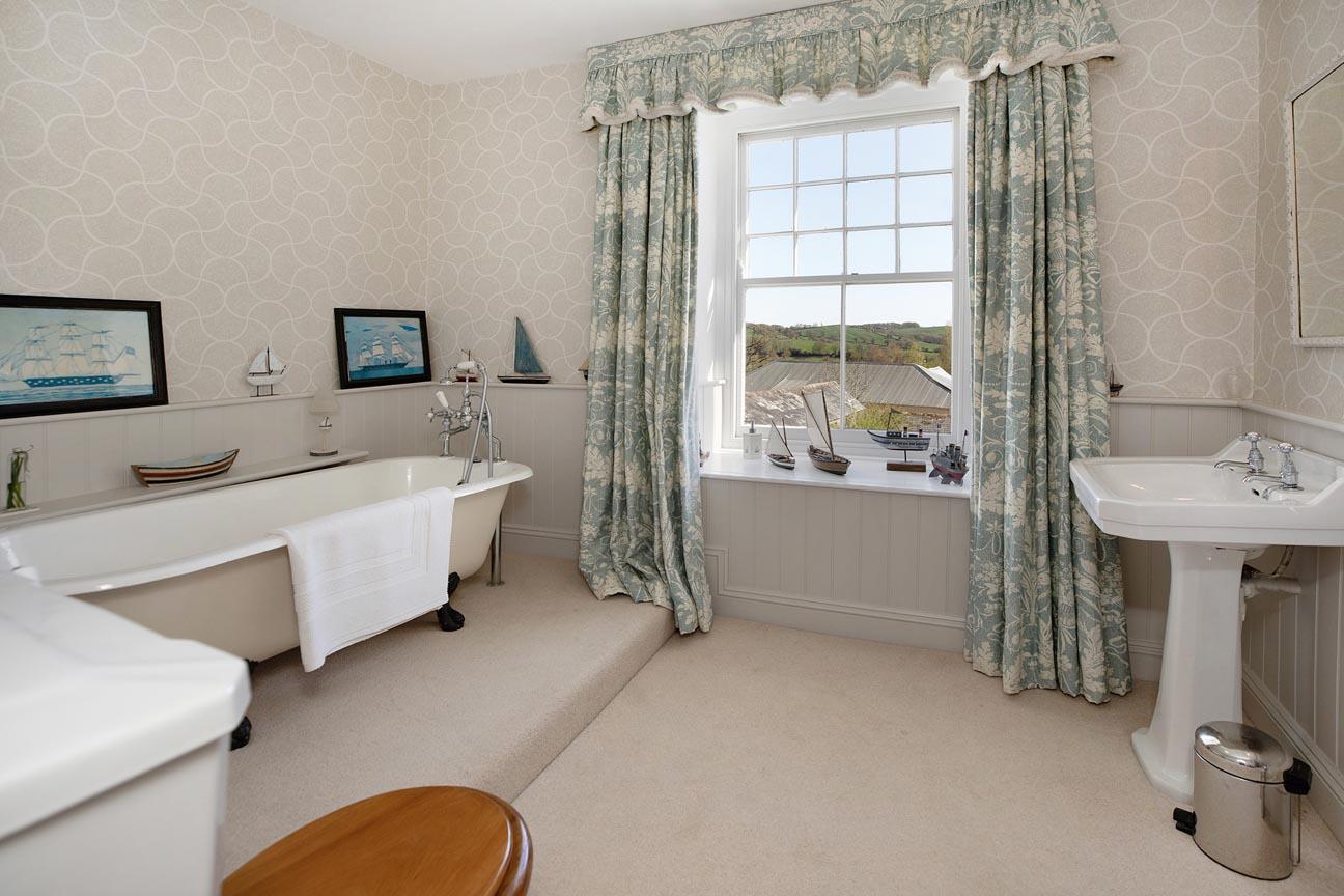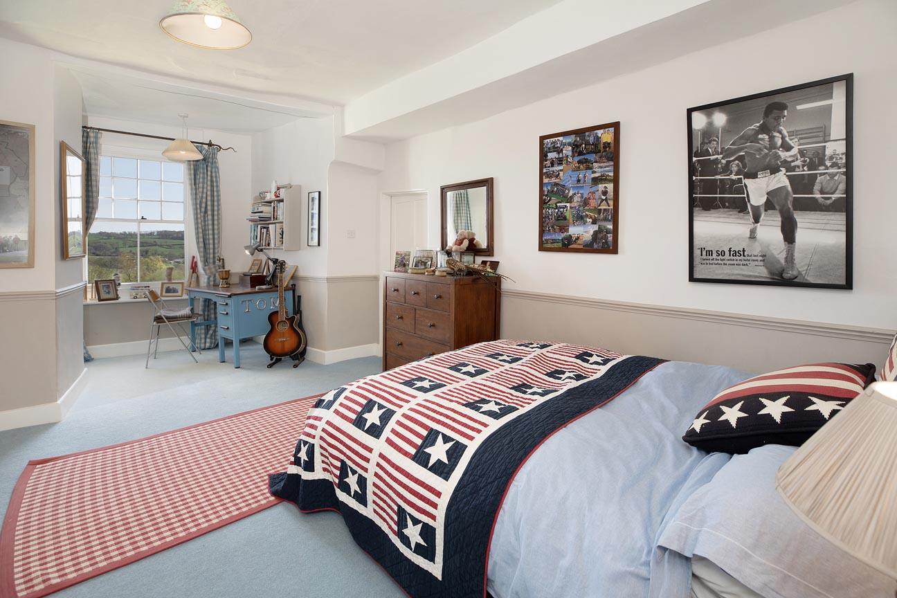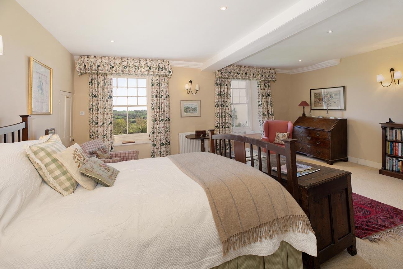 Upstairs, the principal suite and guest bedroom suite occupy opposite ends of the house, both benefitting from outstanding views over the gardens and towards Dartmoor. Three further bedrooms, a family bathroom, and a dressing room complete the first floor. A separate annex, currently accessed independently, has planning permission to convert into a further mezzanine bedroom and studio room, offering exciting potential for additional accommodation. A sixth bedroom and bathroom on the top floor provide an ideal guest, older child, or au pair suite. Further planning consent exists to add another bedroom on this level.
