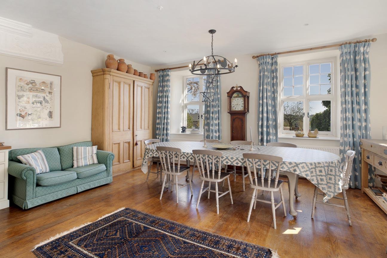 The ground floor features a series of spacious, light-filled reception rooms. The welcoming entrance hall, currently used as a dining room, leads to a formal drawing room with large sash windows, ideal for entertaining. At the heart of the home lies a traditional kitchen with an oil-fired AGA, central island, and informal dining space. This opens into a cosy sitting room with a wood-burning stove and views over the gardens. Additional reception spaces include a games / playroom and a large home office, complemented by a utility room, boot room, pantry, and cloakrooms, ensuring practicality for everyday living.
