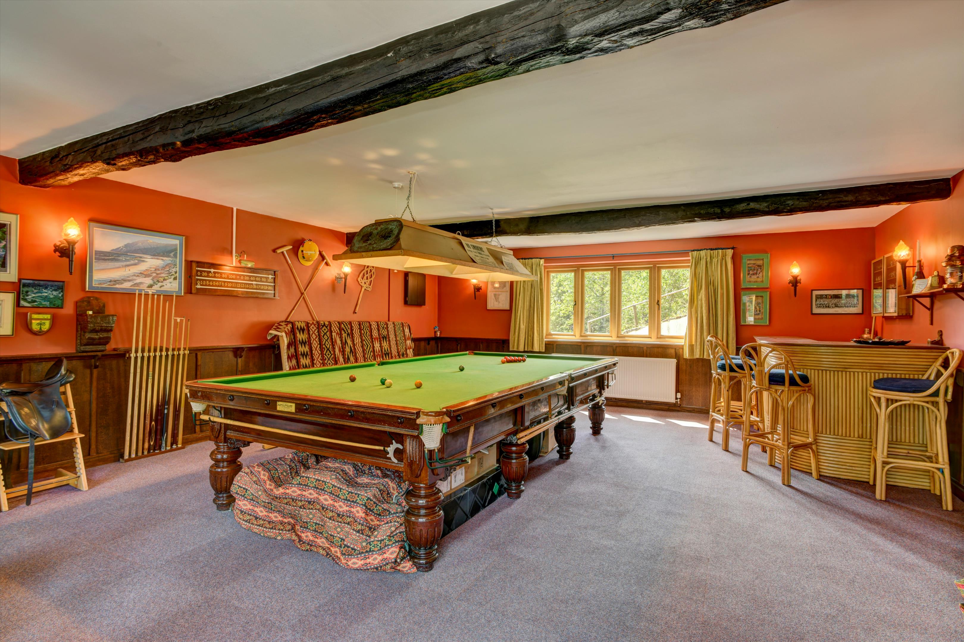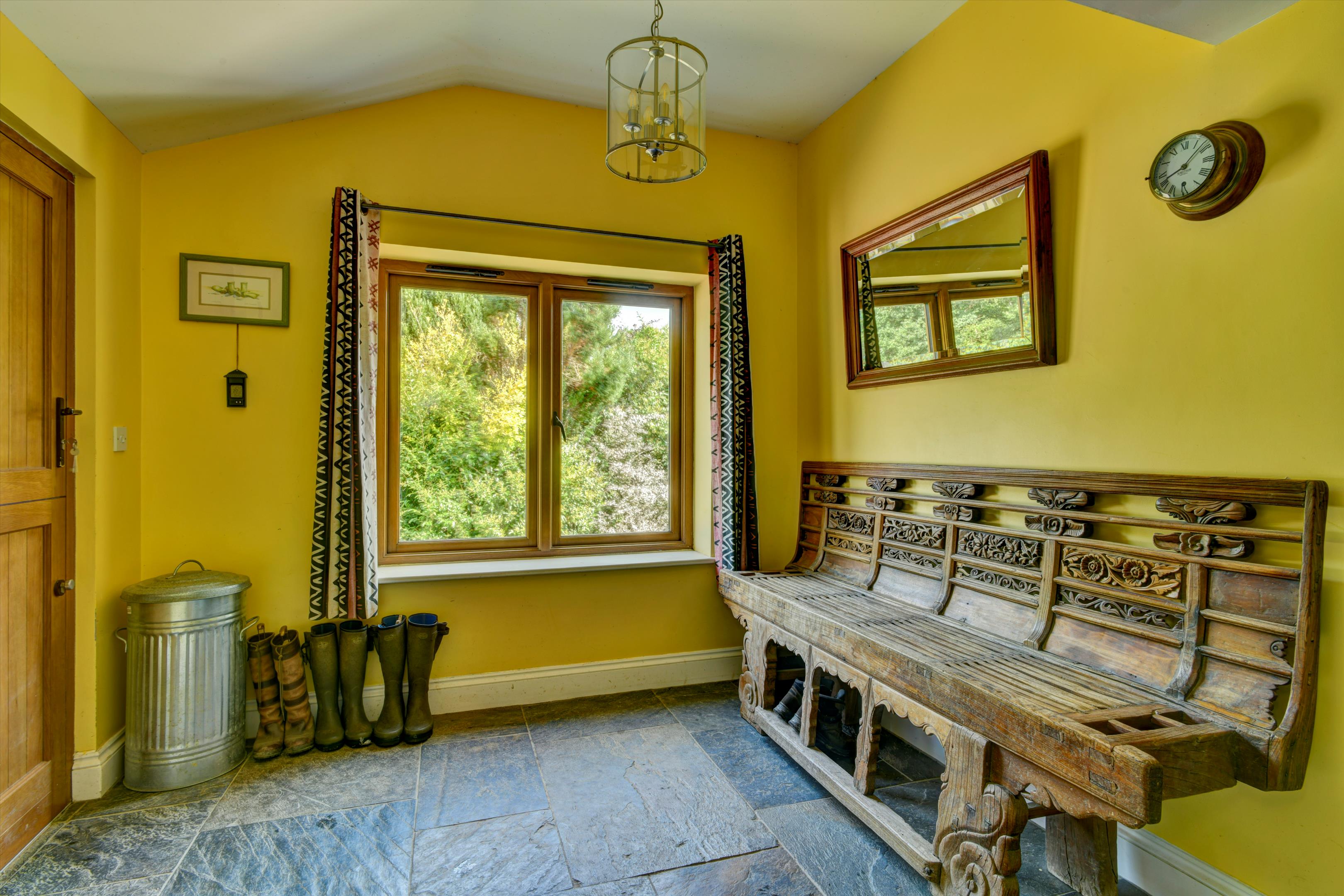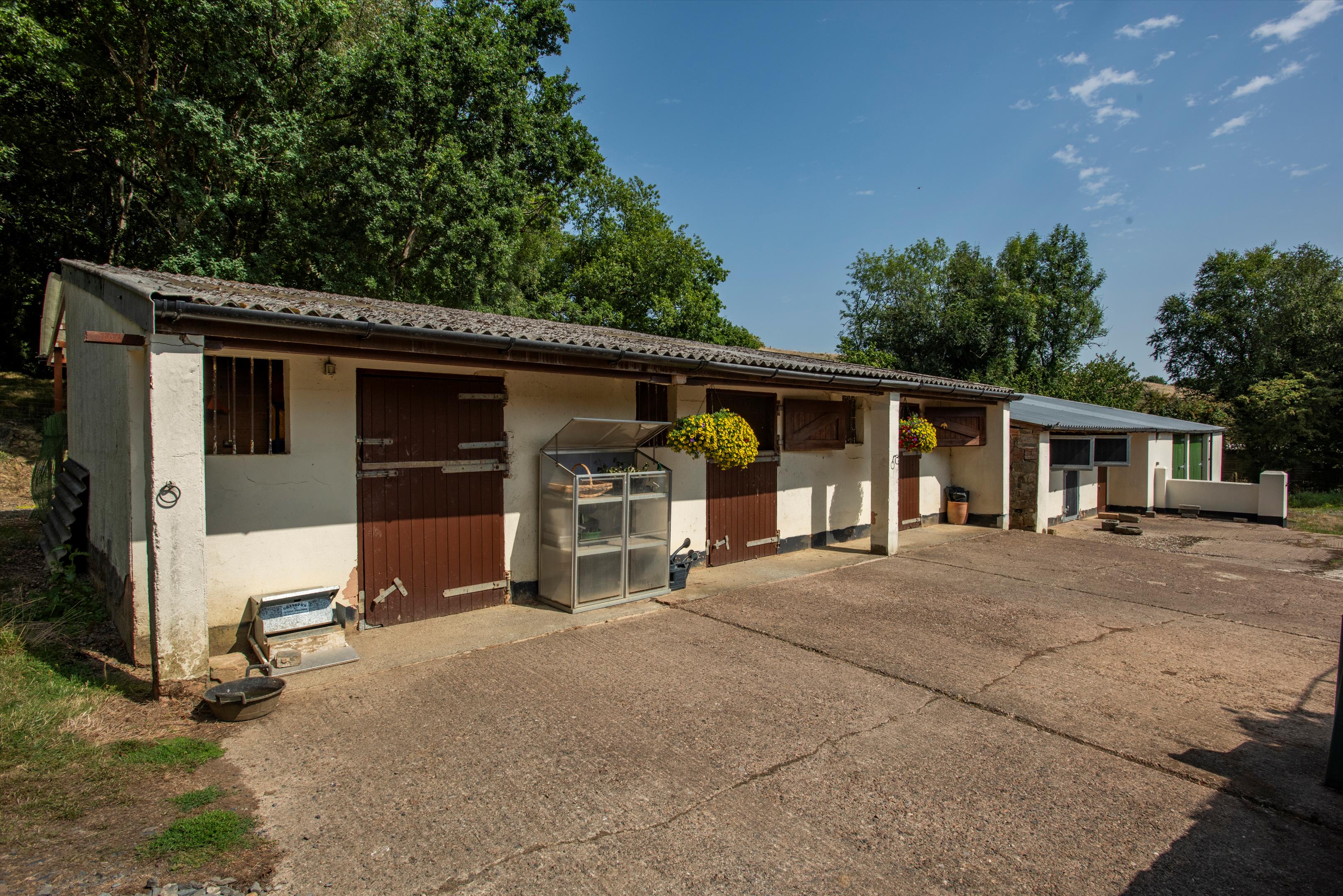 Crayford has a superb position with no near or visible neighbours, with the house hidden by a dip in the land behind a partial screen of mature trees. It is built on the side of the valley and is covered with white-painted render sheltering under a slate roof adorned with attractive dormer windows. The two largest reception rooms and the principal bedroom all face south with lovely views out over the surrounding countryside. It is very well presented and clearly has been well maintained over the years. The accommodation flows nicely and the house has a wonderfully light and airy feel, with plenty of natural light flowing in through tall oakframed, double glazed windows. The ground floor has five reception rooms including an elegant drawing room with bifold doors to a patio and a walkthrough snug warmed by a wood burning stove adjacent to the kitchen. The kitchen itself opens out into the adjacent conservatory to provide plenty of space for separate seating and dining areas. Upstairs there is a centrally positioned, galleried landing leading to five double bedrooms, three of which have an en suite shower room with the remaining two sharing the family bath and shower room. The house is positioned at the end of a narrow, council-maintained lane with a good sized, gravelled parking area in front of the house. To one side is a three-bay garage block incorporating a single garage and two carports. Behind the garage are a range of outbuildings including a tractor shed and five stables. The house and its outbuildings sit squarely within a parcel of land totalling about 14 acres. The garden extends out from the house on three sides and consists of lawn fringed in places by shrub and tree borders. Beyond it are two paddocks totalling over eight acres along with two smaller paddocks. Also within the grounds are areas of mature broadleaf woodland, an orchard and a stream-fed, naturally stocked pond that attracts ducks and moorhens. An extra 30 acres are available by separate negotiation to include 20 acres of paddock, ten acres of woodland and a barn.