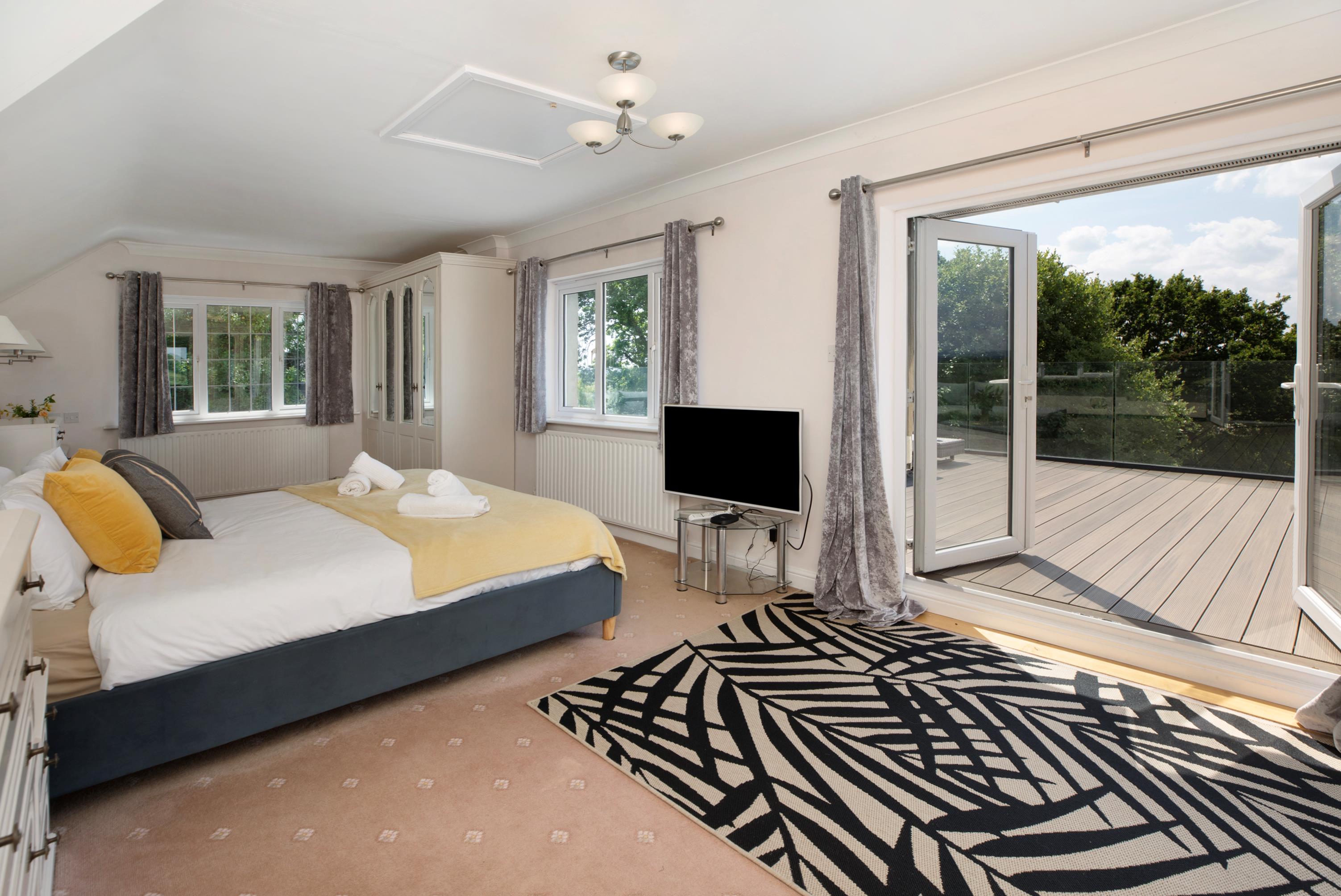 On the first floor there is a large principal bedroom suite enjoying the fabulous southerly views, extensive fitted wardrobes and an en suite bathroom with Jacuzzi whirlpool bath, large shower cubicle, WC and dual basins in a vanity unit. Doors lead out onto a huge balcony with composite decking, surrounded by a glass balustrade. The balcony has modern built in lighting, weatherproof power sockets and even a mains water supply. Bedroom 2 is an excellent guest suite with en suite bathroom. Bedroom 3 has an en suite shower room whilst bedrooms 4 and 5 have en suite cloakrooms. There is also a family bathroom. All showers are powerful, enjoying the benefit of a pressurised water system.