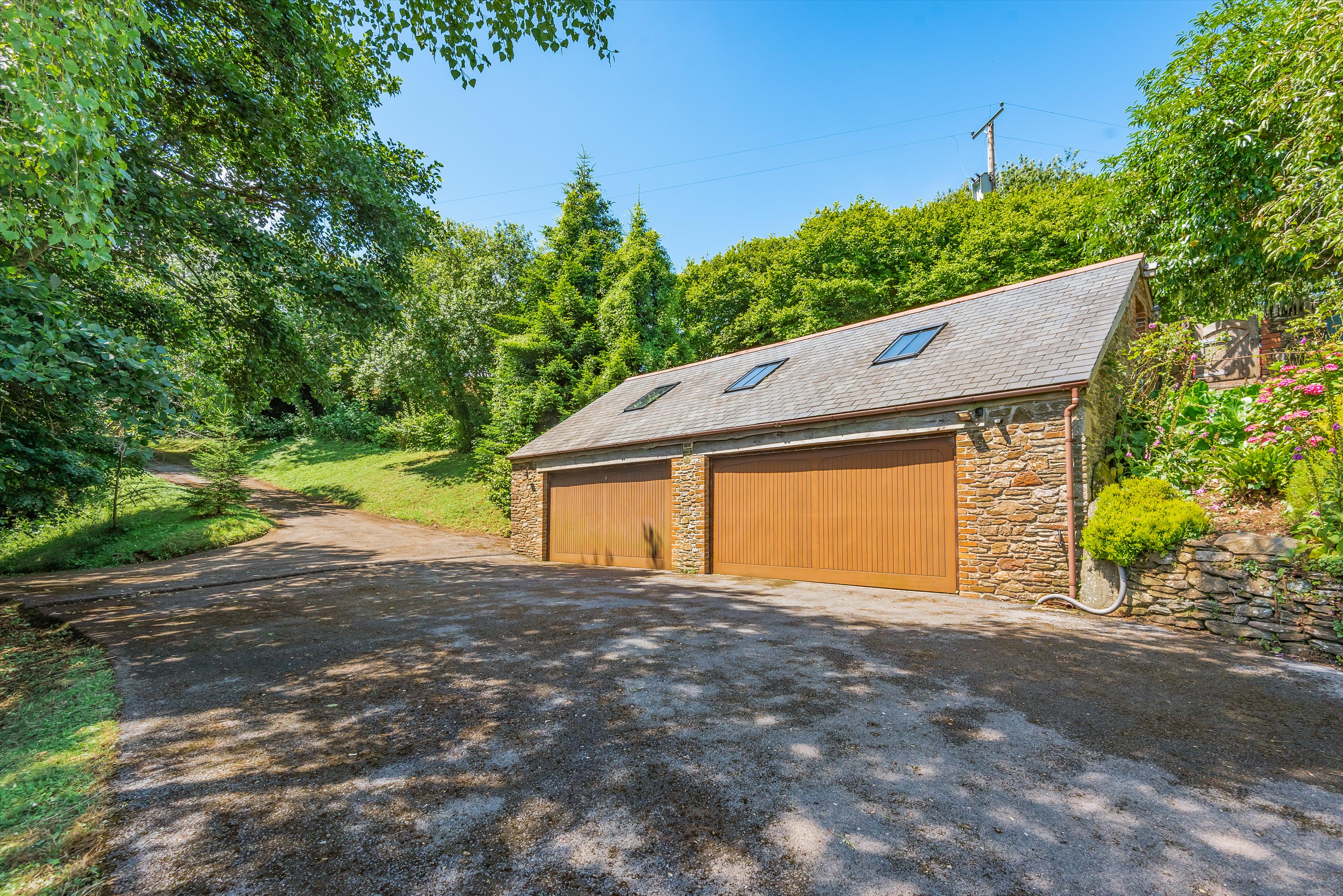 Adjoining the private drive is a quadruple garage with two electric double garage doors. Above the building and accessed from steps