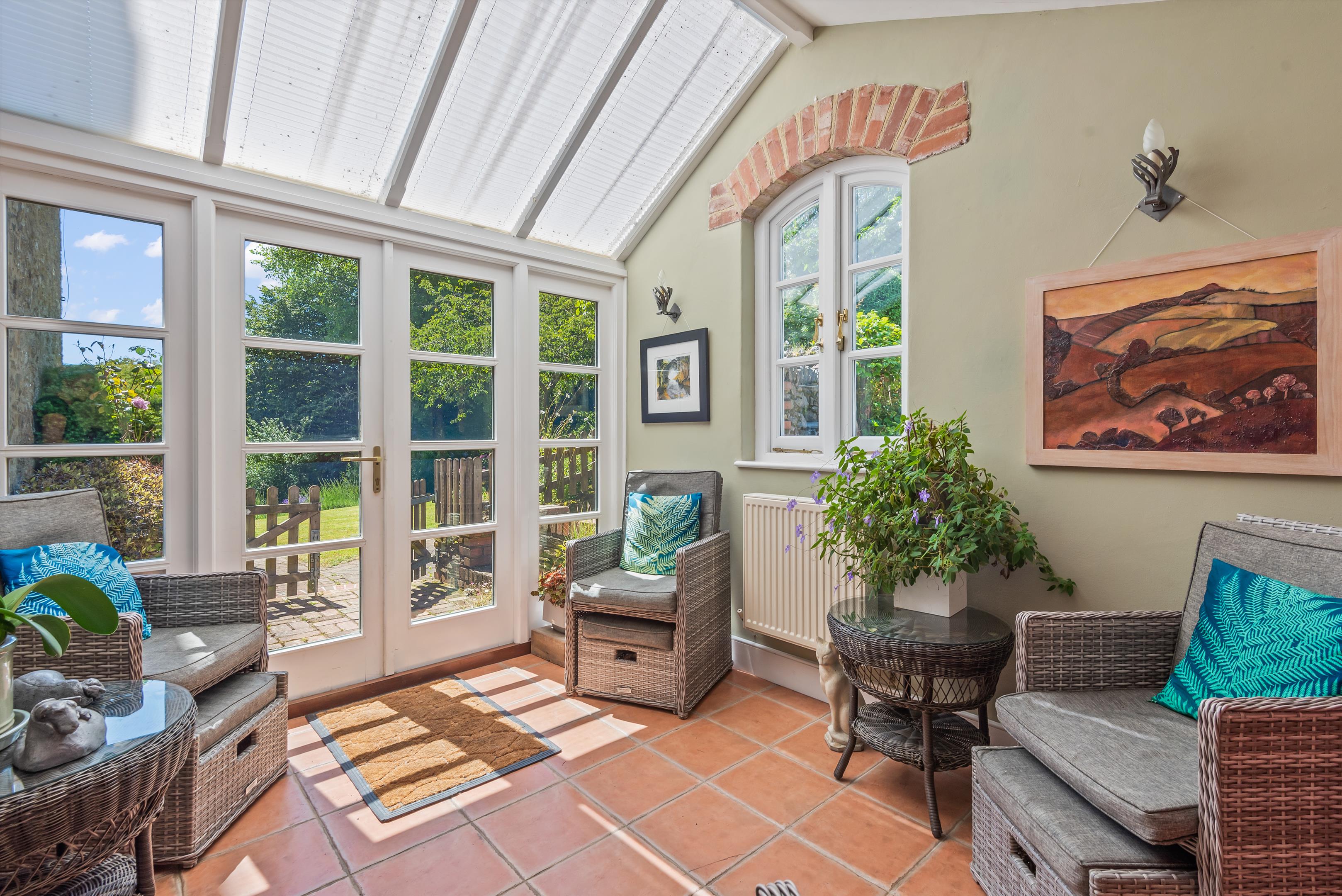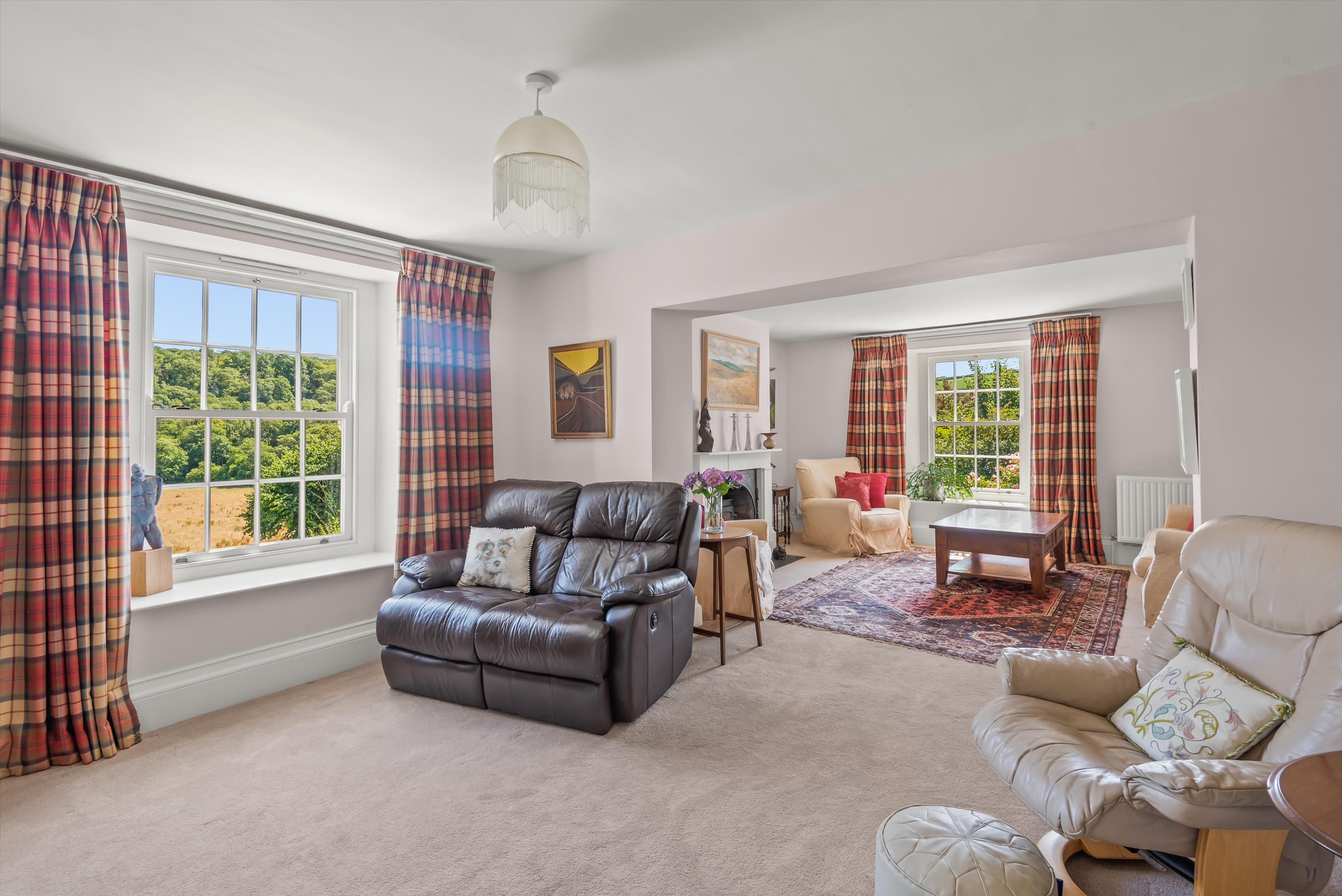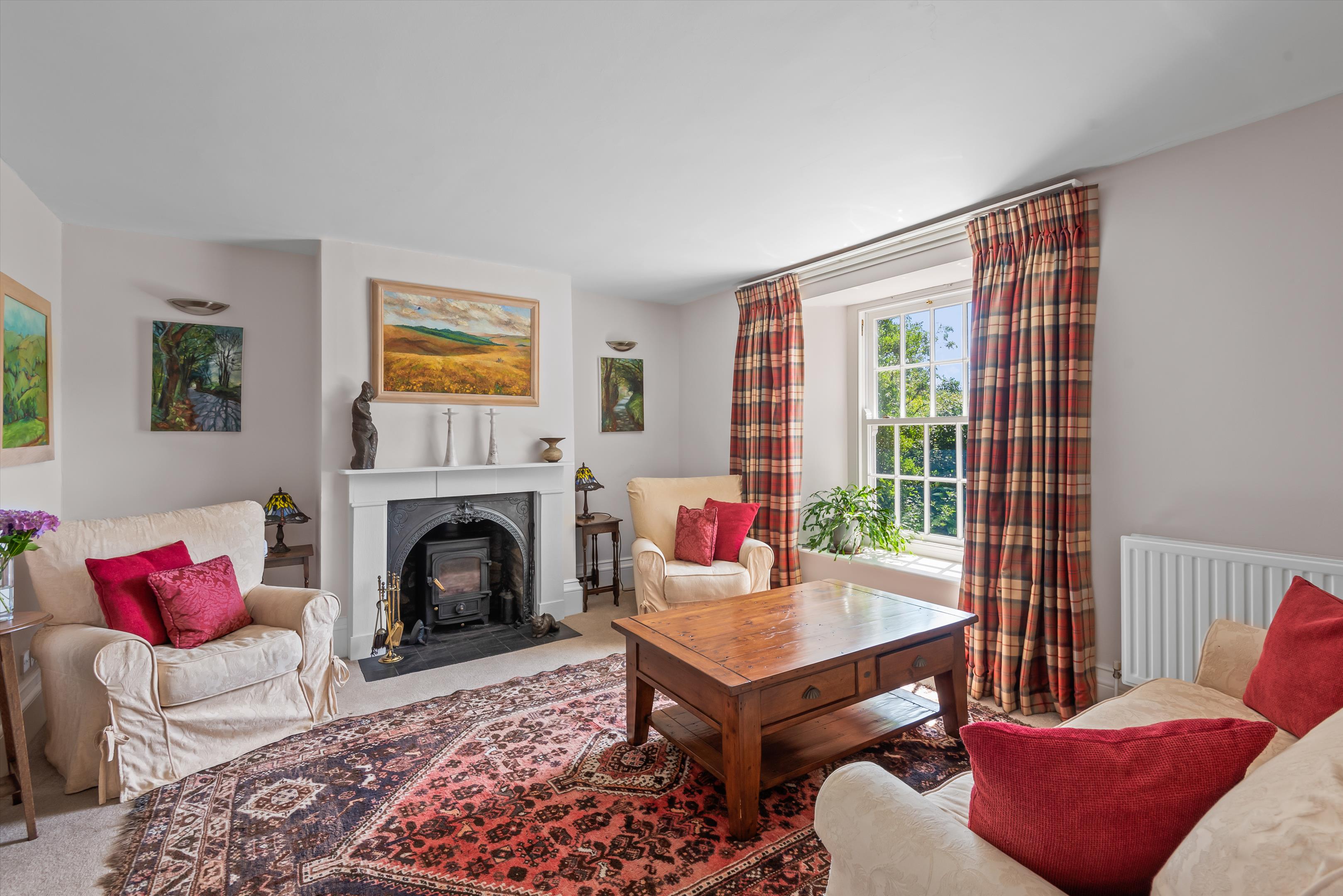On the other side of the reception hall is the drawing room with a sitting room at the far end. The drawing room has a fireplace with a Clearview wood burner and an archway leading through to the sitting room with a glorious east-facing view over the garden and countryside.