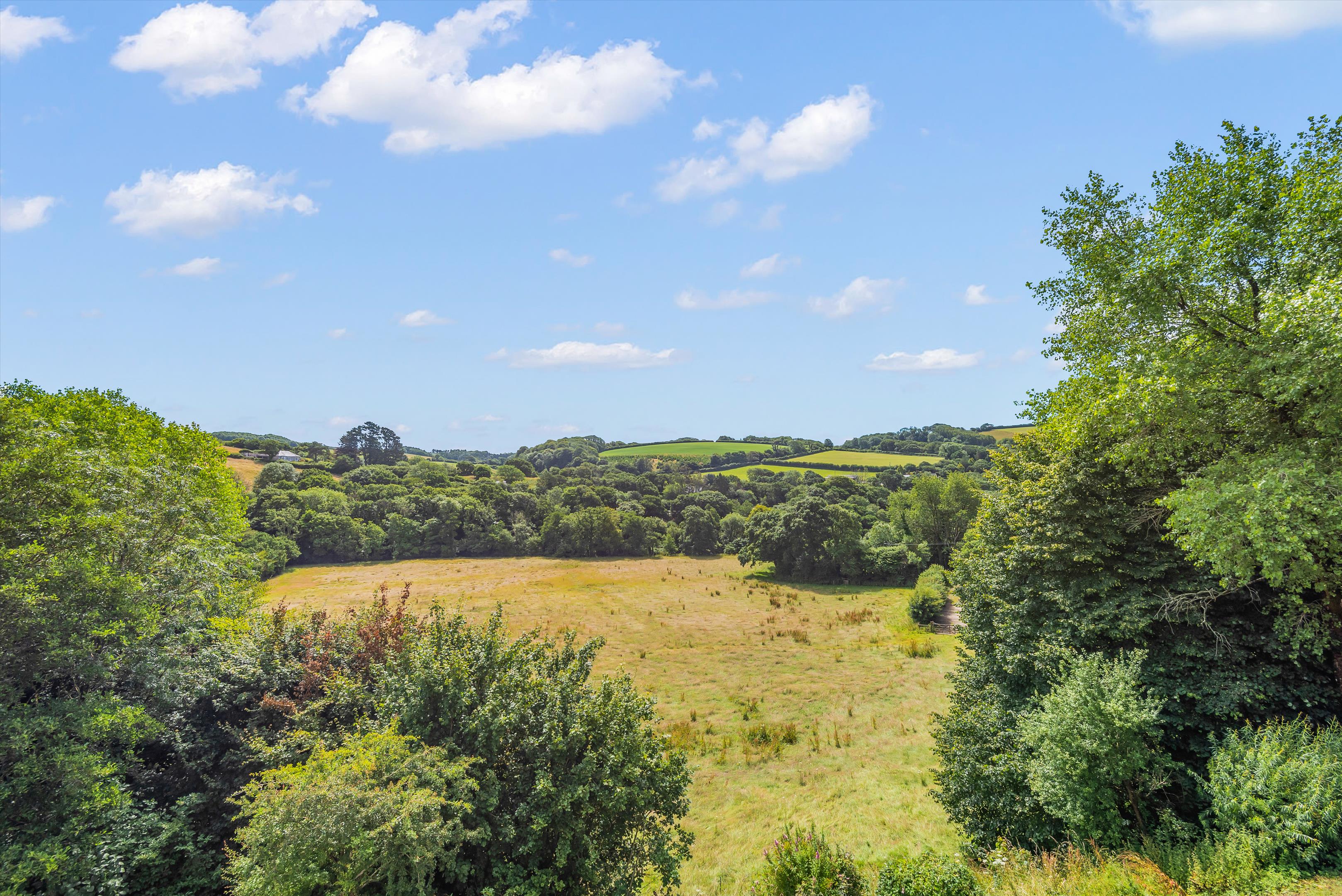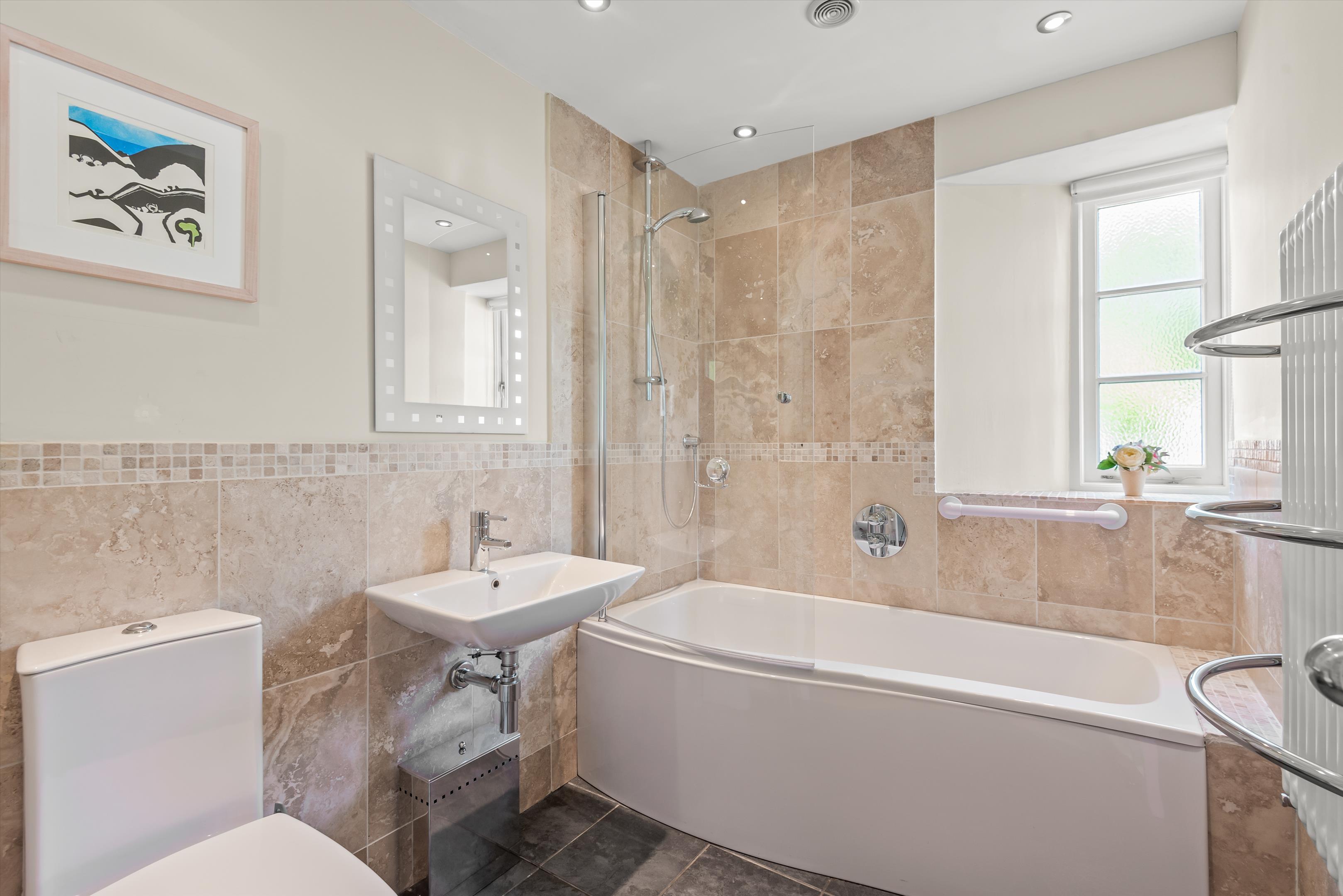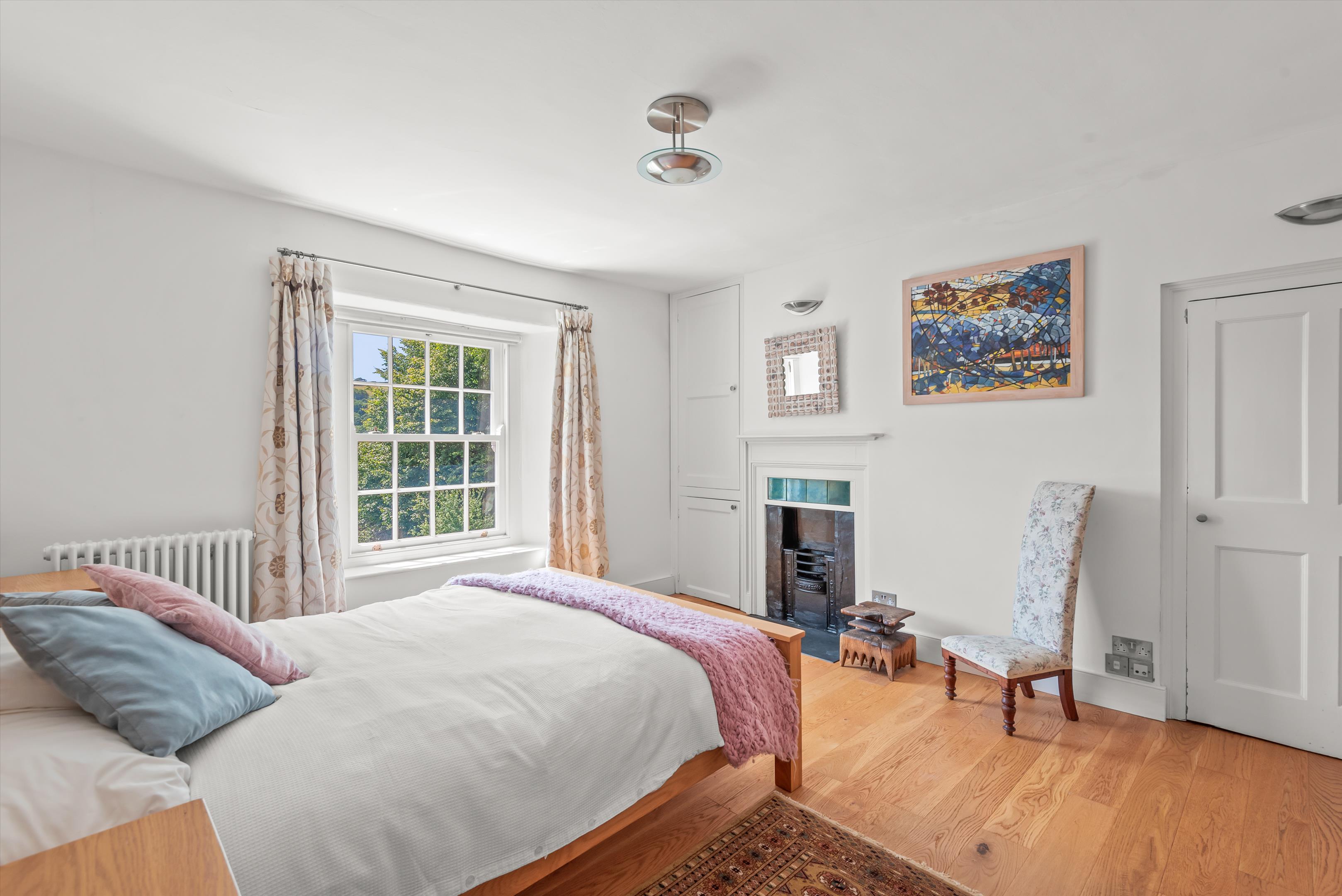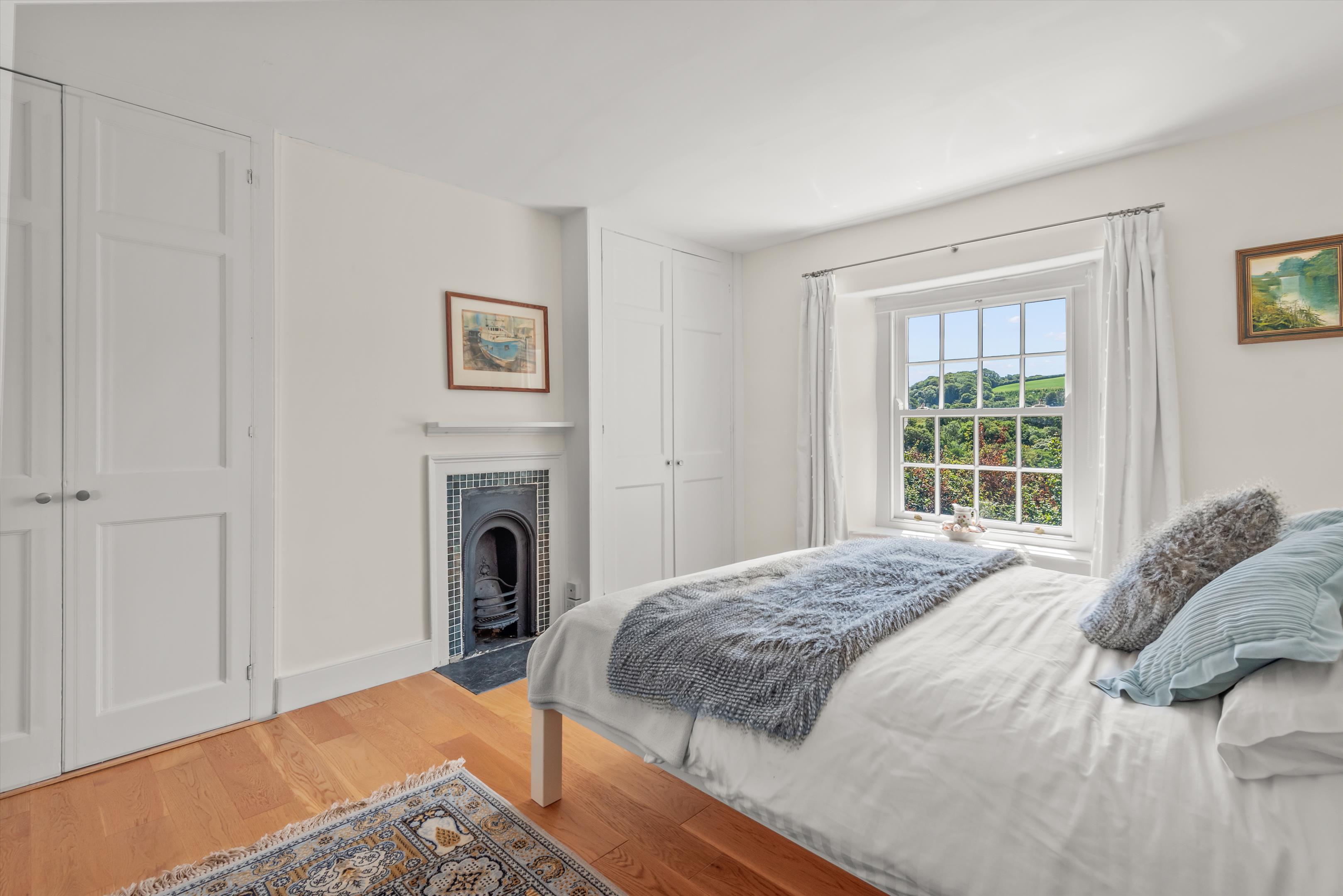 From the conservatory a paved patio leads around to a boiler cupboard, where there is a gardener's WC, the Grant oil-fired boiler and the unvented hot water tank. The stairs rise to the spacious first floor landing with doors to four bedrooms. Bedroom one has a cast iron Victorian fireplace, with cupboards to either side and a door to an en suite bathroom with electric underfloor heating, a bathtub with separate large walk-in shower. Bedroom two also has a Victorian cast iron fireplace. All the bedrooms have good views, with bedroom three currently used as a dressing room with a range of fitted wardrobes.
