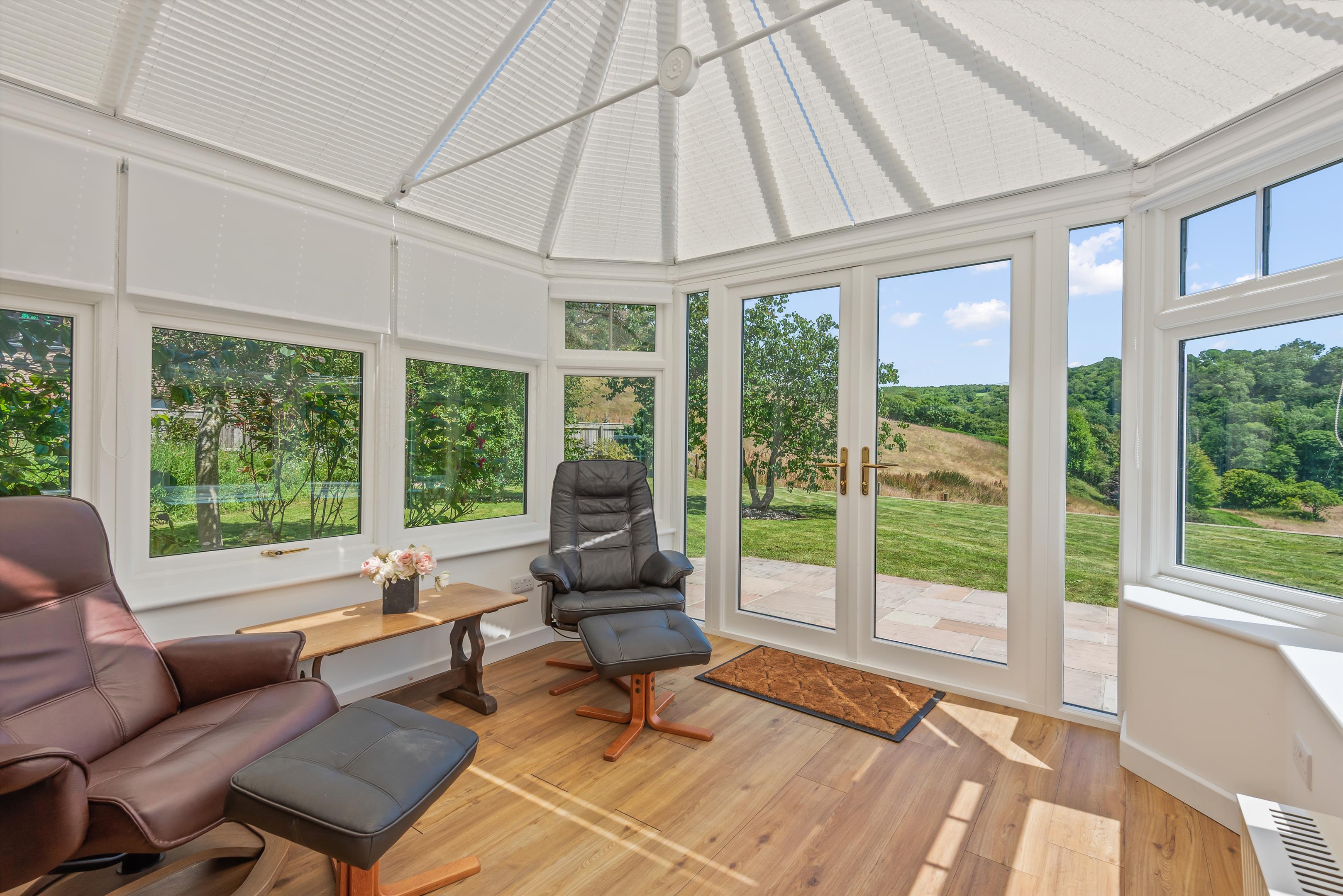 The rear passageway is large enough to provide further seating areas with a storage cupboard, door to a ground floor WC and door into the utility room. From the rear hallway a few stairs lead up to the boot room/entrance porch, with a pair of doors to a useful coat and storage cupboard with a pair of patio doors leading out onto the brick patio below. From the kitchen there is a door with slate steps, that lead down to a lower level home office with a sash window. Door to a further home office/rod room with ample space to store the fishing rods. The conservatory also has stunning views over the land, electric heating and a patio door to outside.