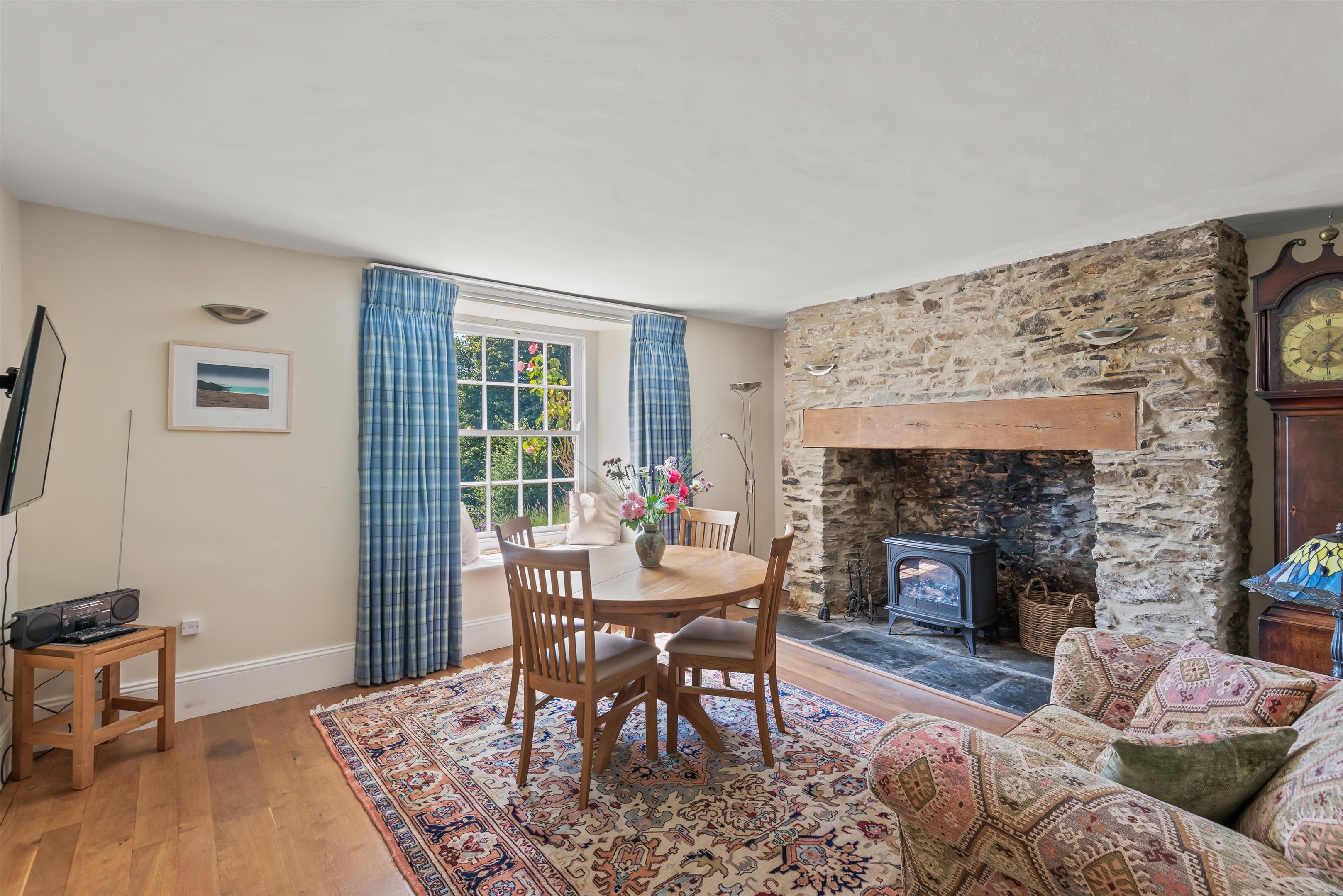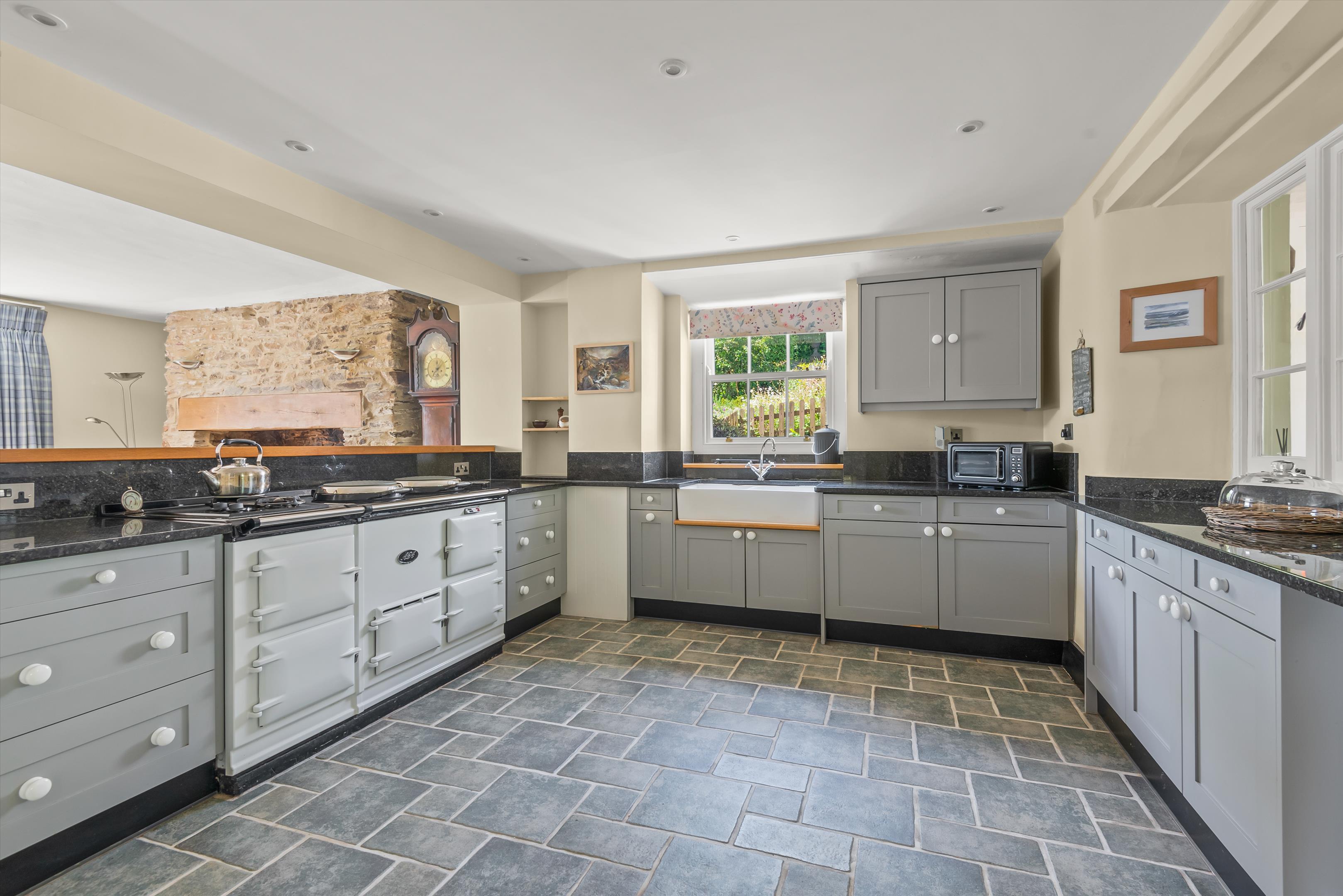 From the private drive, steps lead up to a patio with door into the main reception hall. Within the hall are the original slate slabs with doors to reception rooms on either side. The large open plan dining room/kitchen has an exposed timber floor, large south-facing sash window with a window seat to the front, large stone fireplace with slate hearth where there was once a wood burner, now replaced with an electric fire. In the kitchen there is a range of kitchen units with black granite worktops with a double ceramic Belfast sink, an integrated Bosch dishwasher and an electric AGA and a LPG 2-burner gas hob.