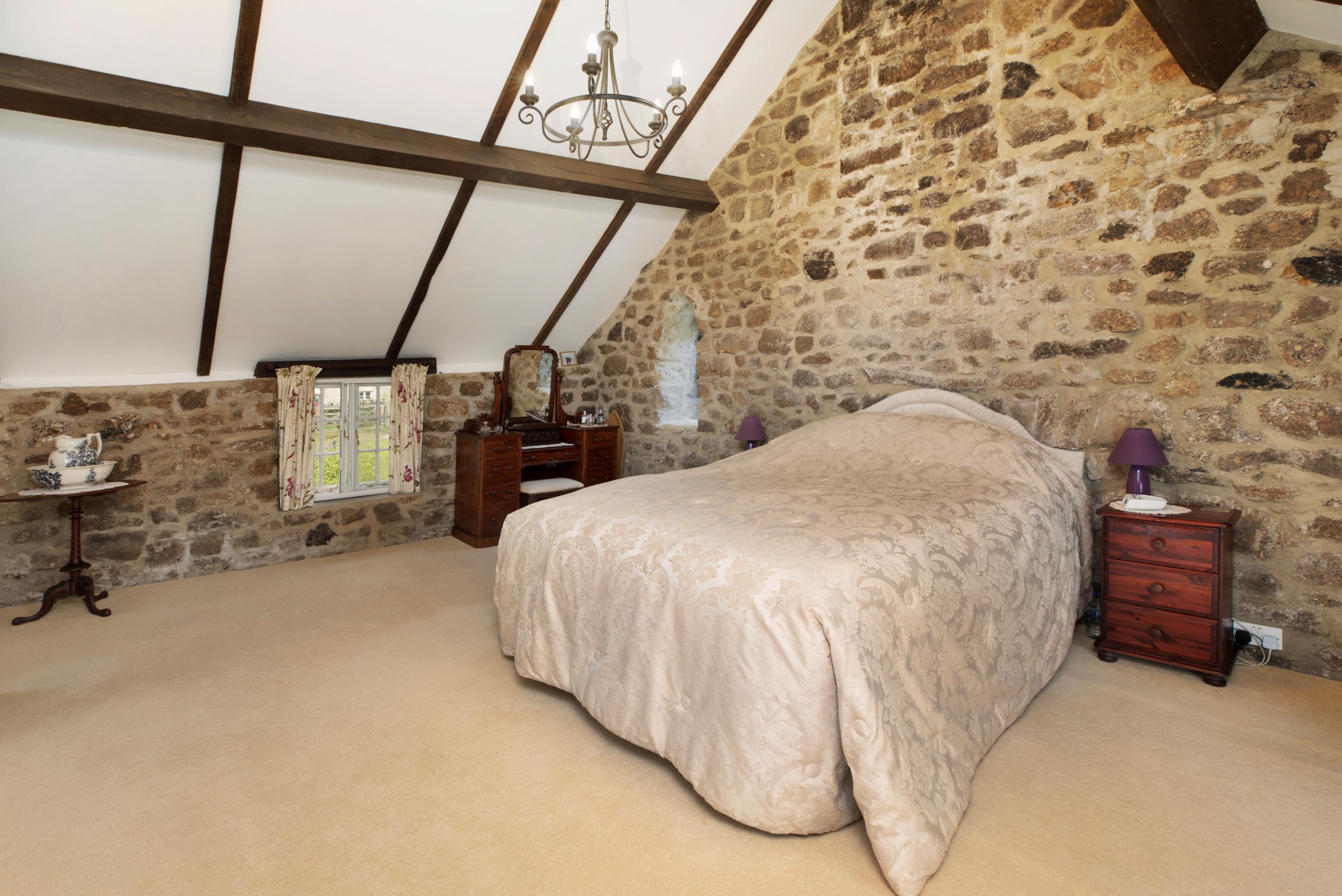 The farmhouse nestles into the hillside and has two storeys under a Devon slate roof. The rear faces due south, which means that the kitchen, sitting room, first floor landing and three of the five bedrooms all have southerly, far-reaching views out over the surrounding countryside. The interior is very well presented and chock full of character with well-proportioned rooms and good head height. It has retained many original architectural fittings including beams, exposed roof timbers, a magnificent, wide inglenook fireplace in the sitting room now fitted with a wood burning stove, painted/exposed stonework and studded oak plank doors. The galley kitchen is sited in a later, lean-to addition at the rear of the house and is fitted with a tiled floor, oak units under granite work surfaces and space for a range of freestanding appliances. It is also wonderfully light with three tall, south-facing windows and a part-glazed door to the garden. Upstairs off a galleried landing are a total of five bedrooms and two bath/shower rooms. The fifth occasional bedroom normally serves as a walk-through dressing room to the principal bedroom, which also has its own en suite bath and shower room. The remaining three bedrooms share the family shower room.