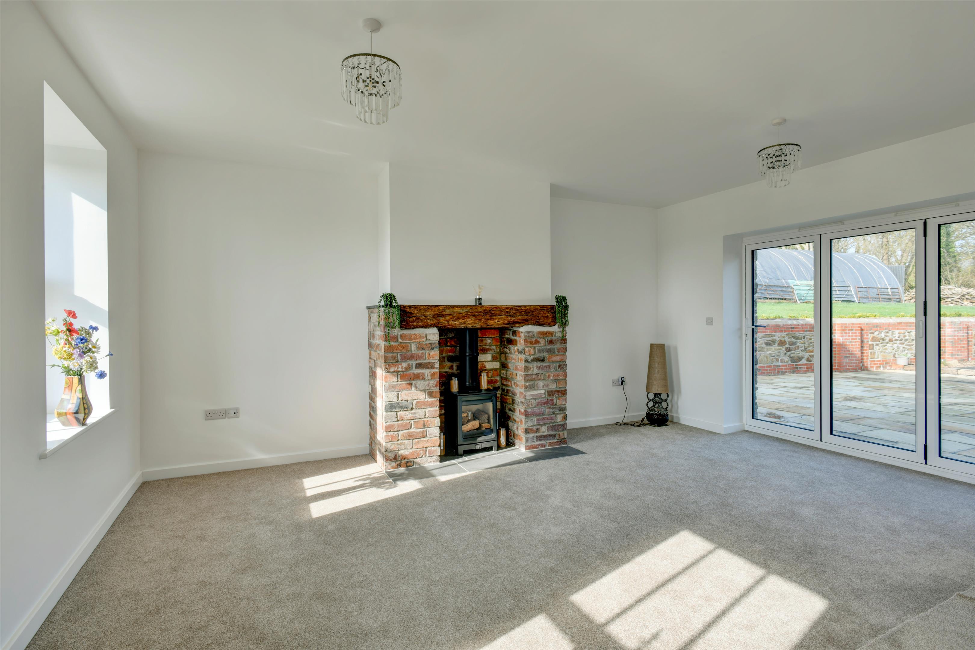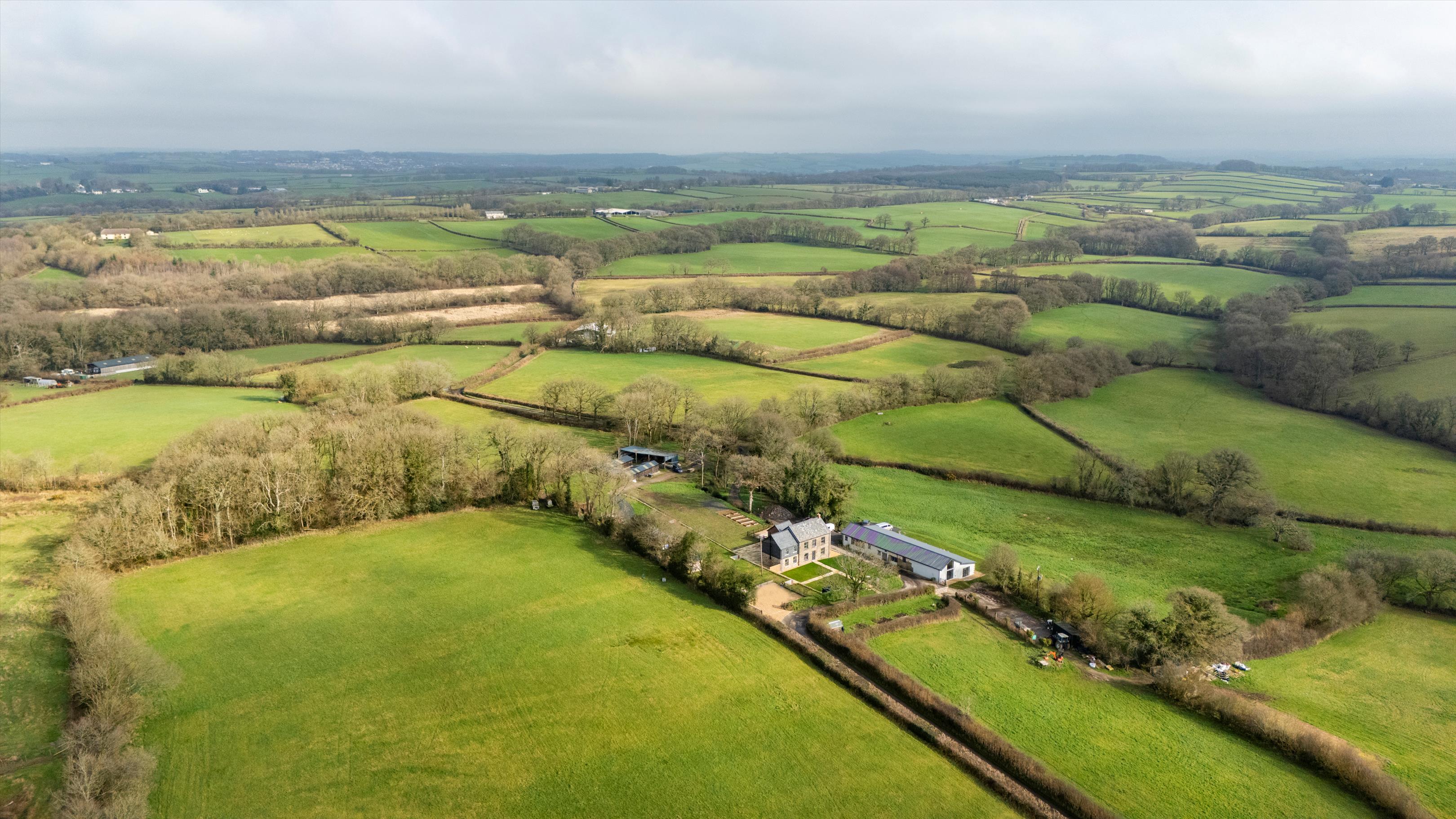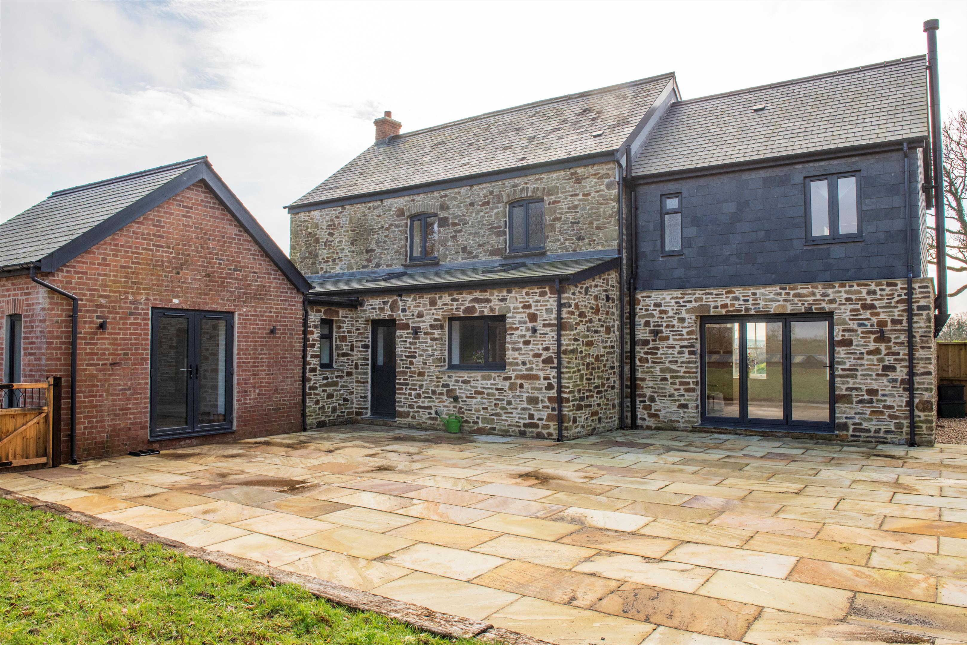 lane. The house has recently been entirely and thoroughly renovated and modernised to a high standard by the current owner and now provides beautifully presented family accommodation. The drawing room with brick fireplace and woodburner and bifold doors to terrace and gardens, the large kitchen/dining room with fully fitted kitchen and island, and the sitting room are along the front of the house and all enjoy the gorgeous views to Dartmoor. At the back, the family room with French doors to the terrace and gardens and the cloakroom could provide scope for a separate annexe suite if required. On the first floor the principal bedroom and two of the other bedrooms also benefit from the stunning views across the surrounding rolling farmland of West Devon to the hills and tors of Dartmoor in the distance. Off the road is a large gravel parking and turning area and steps down to the lawned front garden. Doors from the drawing room and family room open to the broad paved terrace area to the rear of the house, providing a delightful outdoor dining/sitting area and there is a further garden area beyond. A wooden shed contains the water filtration equipment and back up water tank and there is also another seperate outbuilding which could be used for whatever is required.