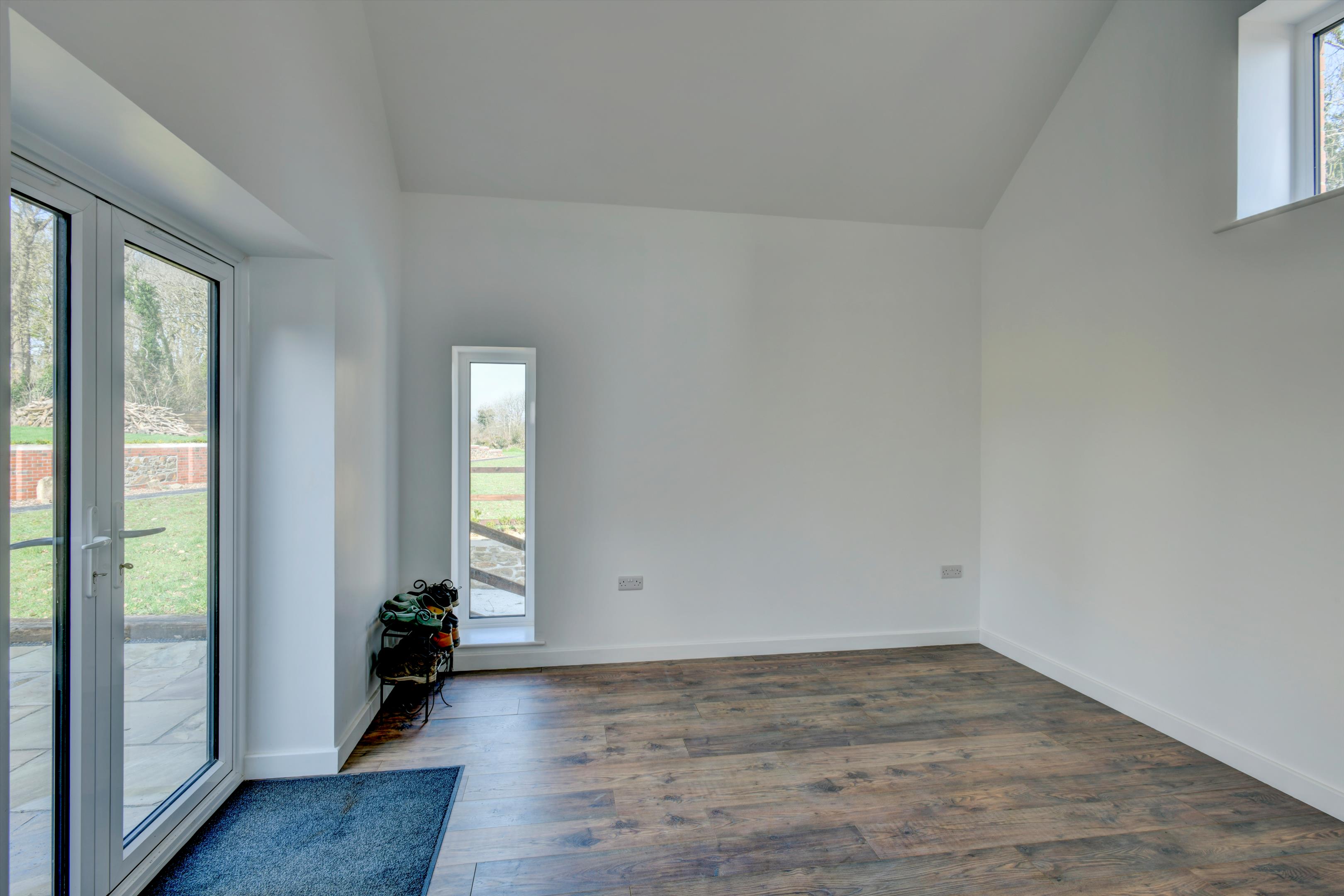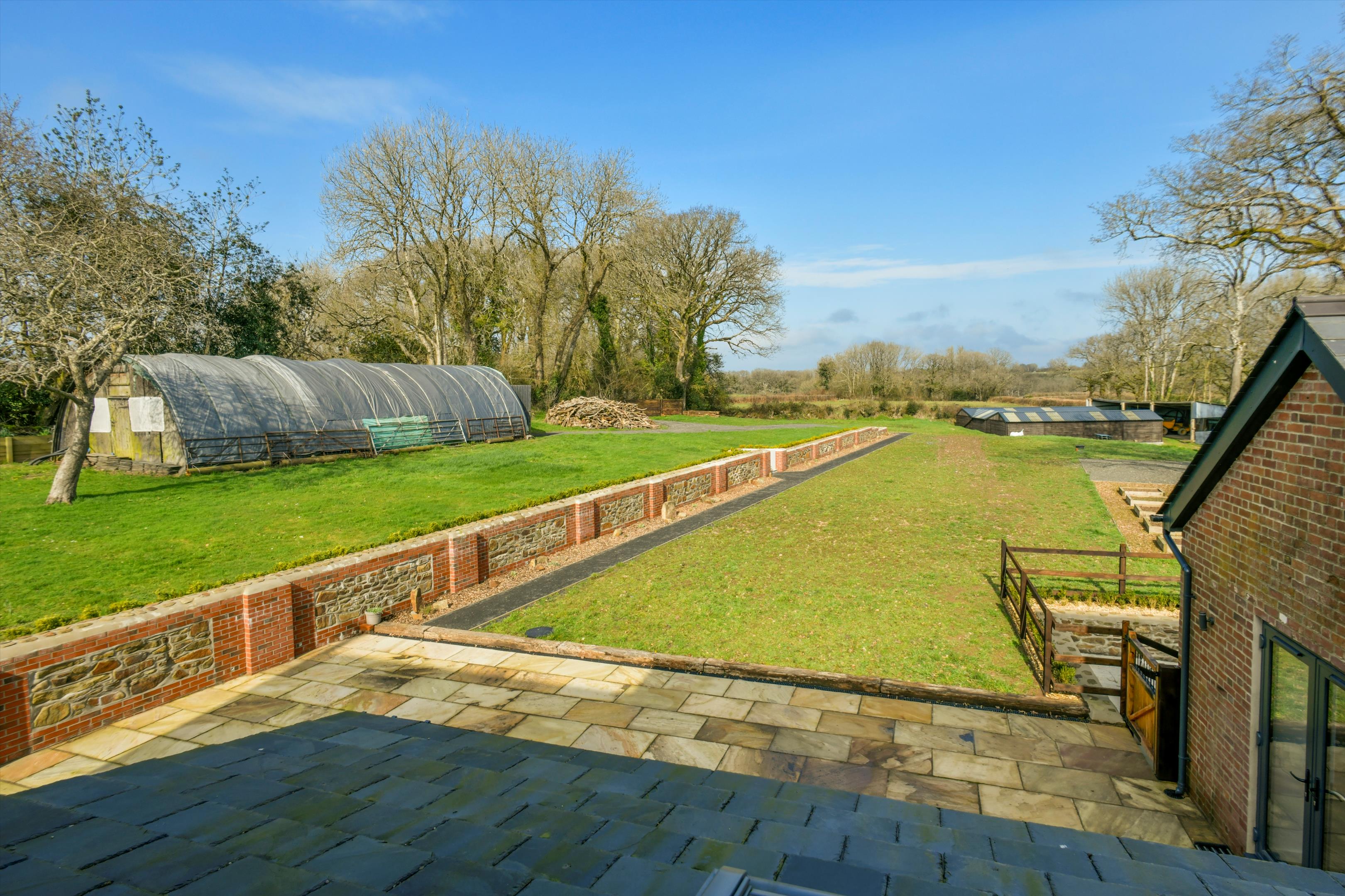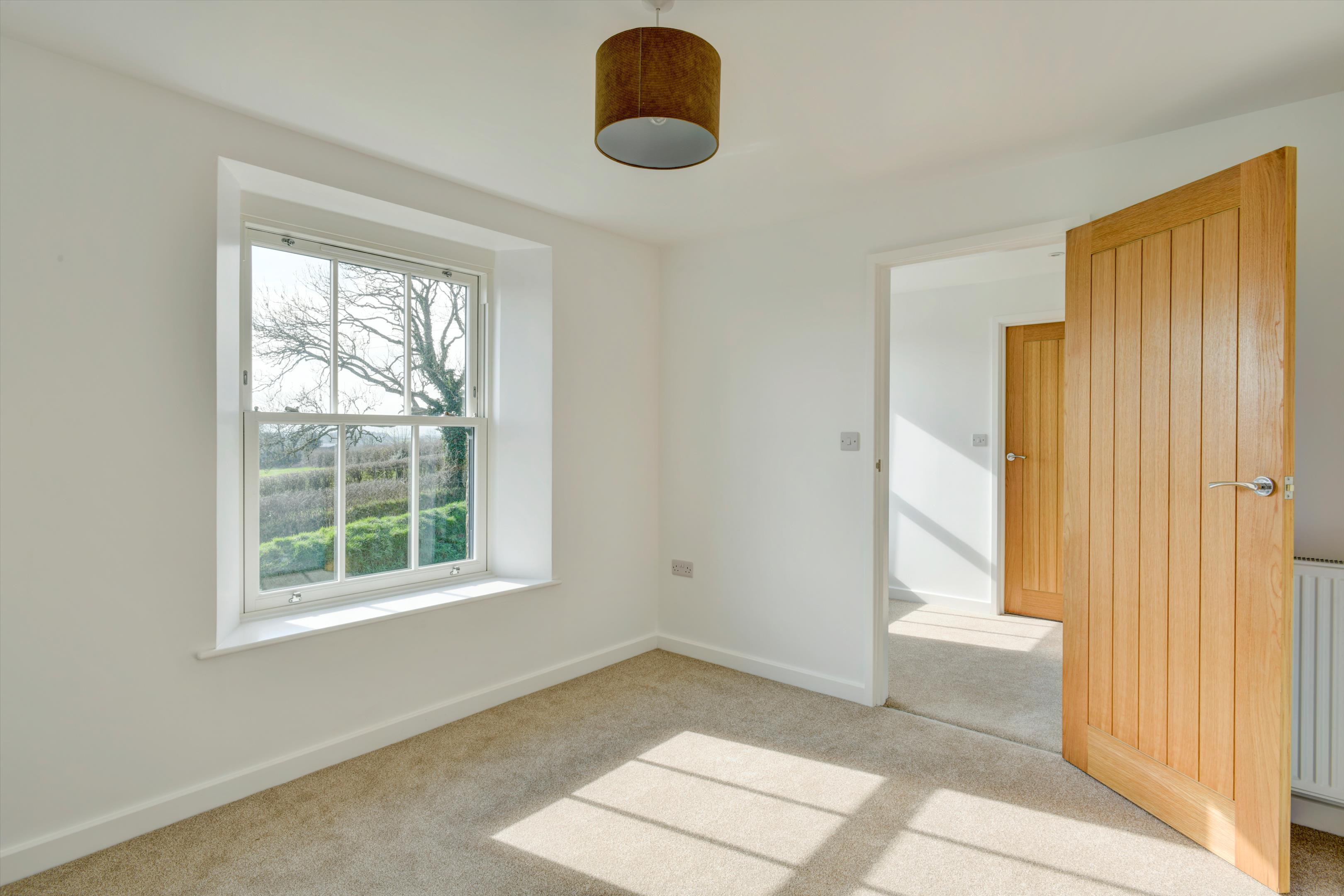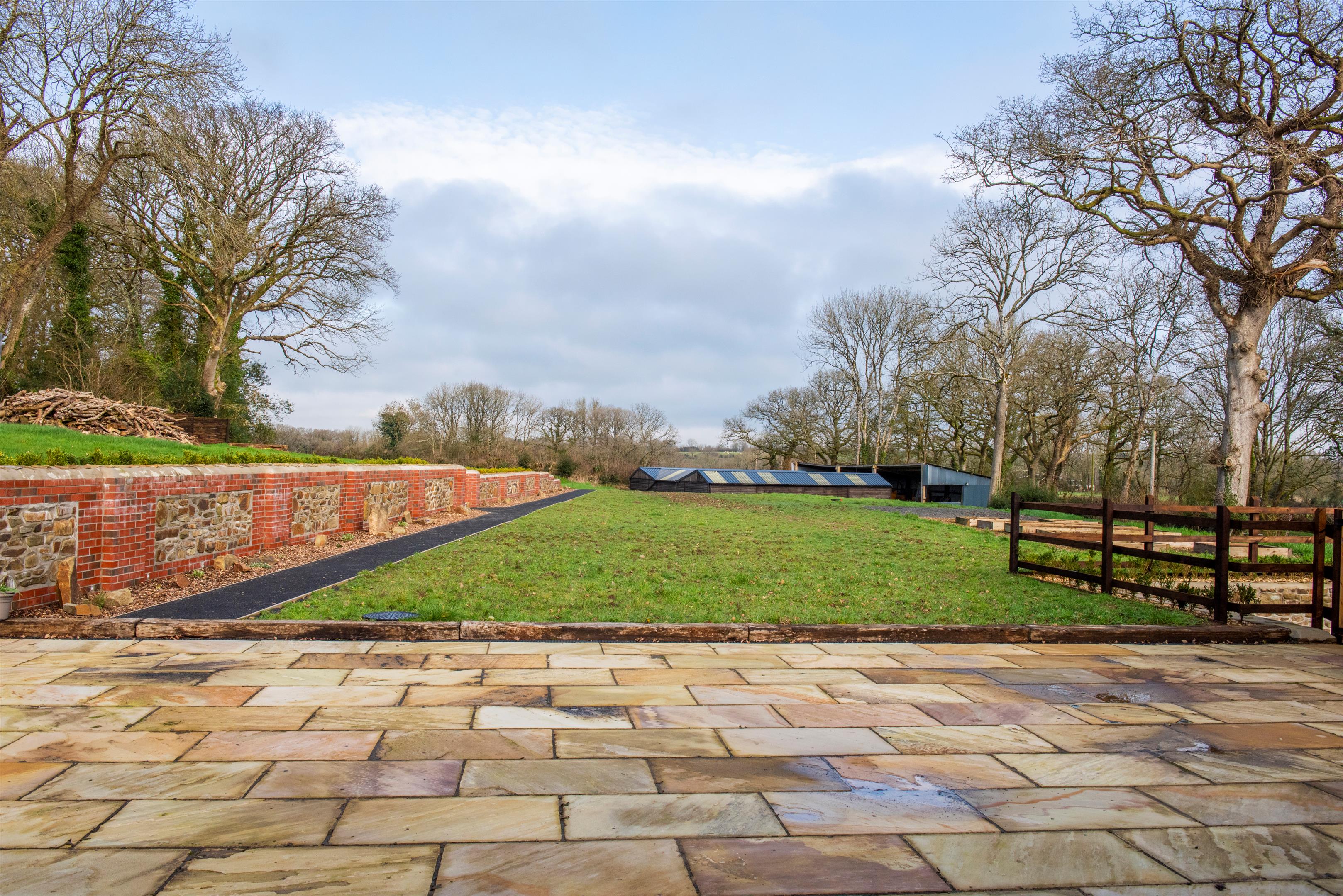 lane. The house has recently been entirely and thoroughly renovated and modernised to a high standard by the current owner and now provides beautifully presented family accommodation. The drawing room with brick fireplace and woodburner and bifold doors to terrace and gardens, the large kitchen/dining room with fully fitted kitchen and island, and the sitting room are along the front of the house and all enjoy the gorgeous views to Dartmoor. At the back, the family room with French doors to the terrace and gardens and the cloakroom could provide scope for a separate annexe suite if required. On the first floor the principal bedroom and two of the other bedrooms also benefit from the stunning views across the surrounding rolling farmland of West Devon to the hills and tors of Dartmoor in the distance. Off the road is a large gravel parking and turning area and steps down to the lawned front garden. Doors from the drawing room and family room open to the broad paved terrace area to the rear of the house, providing a delightful outdoor dining/sitting area and there is a further garden area beyond. A wooden shed contains the water filtration equipment and back up water tank and there is also another seperate outbuilding which could be used for whatever is required.