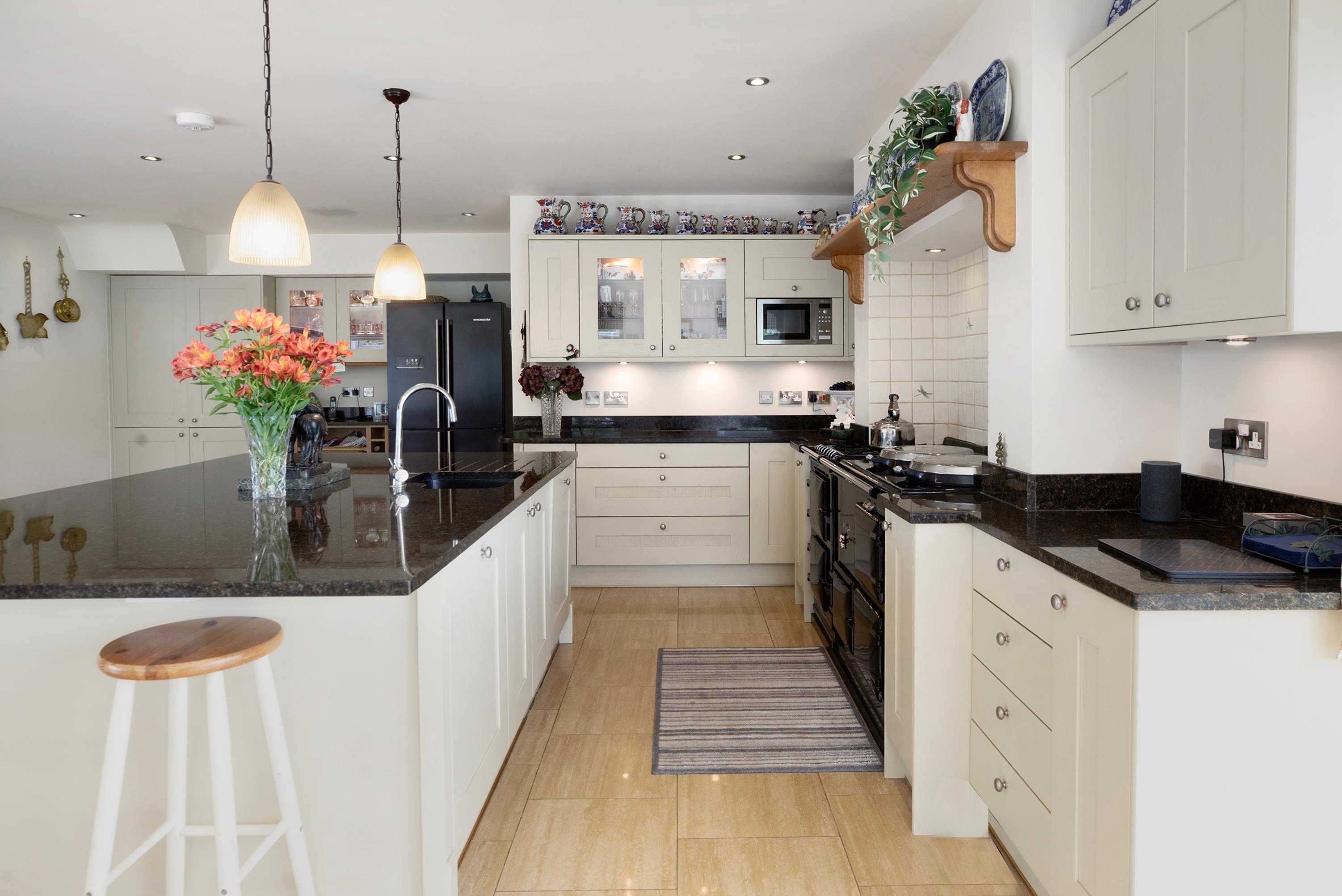 At the opposite end of the house is the kitchen-an outstanding reception space and the heart of the home-measuring approximately 35 ft across and comprising fitted kitchen units with granite worktops, a central island, dining area and additional snug with a wood burner. The kitchen includes a range of integrated appliances, including a mains-gas AGA with companion electric oven and gas hob. A useful utility room sits just off the kitchen.
