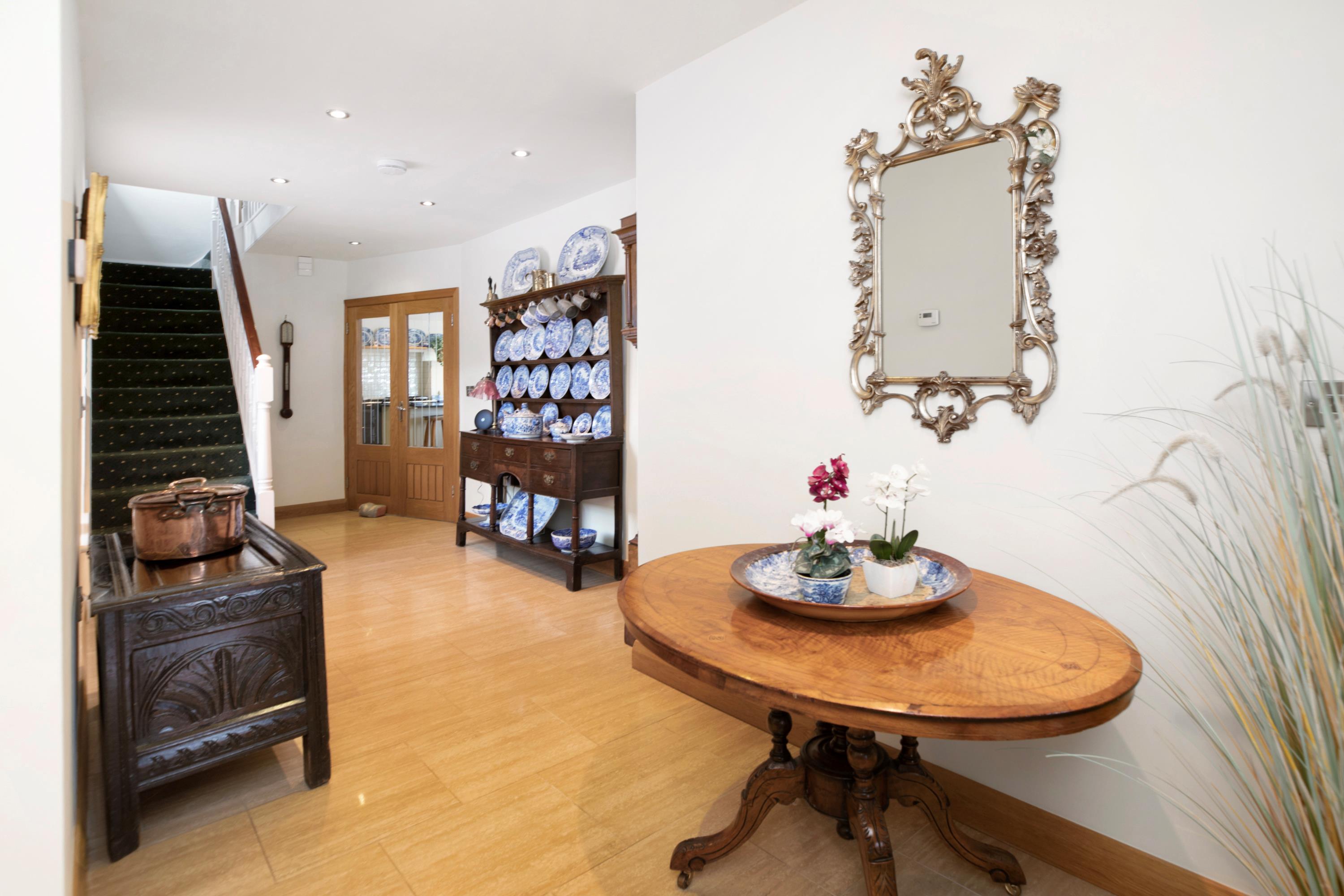 From the driveway, the front door opens into a spacious L-shaped hallway with a door to a ground-floor WC and stairs rising to the first floor. On the right, a door leads into a charming sitting room with a wood burner and French doors opening onto the terrace. A second set of French doors opens into an impressive garden room overlooking the swimming pool, with direct access outside via two further sets of French doors.