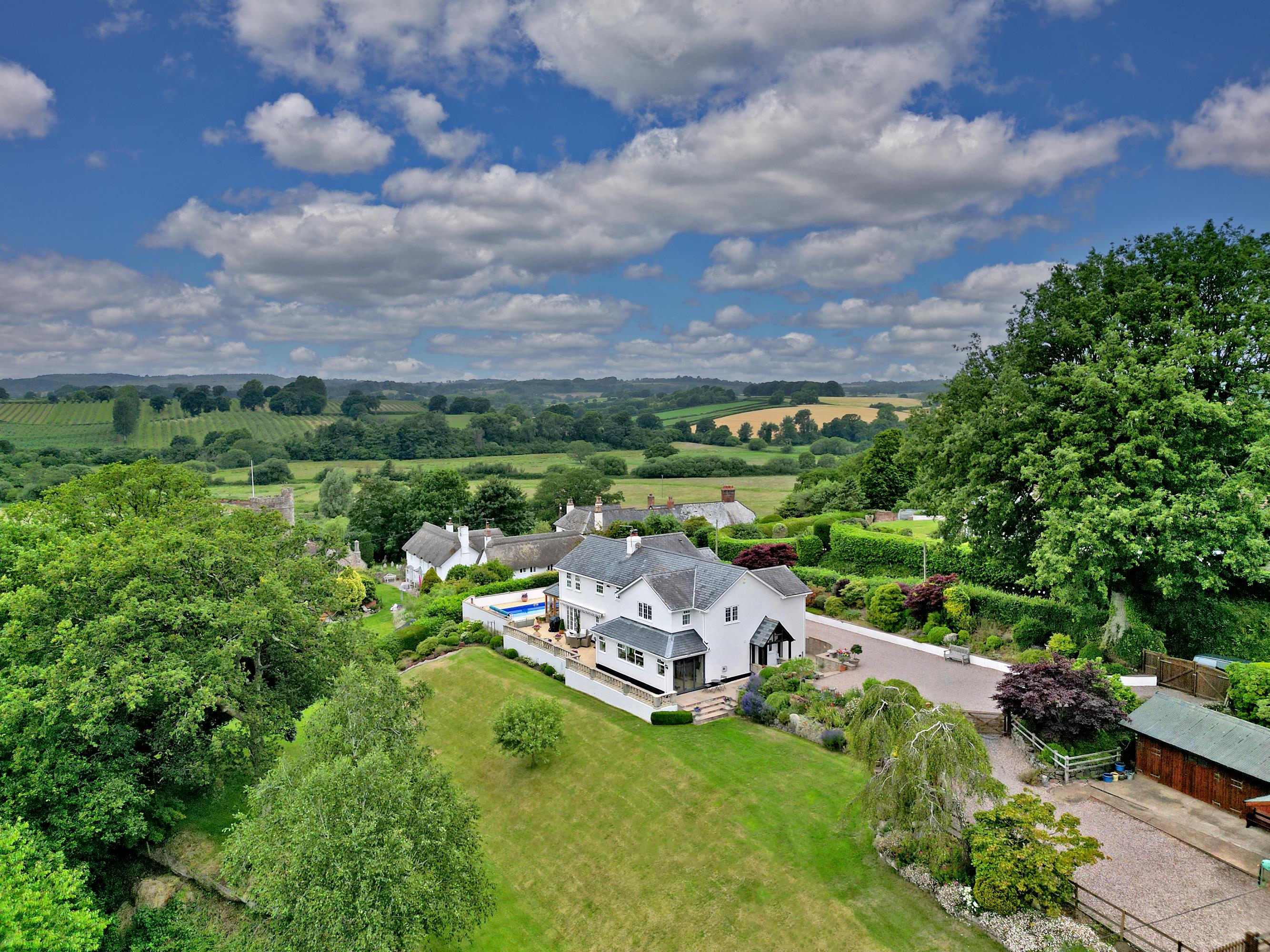 The property is surrounded by landscaped formal gardens, laid mainly to lawn and planted with a range of shrubs and mature borders. At the southern end of the house, accessed from the garden room, is a magnificent paved terrace with stunning views across the village and countryside beyond, together with a heated swimming pool powered by an air-source heat pump.