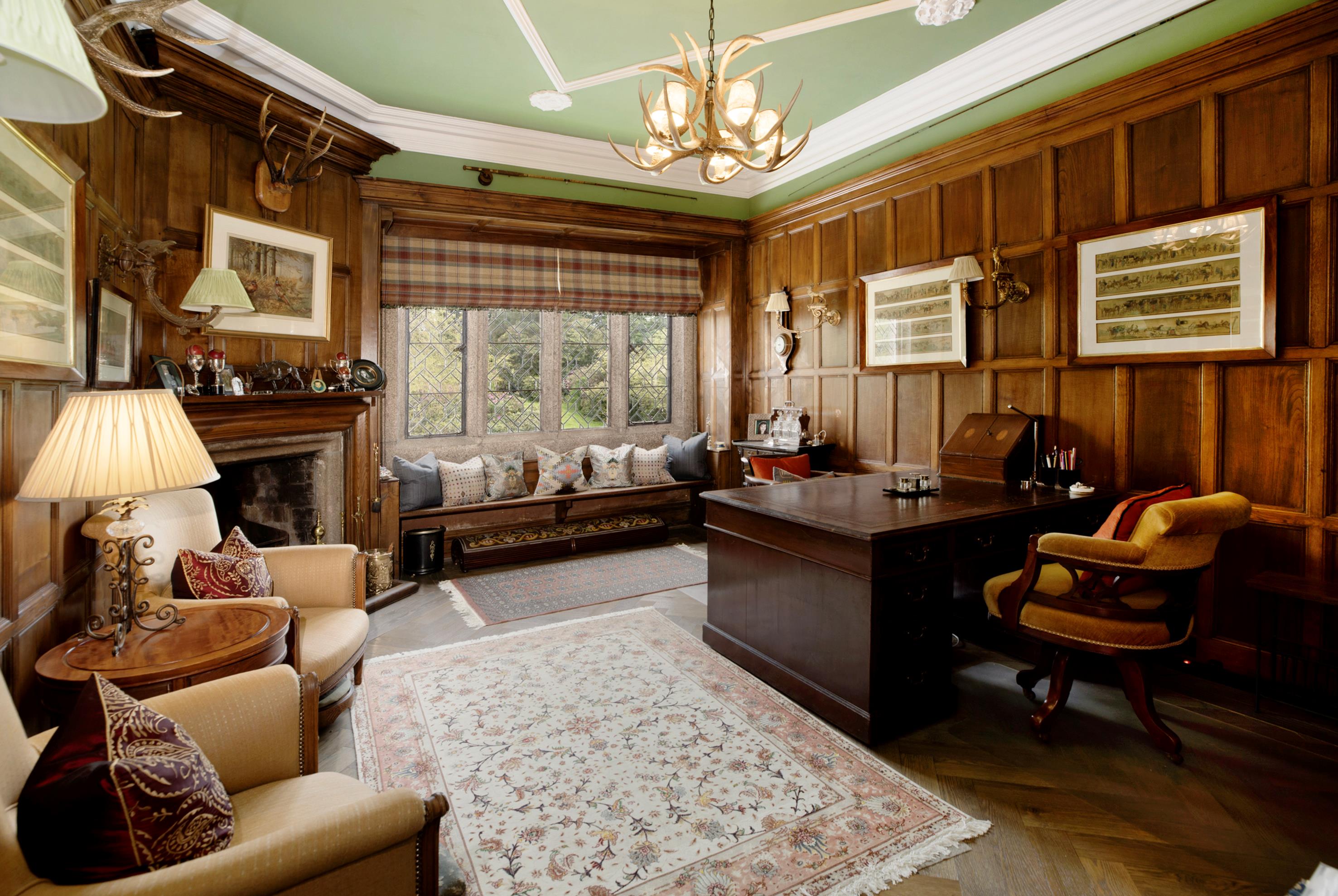 The entrance hall gives access to a generous reception hall with wood panelling and a detailed fireplace, providing a welcoming space for arrival and informal entertaining. From here, the principal rooms are reached. The drawing room offers far reaching views of the gardens and countryside and includes an elegant fireplace, cornicing and decorative plasterwork. The panelled dining room is ideal for formal gatherings and has a passage leading to a wine cellar.
