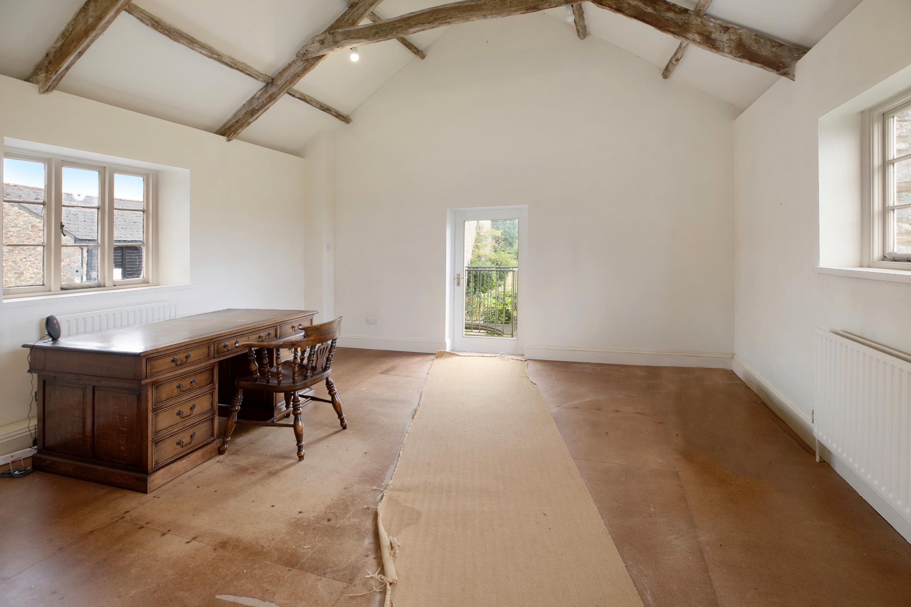 The house faces south and has spacious family accommodation with study, sitting room and dining room with large stone fireplace along the front, fitted kitchen and utility room to the rear. On the first floor are two bedrooms with 'Jack and Jill' en suite bathroom, one with balcony, and two further bedrooms and bathroom.