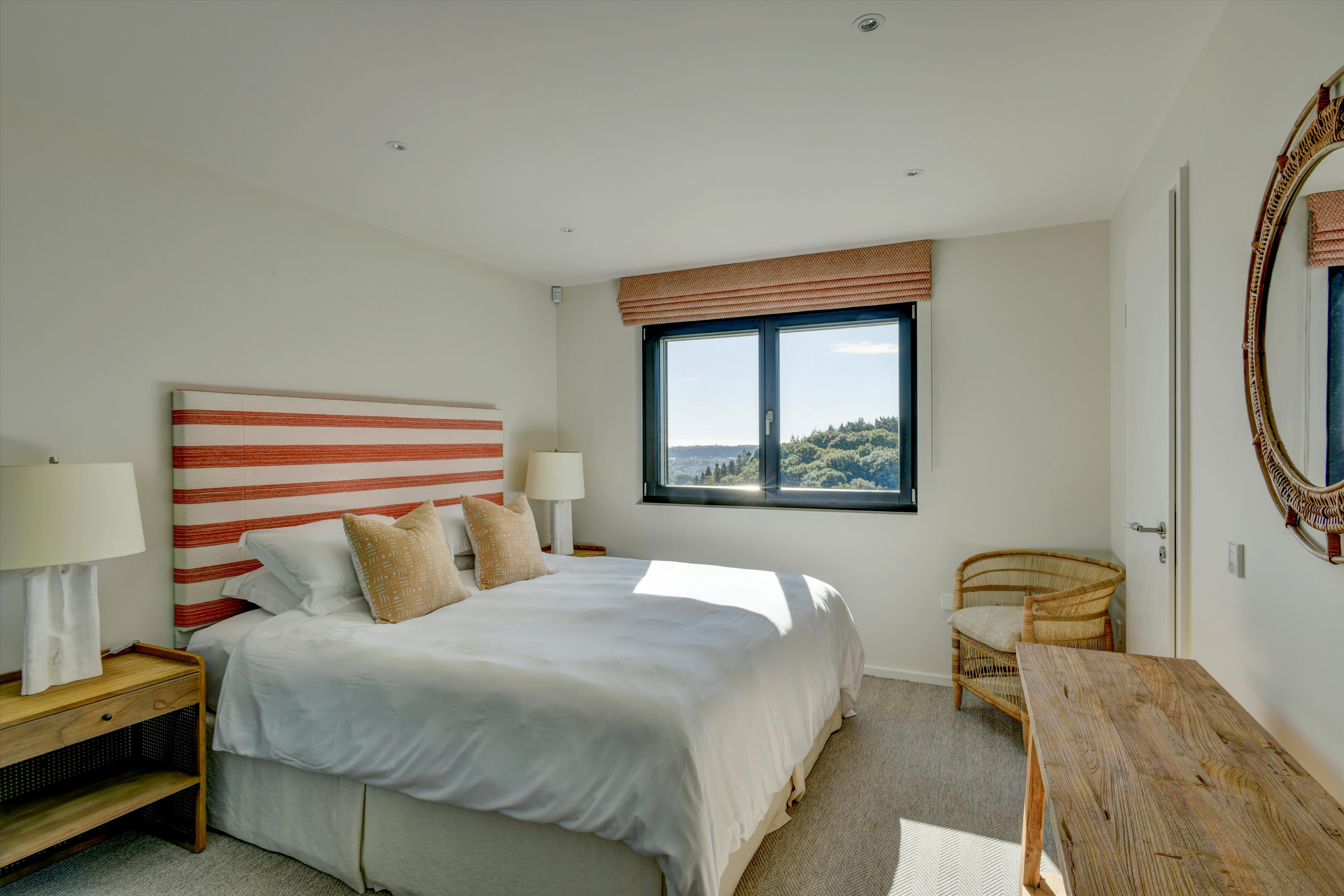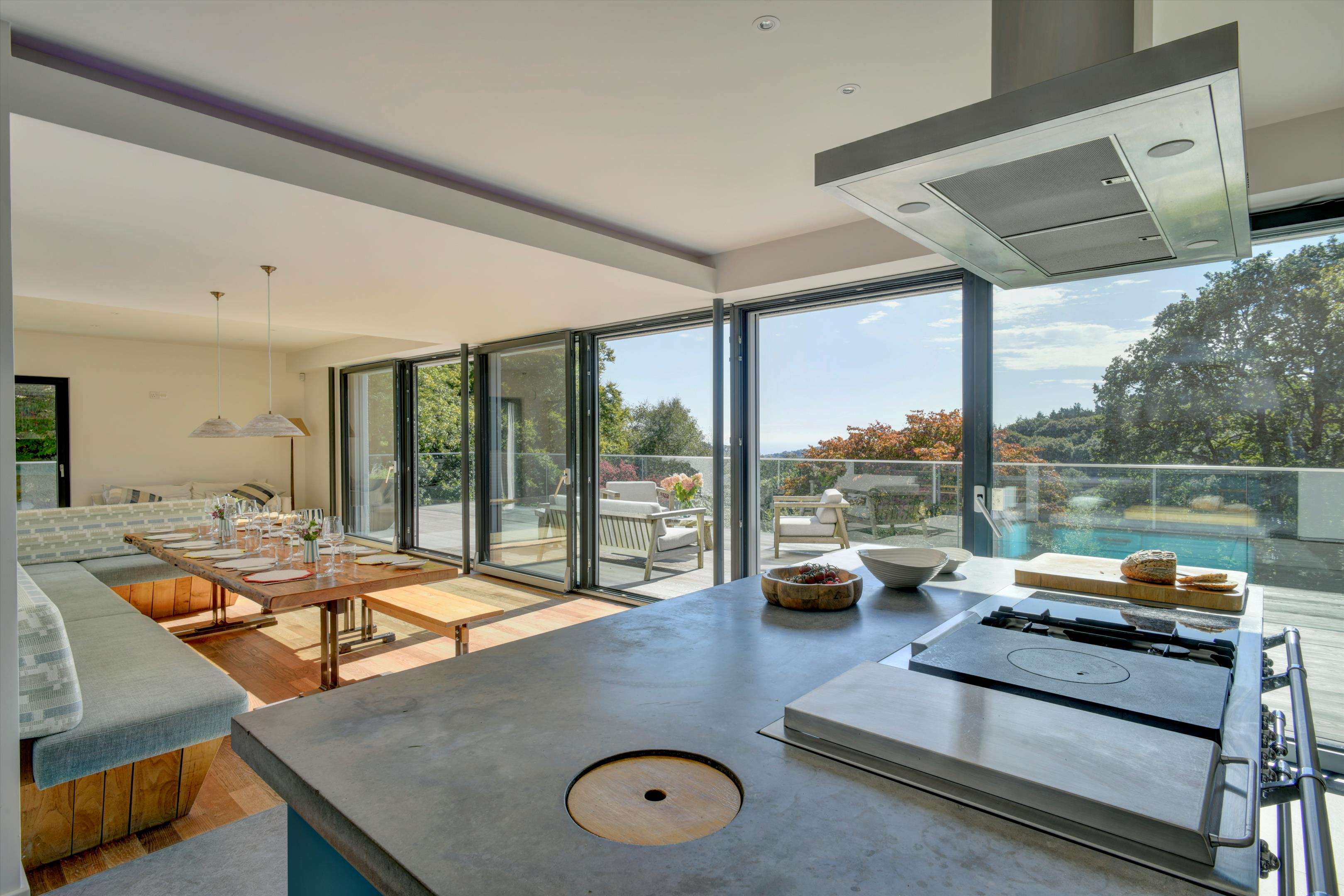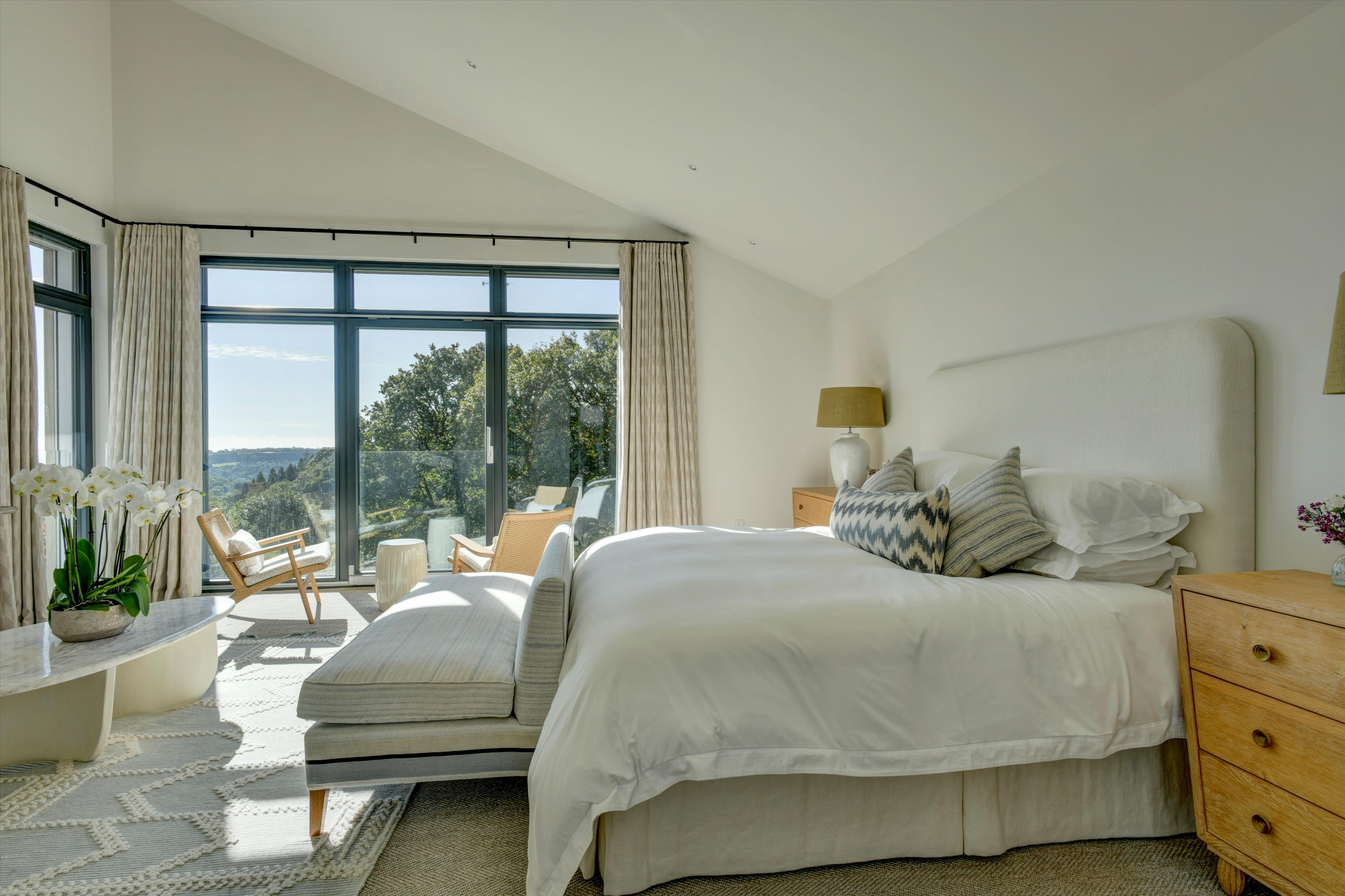Set within a large natural clearing near the top of the valley, the house delivers almost 5,000 sq ft of living space across three floors, all oriented to capture south-easterly light and expansive views. Floor-to-ceiling glazing floods the interiors with natural light, while pale décor, timber and stone flooring, and glass balustrades enhance the clean, modern aesthetic. Seven bedrooms, two principal reception rooms and a generous kitchen all enjoy stunning outlooks across the valley and towards the coast.