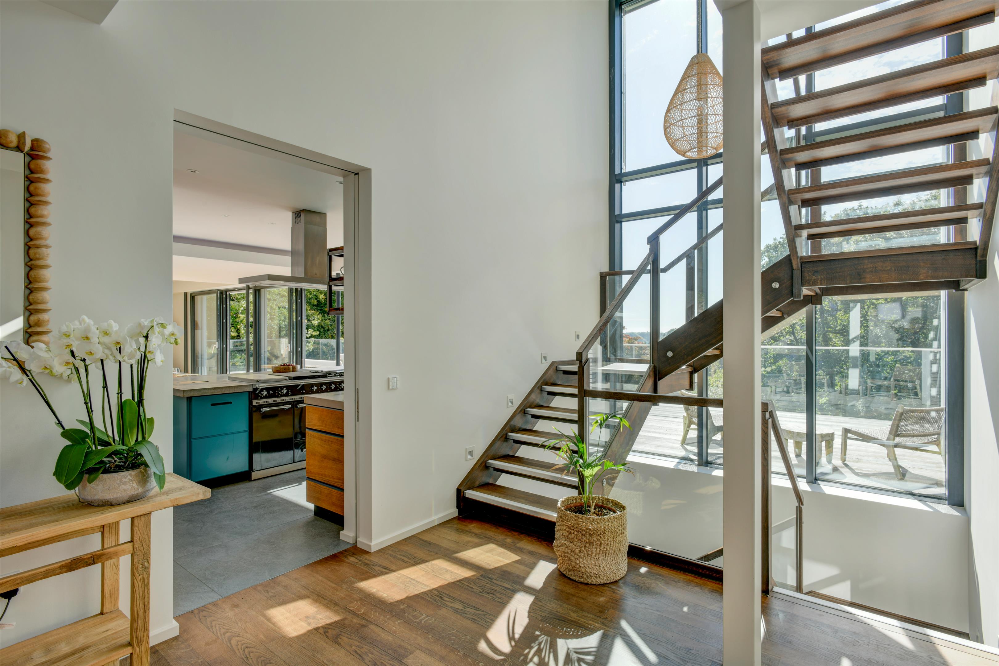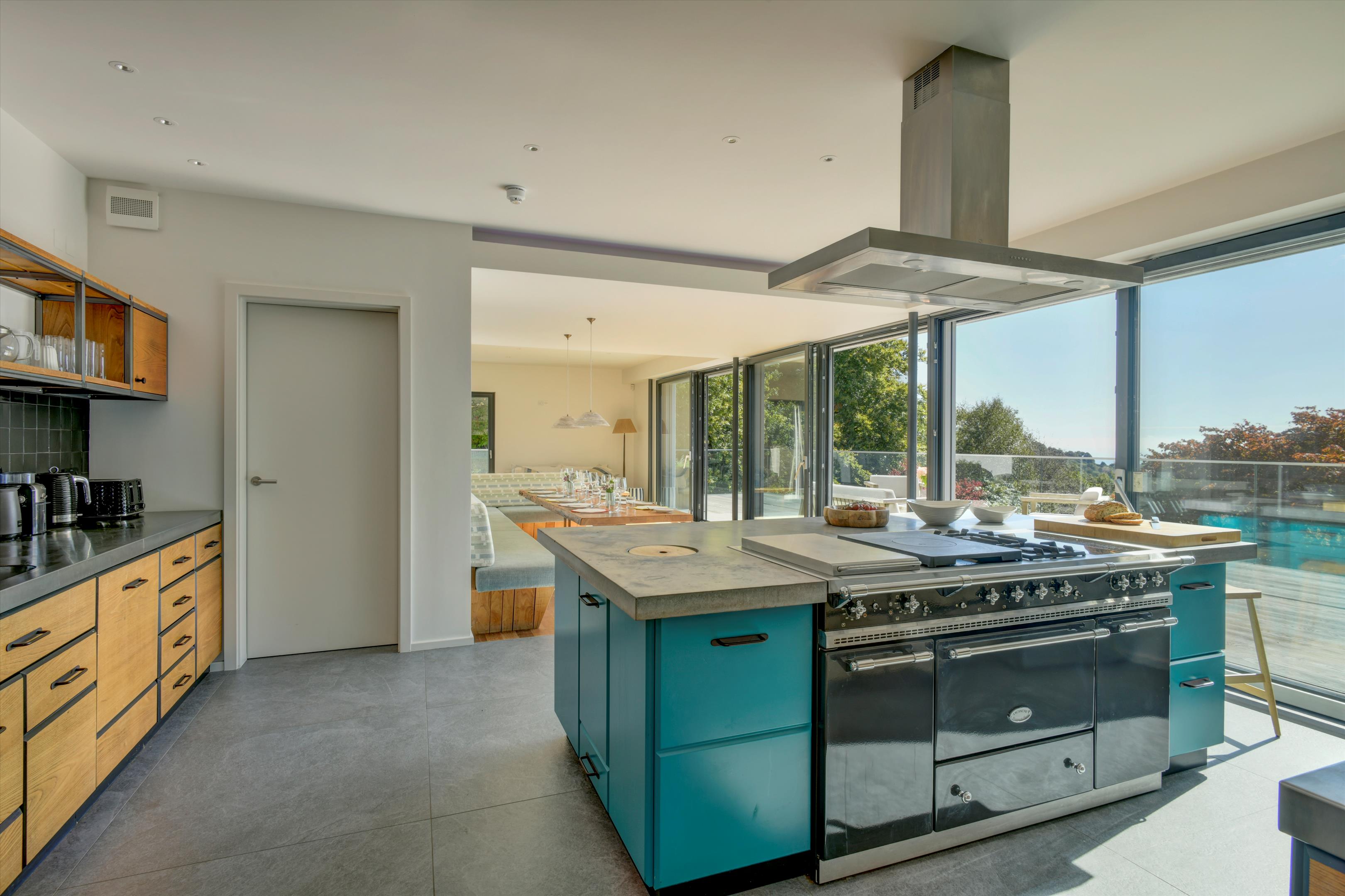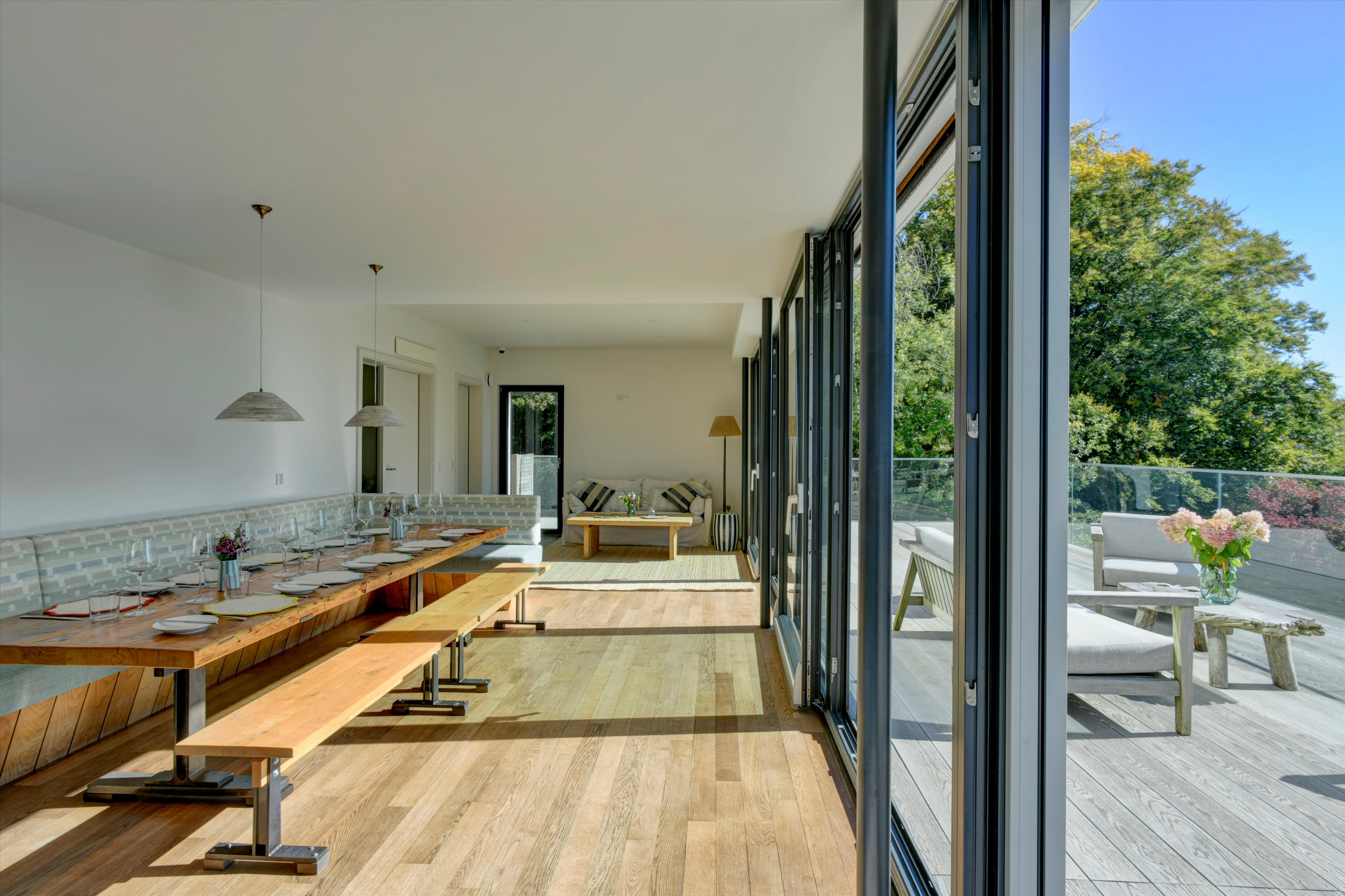 Set within a large natural clearing near the top of the valley, the house delivers almost 5,000 sq ft of living space across three floors, all oriented to capture south-easterly light and expansive views. Floor-to-ceiling glazing floods the interiors with natural light, while pale décor, timber and stone flooring, and glass balustrades enhance the clean, modern aesthetic. Seven bedrooms, two principal reception rooms and a generous kitchen all enjoy stunning outlooks across the valley and towards the coast.