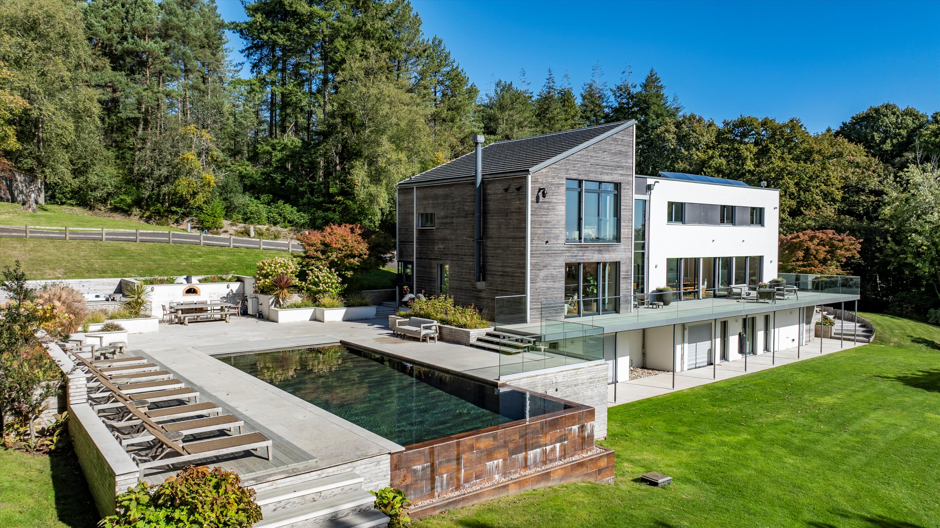 Approached via two driveways linking to Trinity Hill Road, Uplyme and Lyme Regis, the property sits in a wide, gently sloping clearing with sweeping lawns on three sides. An impressive infinity pool, hot tub and extensive west-facing terrace offer sheltered outdoor living, protected from prevailing winds by the surrounding woodland. A separate spur off the main drive leads to a discreet triple garage block.