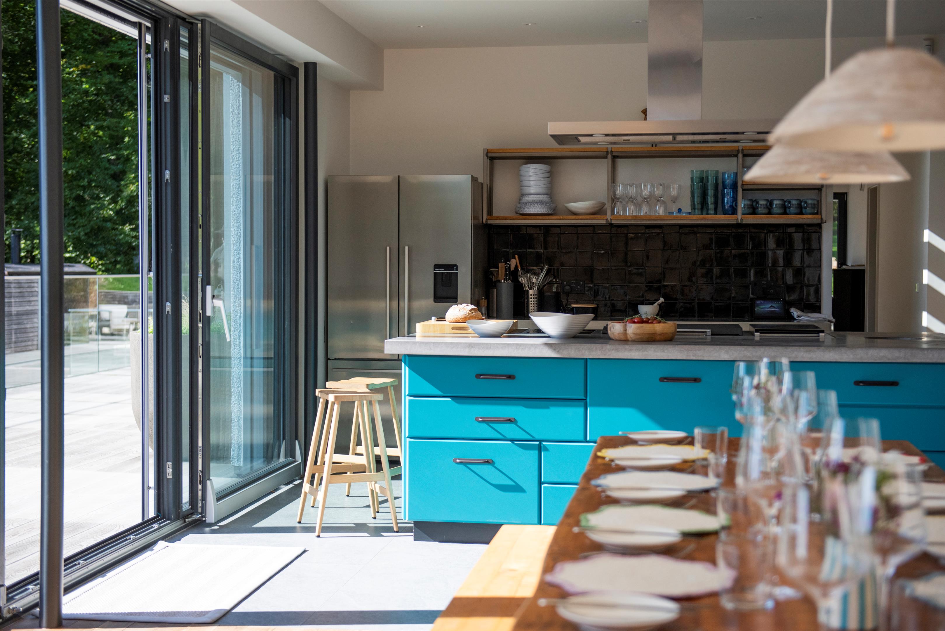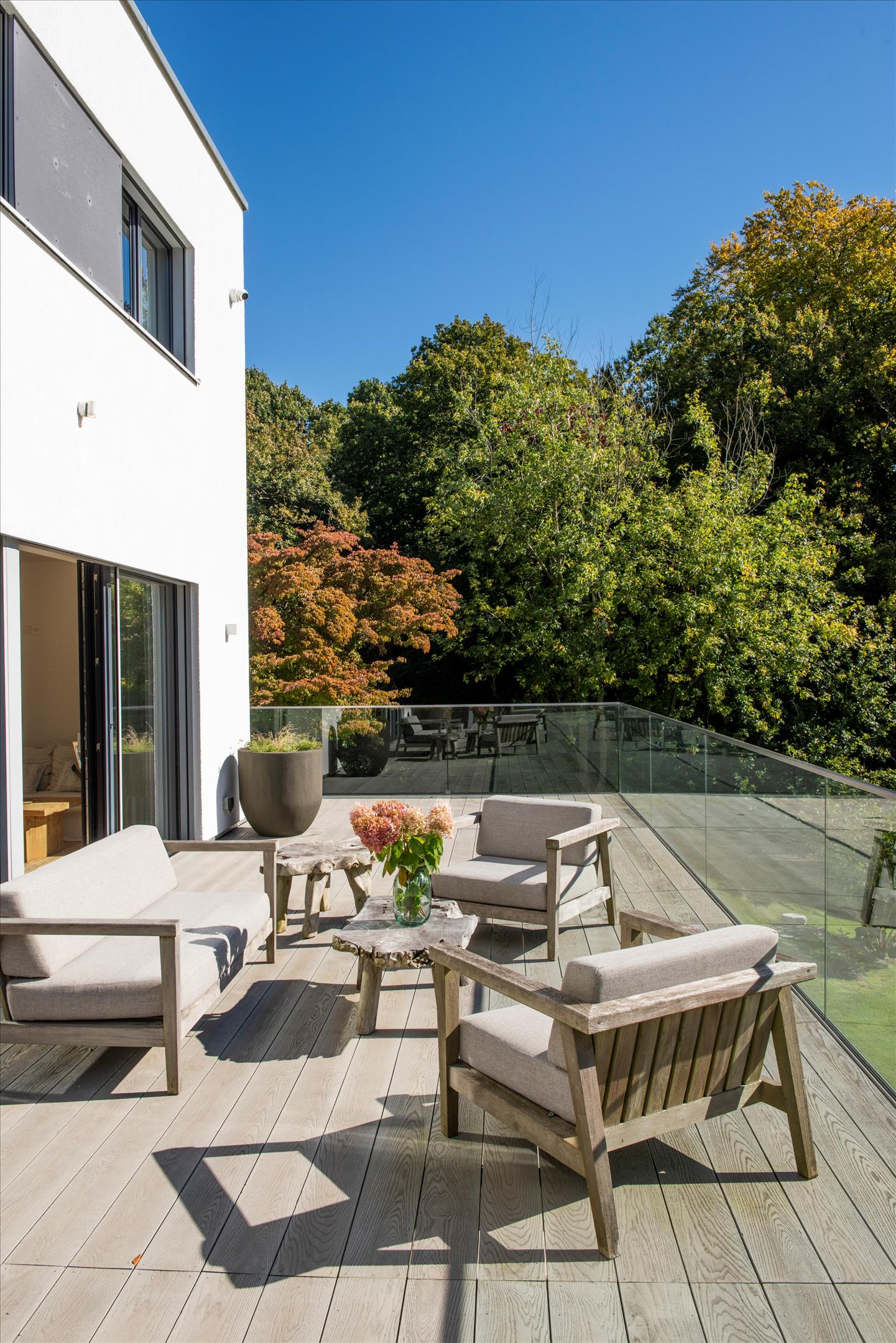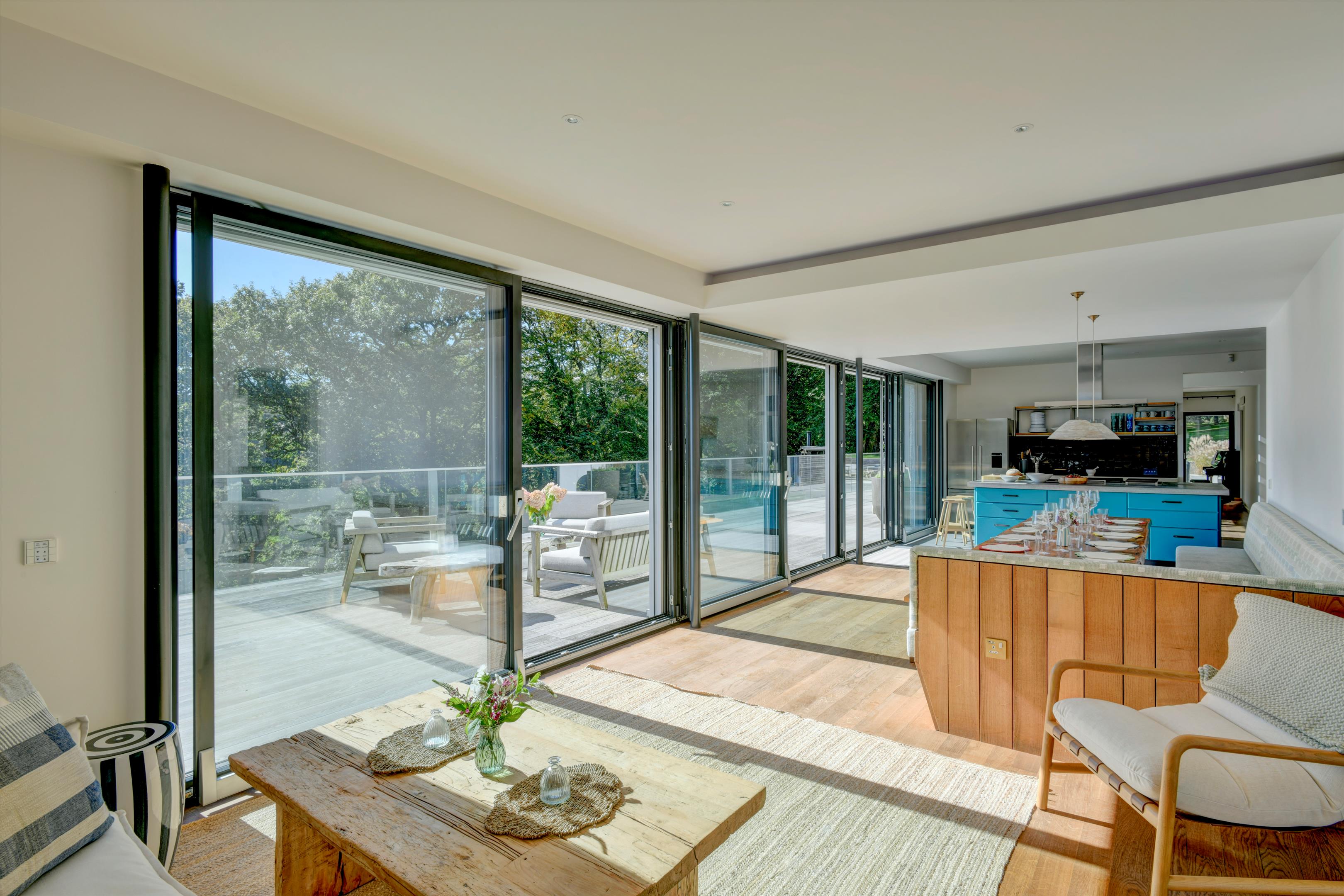 Set within a large natural clearing near the top of the valley, the house delivers almost 5,000 sq ft of living space across three floors, all oriented to capture south-easterly light and expansive views. Floor-to-ceiling glazing floods the interiors with natural light, while pale décor, timber and stone flooring, and glass balustrades enhance the clean, modern aesthetic. Seven bedrooms, two principal reception rooms and a generous kitchen all enjoy stunning outlooks across the valley and towards the coast.